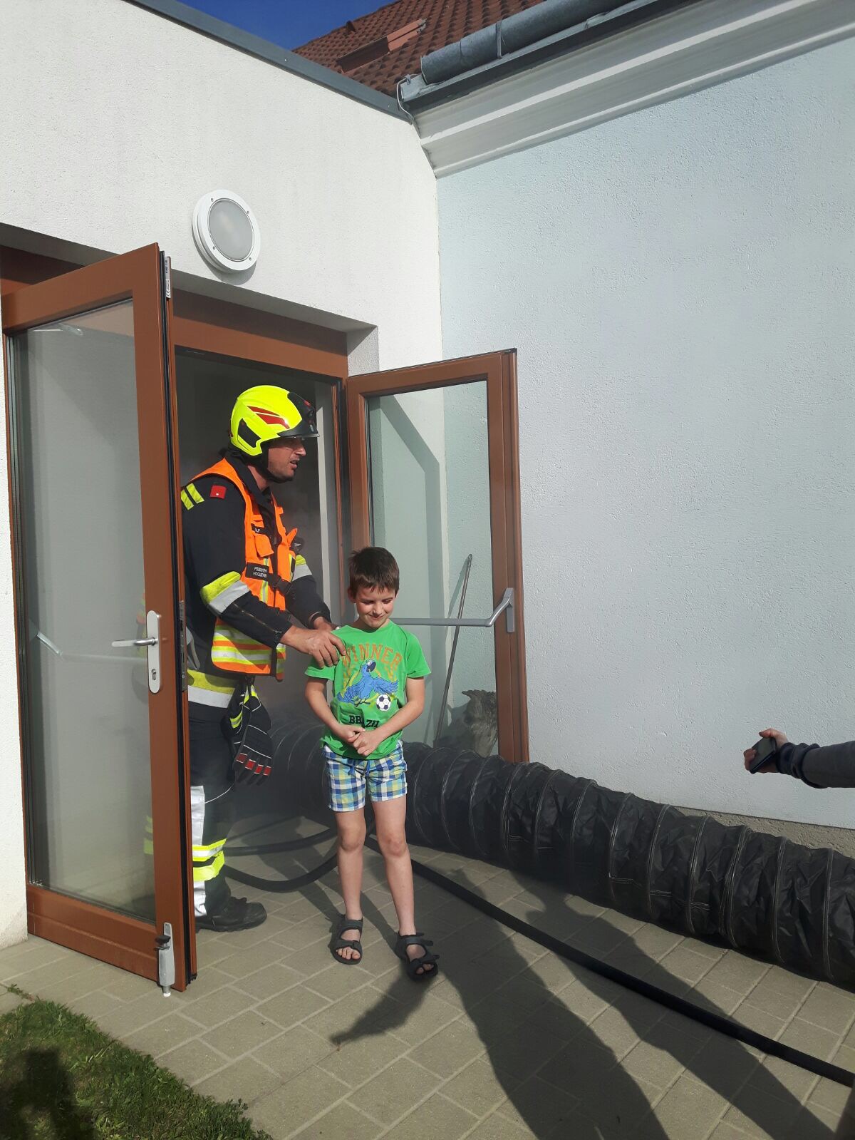 Sofort wurde der Befehl „Personensuche unter Atemschutz, mehrere vermisste Personen“ an die Einsatzmannschaft weitergeleitet. Unter Atemschutz betraten zwei Trupps das stark verrauchte Gebäude und begannen mit der Personensuche sowie der Brandbekämpfung mittels HD-Rohr. Parallel dazu wurden das Entlüftungsgerät und eine Löschleitung für den Außenangriff aufgebaut. Innerhalb kürzester Zeit konnten alle Kinder gefunden und in Sicherheit gebracht werden.