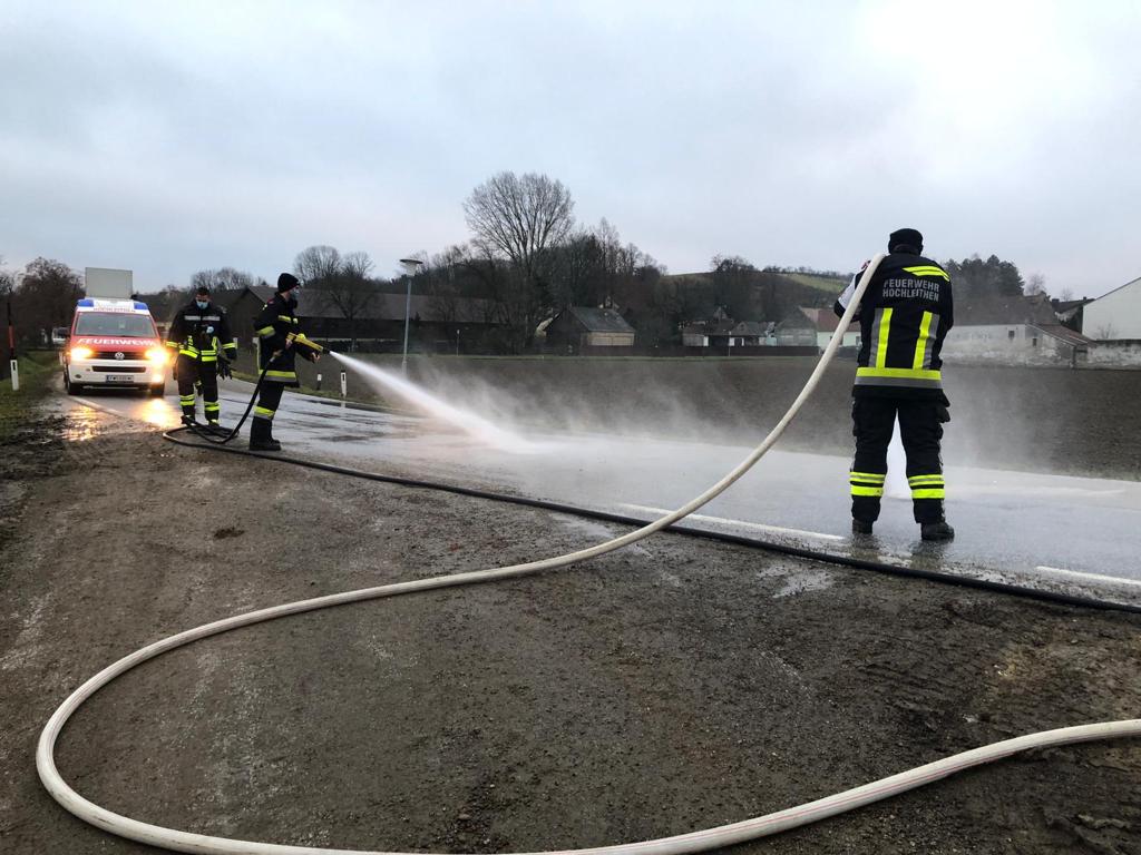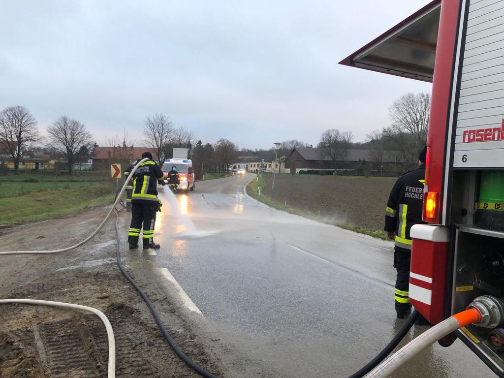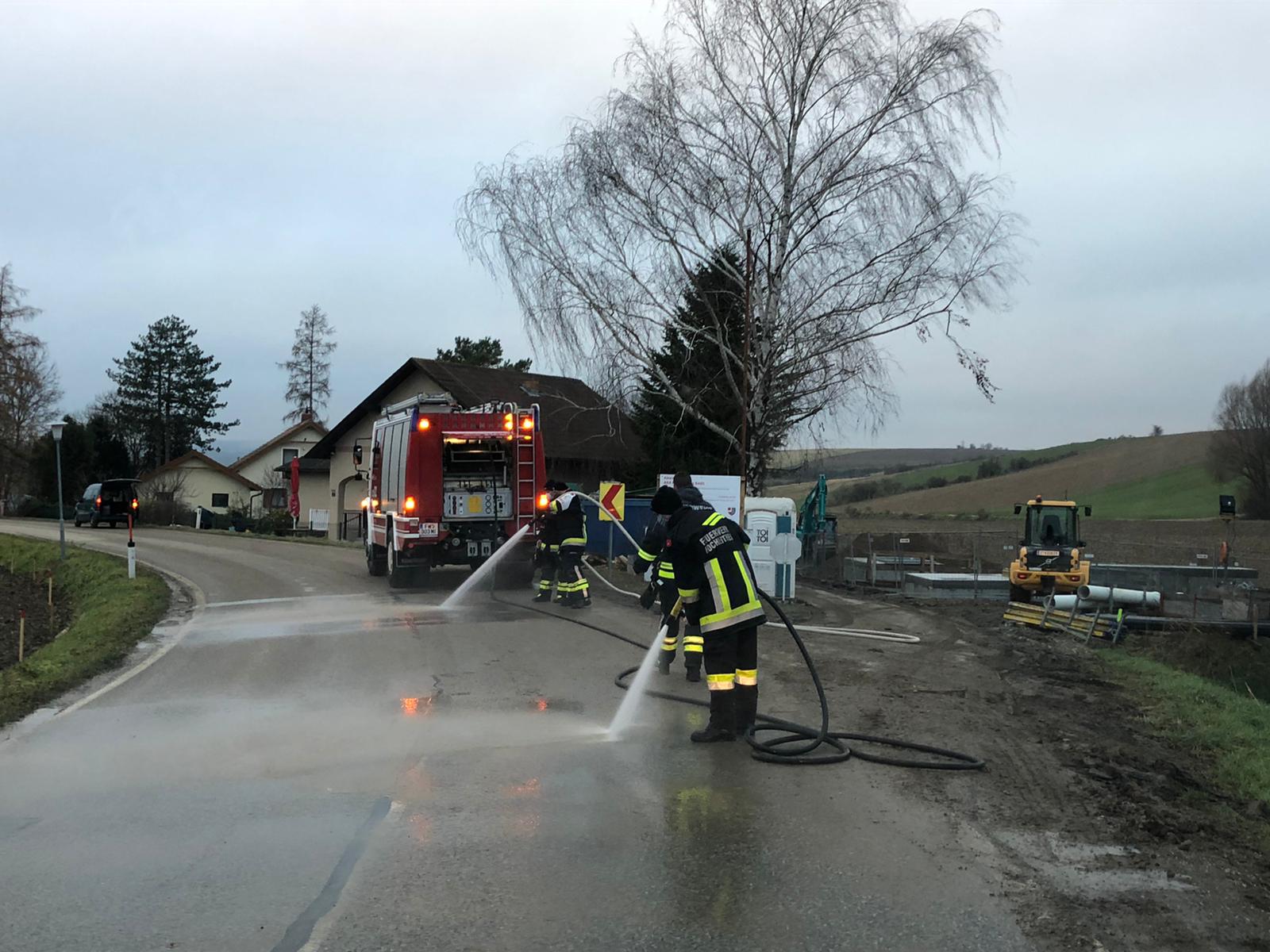 Freitagnachmittag wurden wir im Namen der Firma Swietelsky, aufgrund der durch die Witterung gegebenen Verhältnisse dazu beauftragt, die Fahrbahn von Verunreinigungen zu befreien. Innerhalb von rund eineinhalb Stunden konnte die Kurve am Ende von Traunfeld, in Richtung Unterolberndorf, gereinigt und wieder in einen sicheren Zustand versetzt werden.