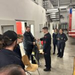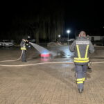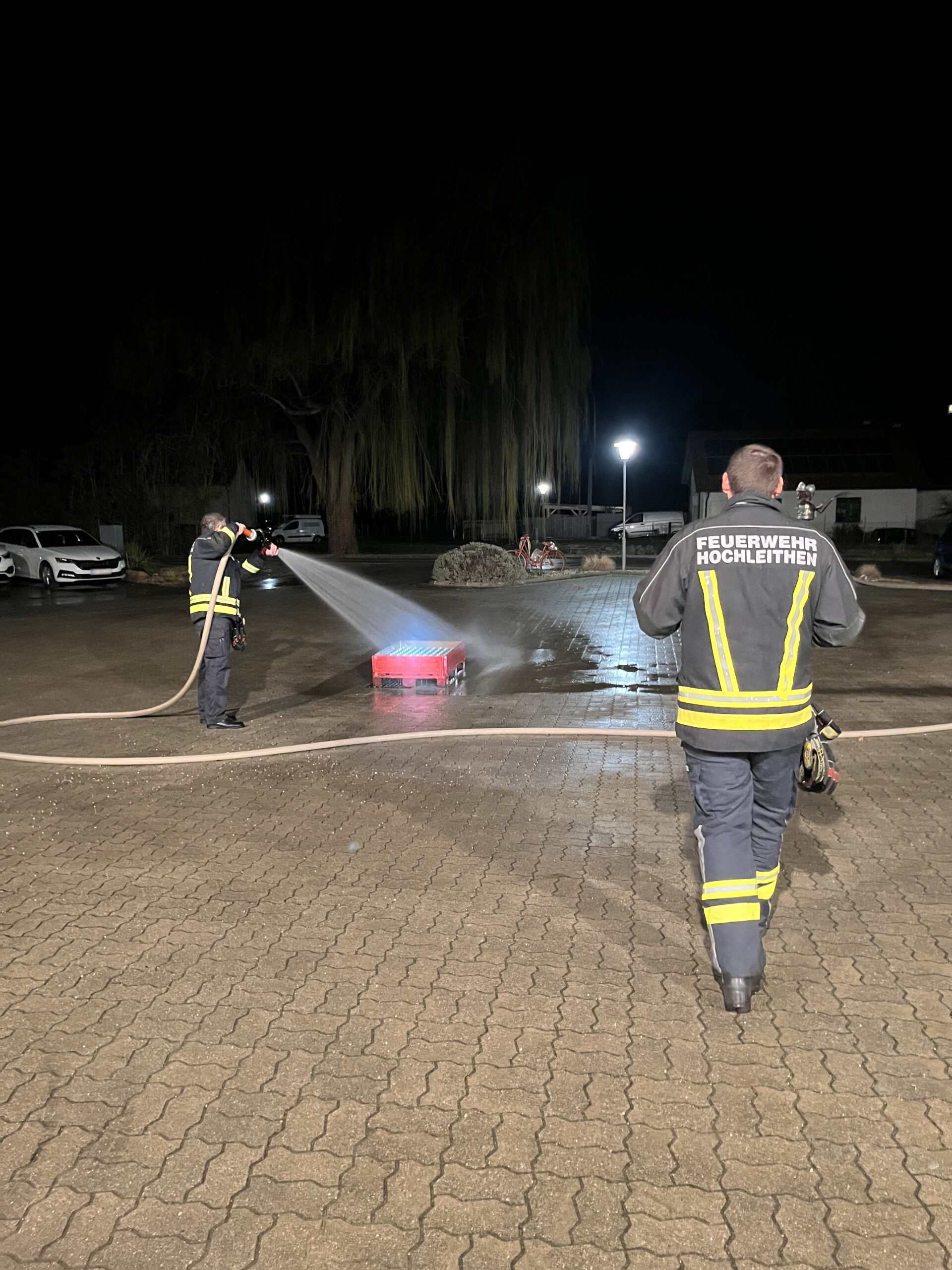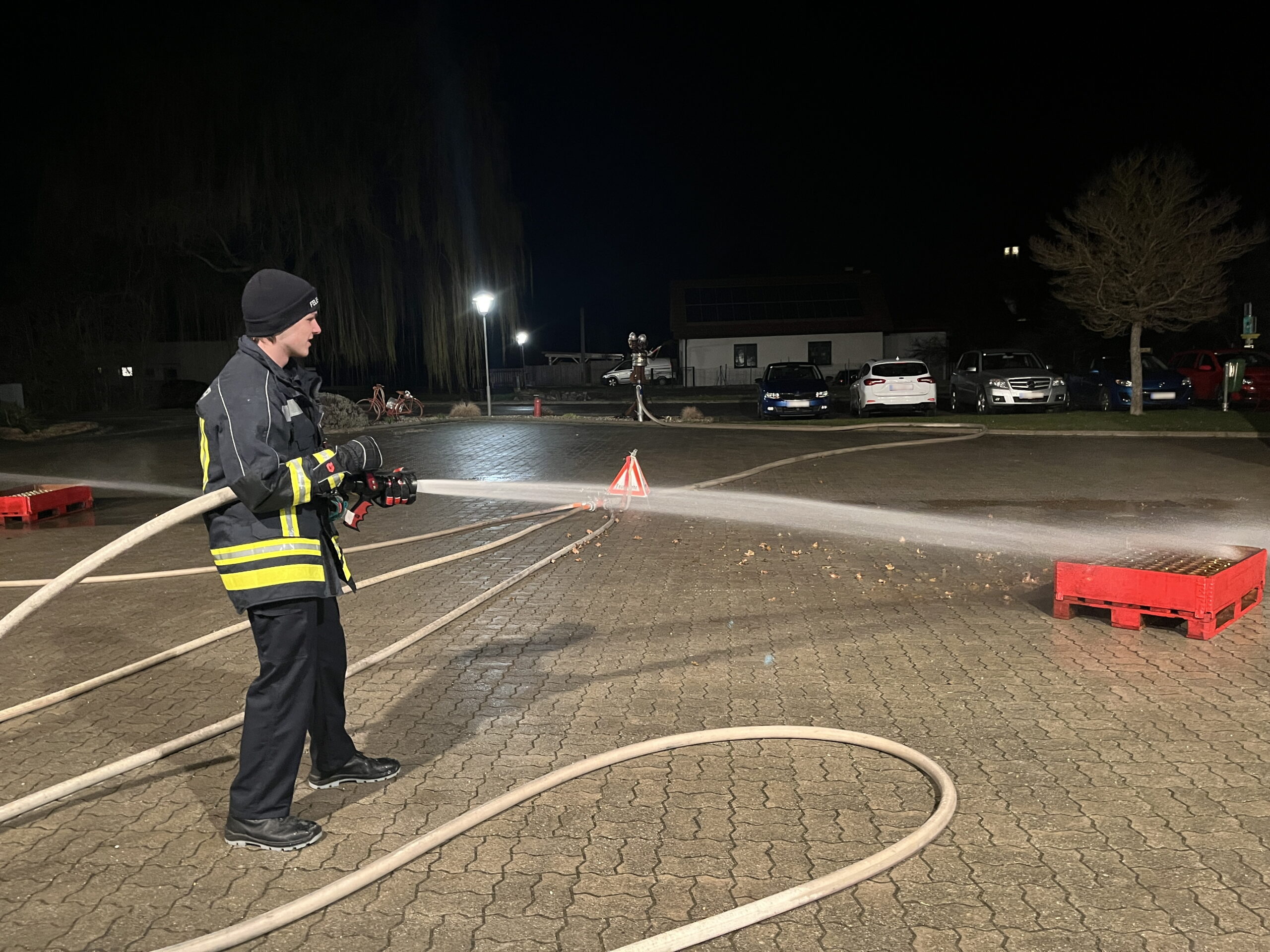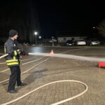 Die dritte Station hingegen fand vor dem Feuerwehrhaus statt und widmete sich unter der Führung von OBI Stefan Ausfelder dem gezielten Einsatz von Hohlstrahlrohren. Dabei wurde ein fiktiver Brand einer Holzpalette inszeniert, den es zu löschen galt. Durch auf der Palette angebrachte offene Dosen sollte so nach einem vorgegebenen Löschzeitraum aufgezeigt werden, wie effektiv die Löschmaßnahmen bei der simulierten Brandstelle waren oder welche Stellen vielleicht nicht ausreichend getroffen wurden.
