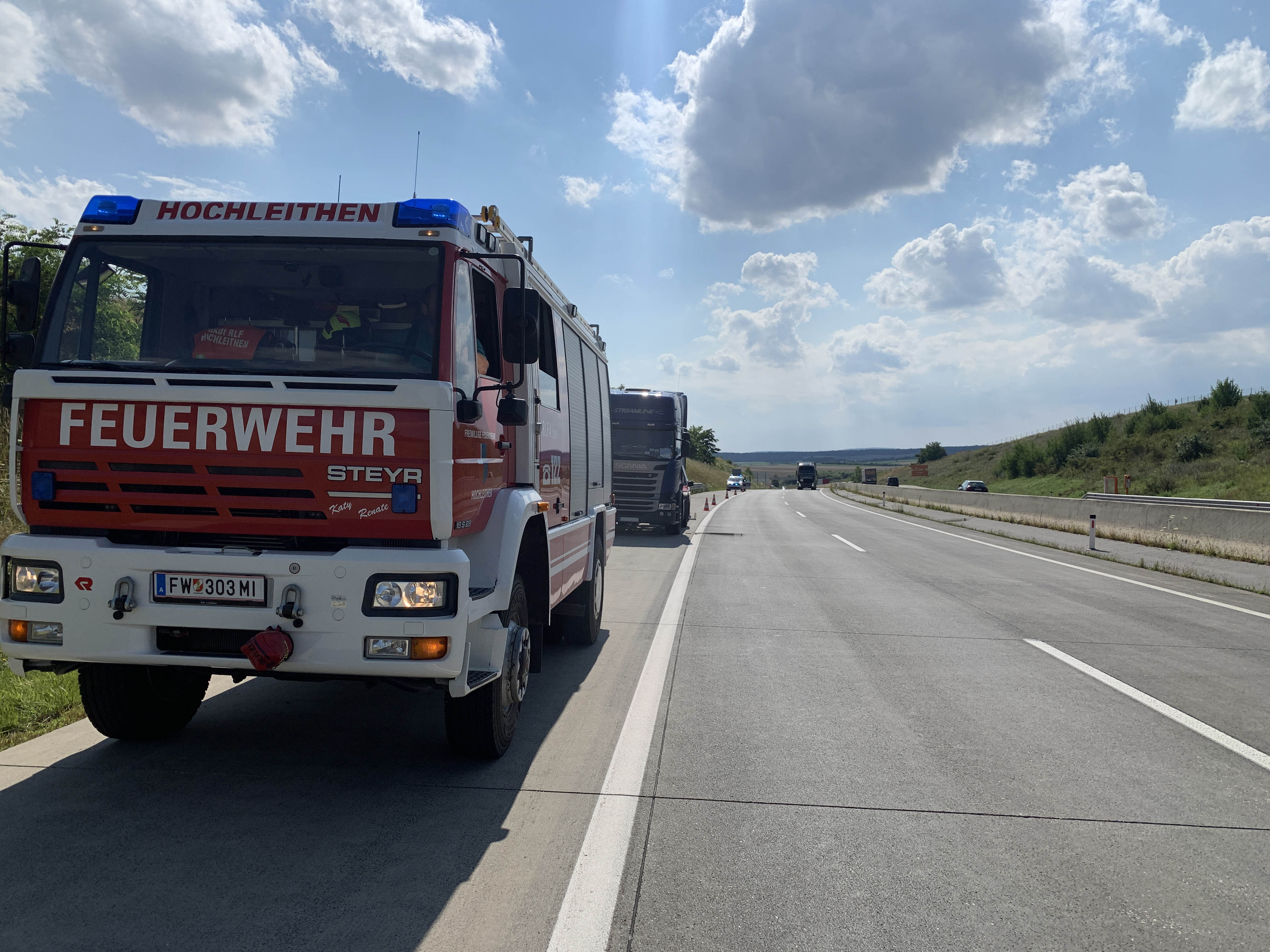 Heute Nachmittag wurden wir mittels Sirene und Funkmeldeempfänger zu einem Fahrzeugbrand auf die Autobahn alarmiert. Innerhalb kürzester Zeit rückten Vorausfahrzeug, Rüstlöschfahrzeug und Tanklöschfahrzeug auf die Autobahn in Fahrtrichtung Brünn aus.