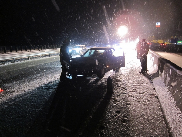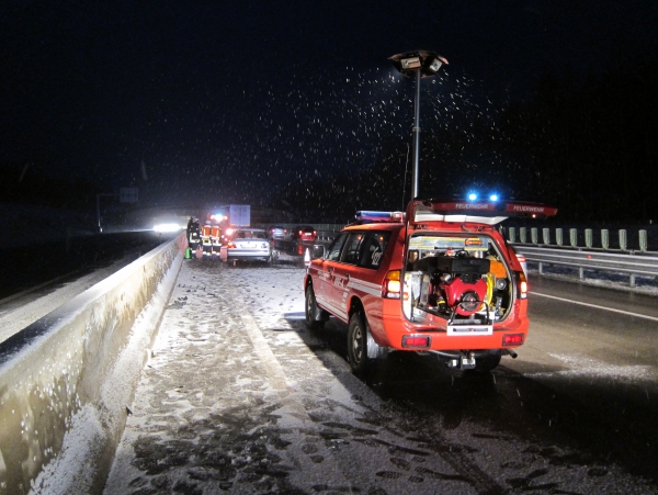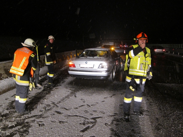 Eine Fahrzeuglenkerin war mit ihrem PKW aufgrund der winterlichen Verhältnisse an die Leitschiene gekracht und wurde zurück auf die Fahrbahn geschleudert, wo sie in weiterer Folge mit ihrem PKW die Betonleitwand touchierte und am linken Fahrstreifen zum Stillstand kam. Die Lenkerin, die alleine im Fahrzeug war, wurde zum Glück nicht verletzt.