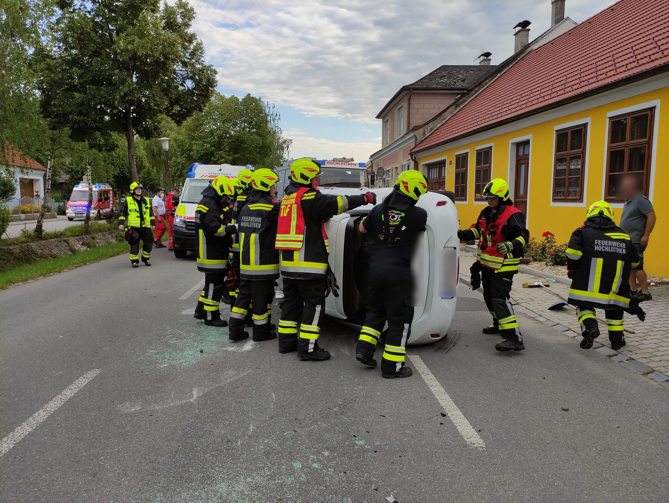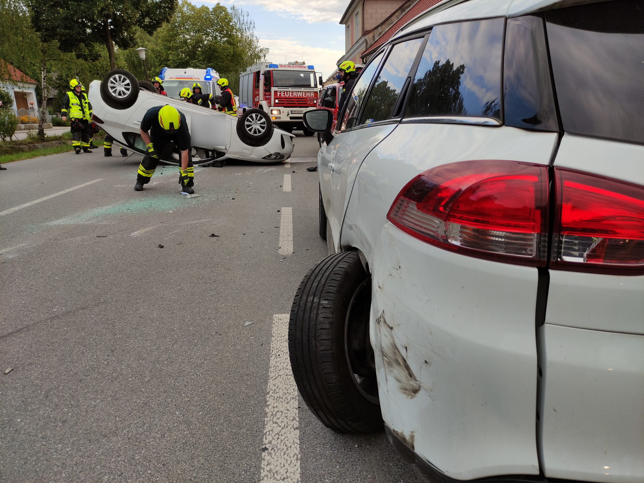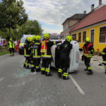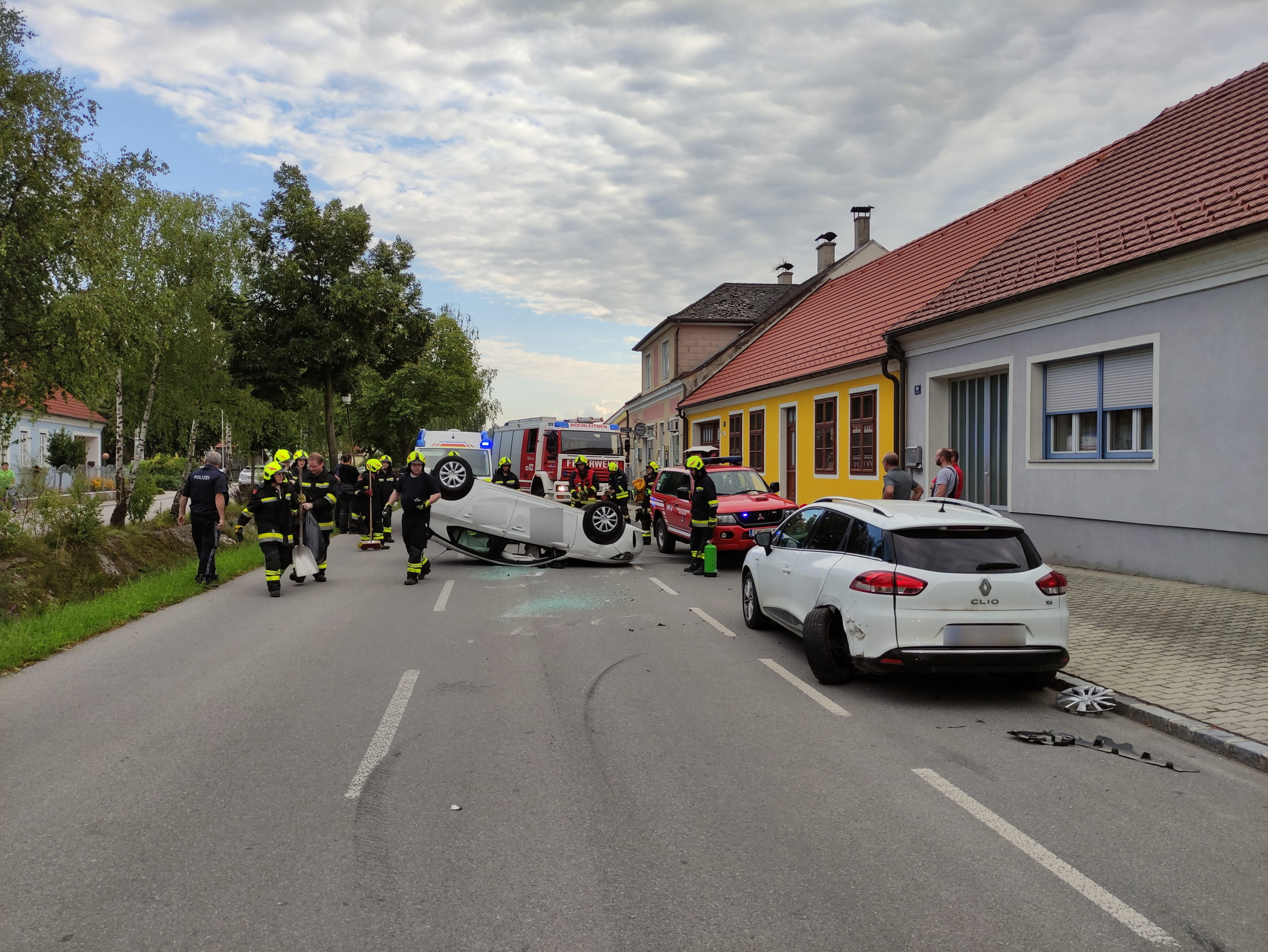 Da die Polizei bei unserem Eintreffen bereits vor Ort war, unterstützten wir diese bei der Sperrung der Einsatzstelle. Die verletzte Fahrzeuglenkerin wurde durch Ersthelfer, Rettungssanitäter und Notarzt erstversorgt und daraufhin in das Landesklinikum Mistelbach-Gänserndorf transportiert. Der auf dem Dach liegende PKW wurde durch die Feuerwehr für die Sicherstellung wieder aufgerichtet und mittels Abschleppachse gesichert abgestellt. Schlussendlich säuberten wir die verunreinigte Fahrbahn mithilfe von Ölbindemittel.