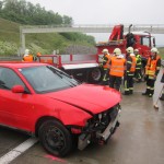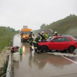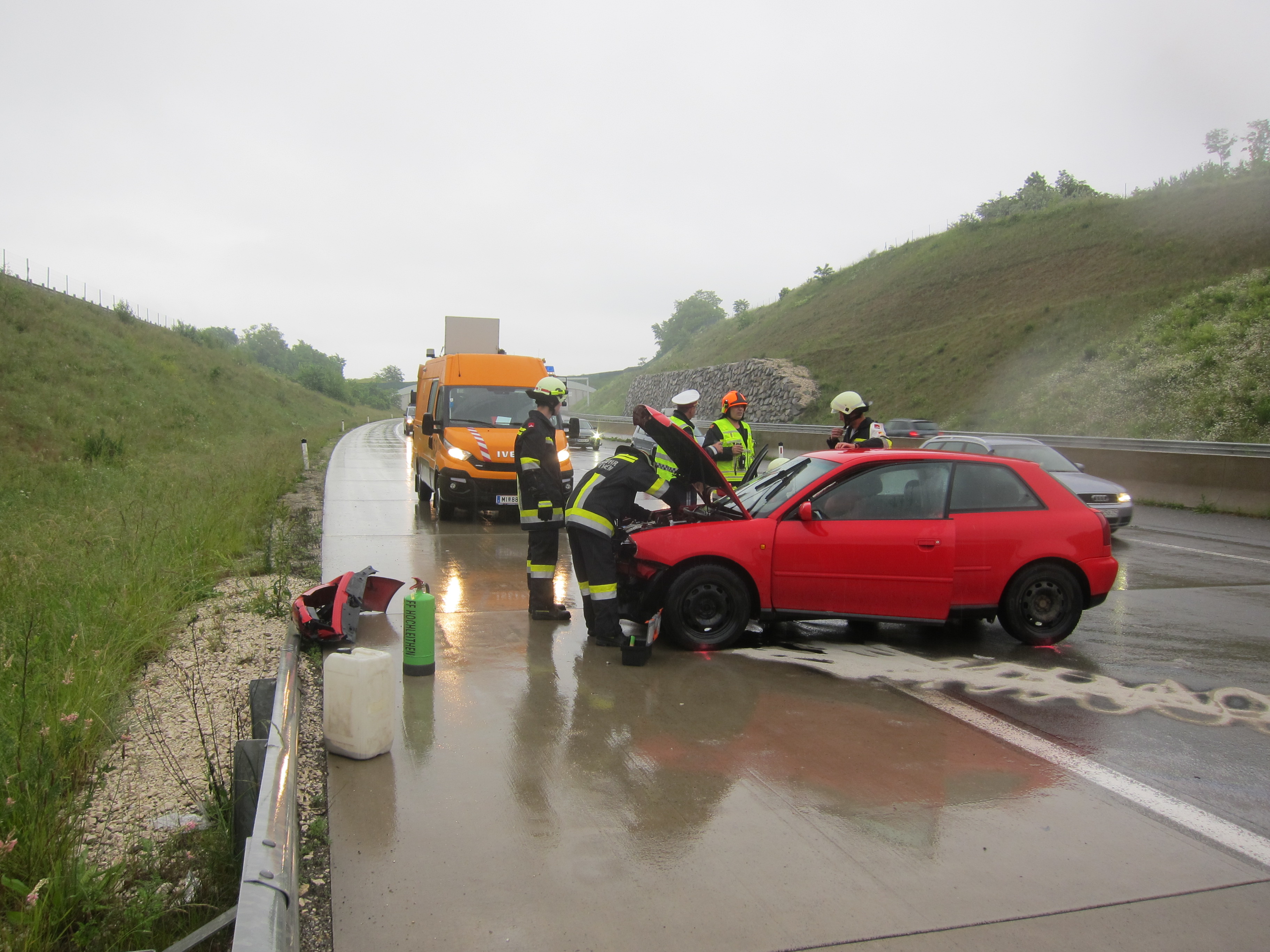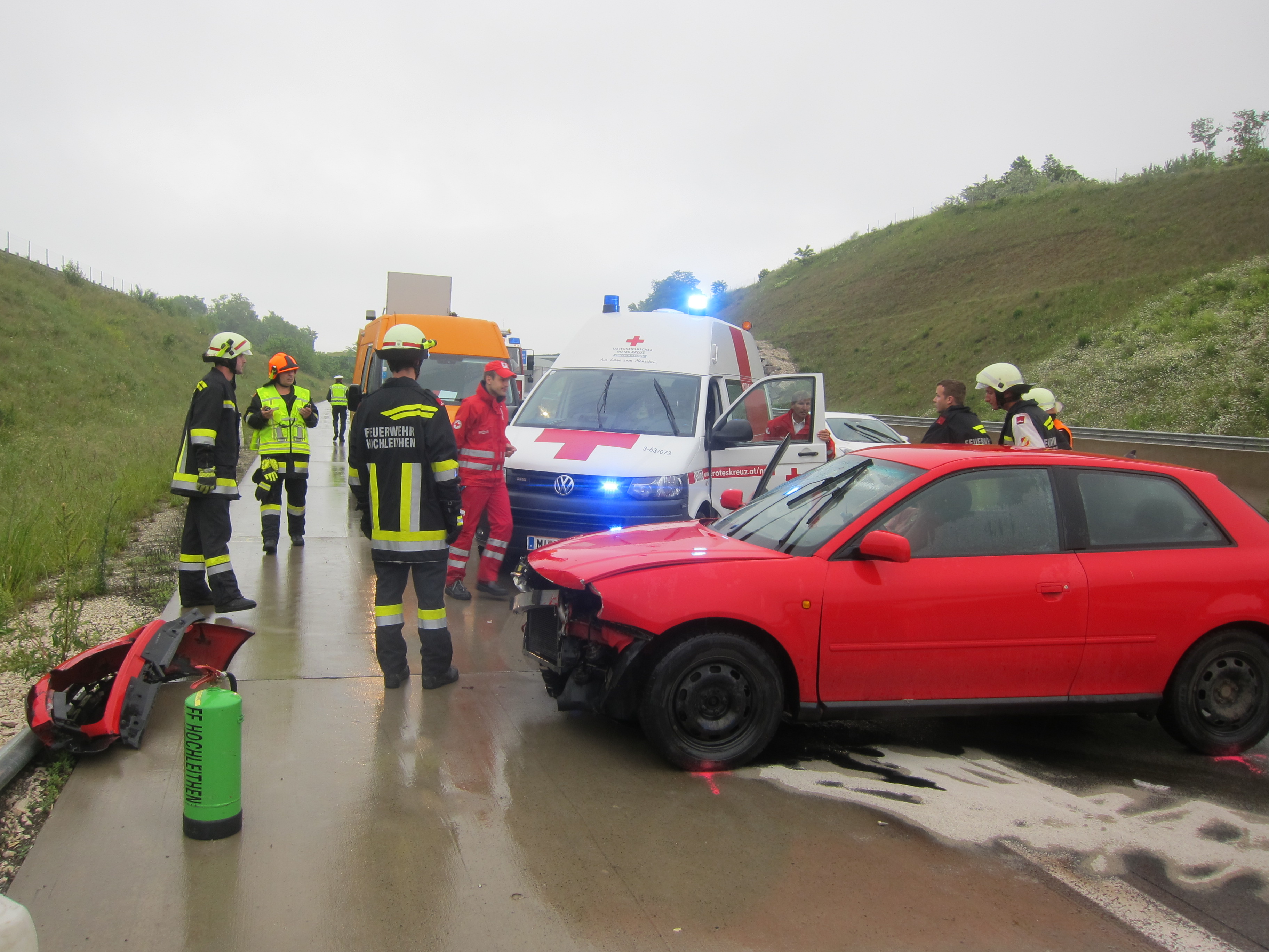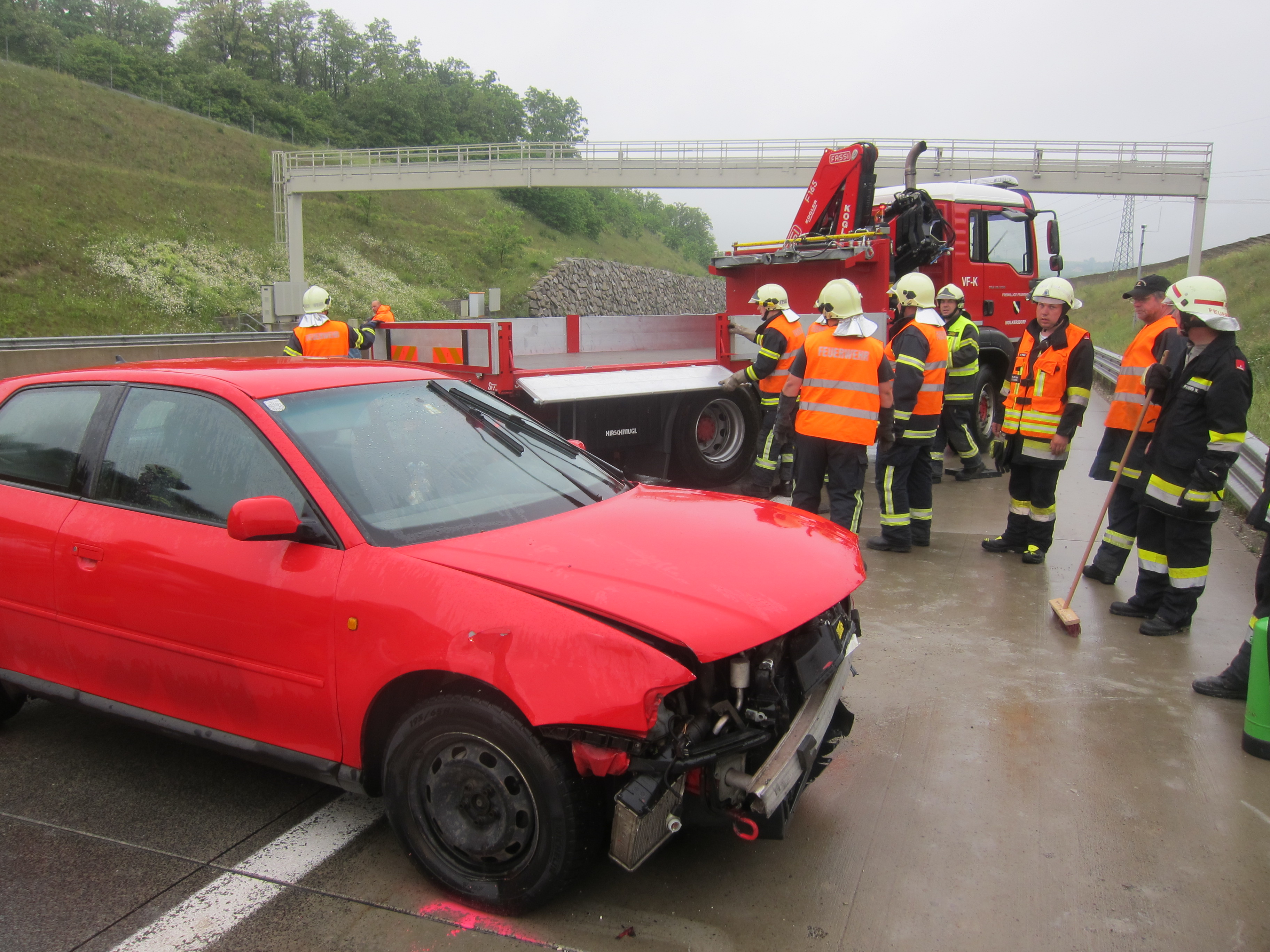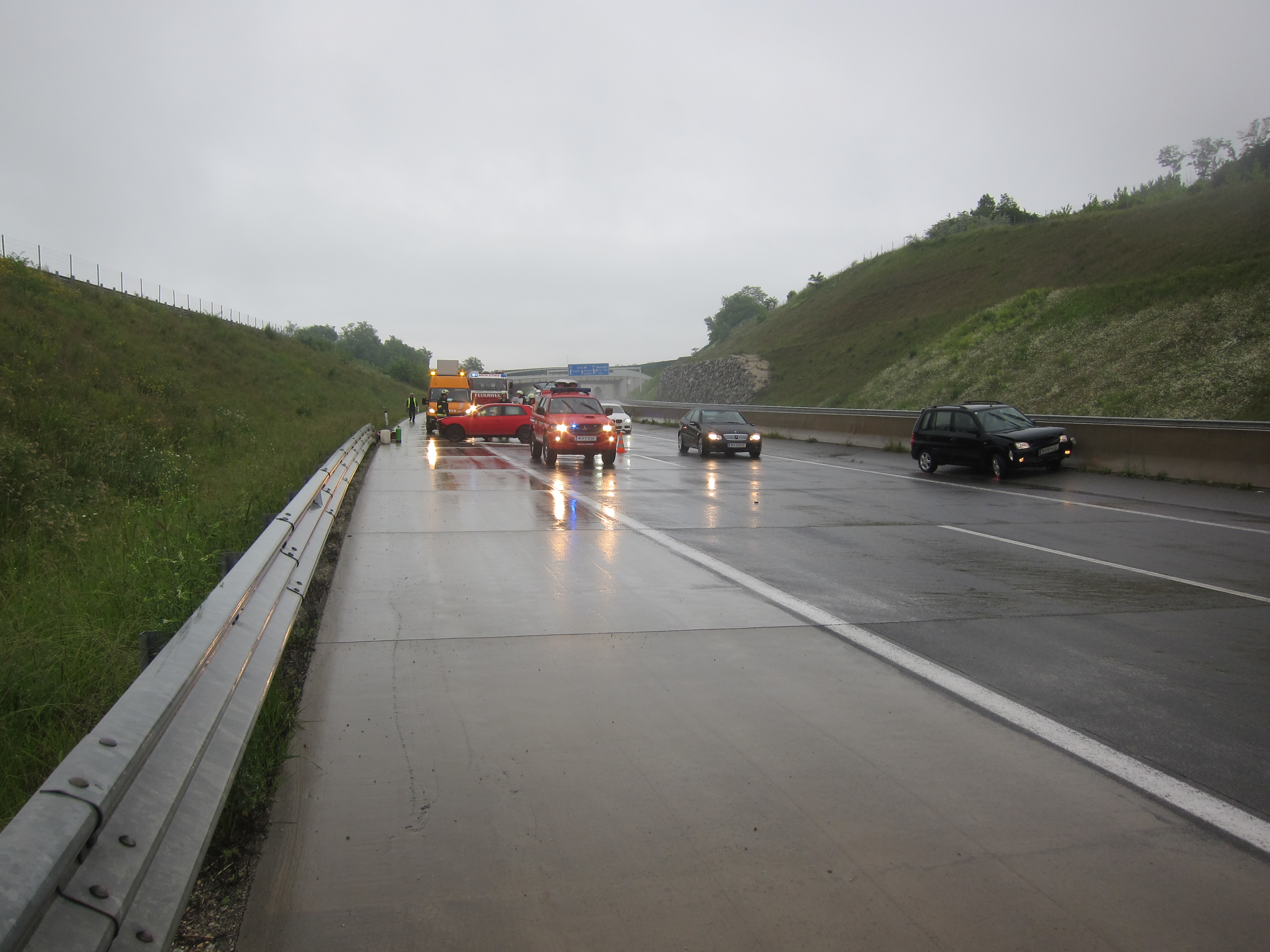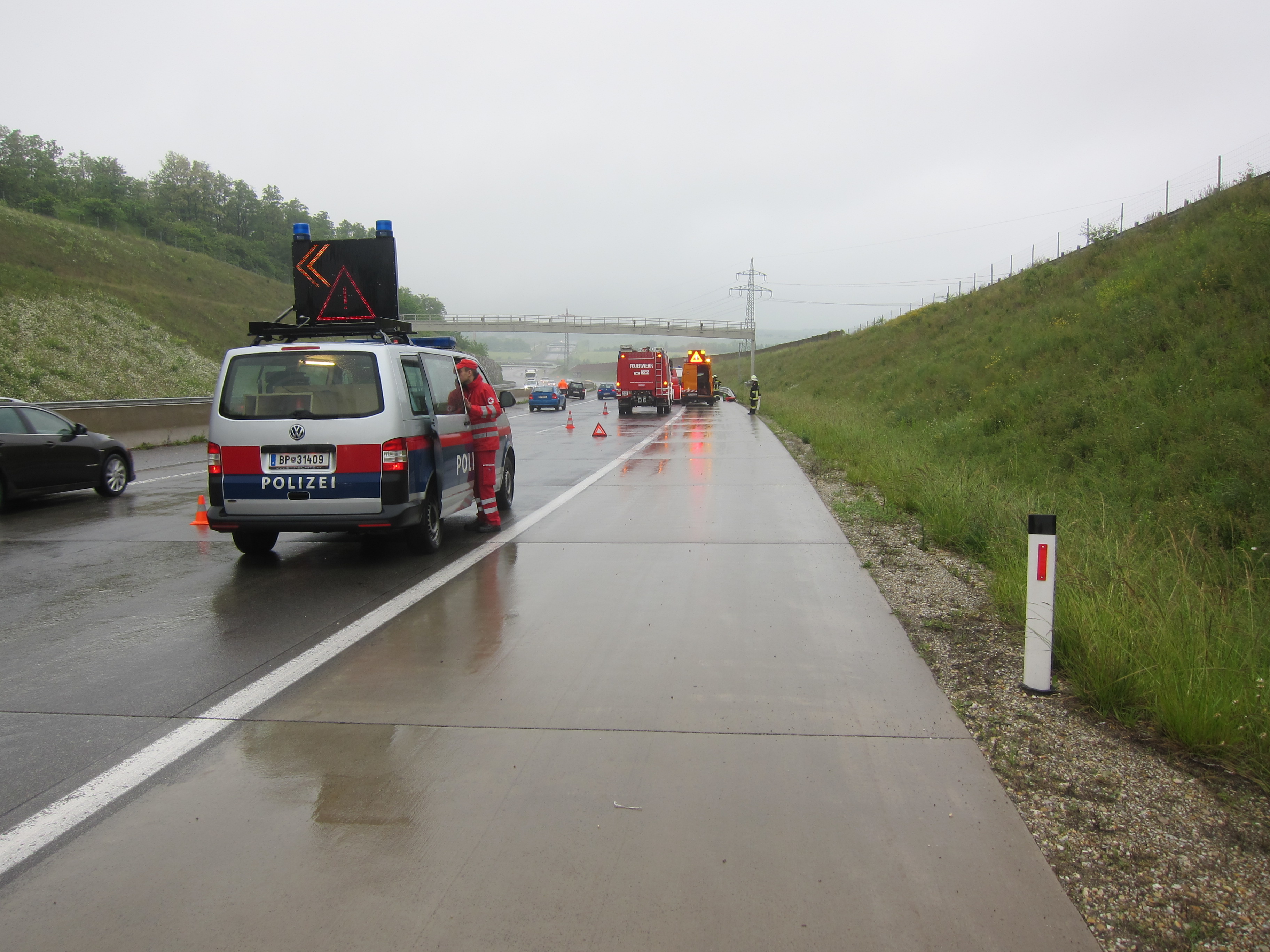 Aus ungeklärter Ursache stießen zwei PKW‘s auf der A5 Rifb Wien zusammen und blieben schwer beschädigt auf der Fahrbahn stehen. Eine Person  wurde dabei verletzt, die bis zum Eintreffen der Rettung von der Feuerwehr Hochleithen erstversorgt wurde.