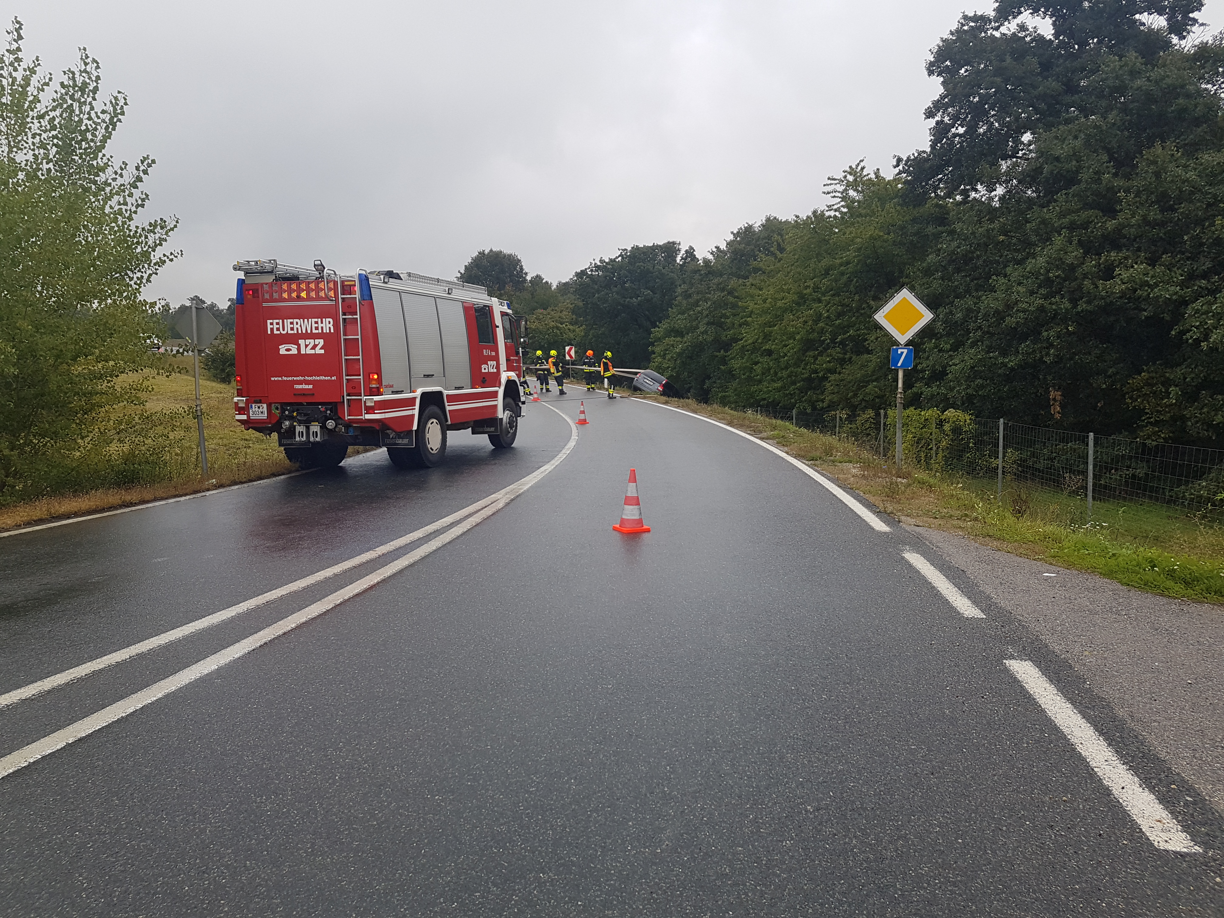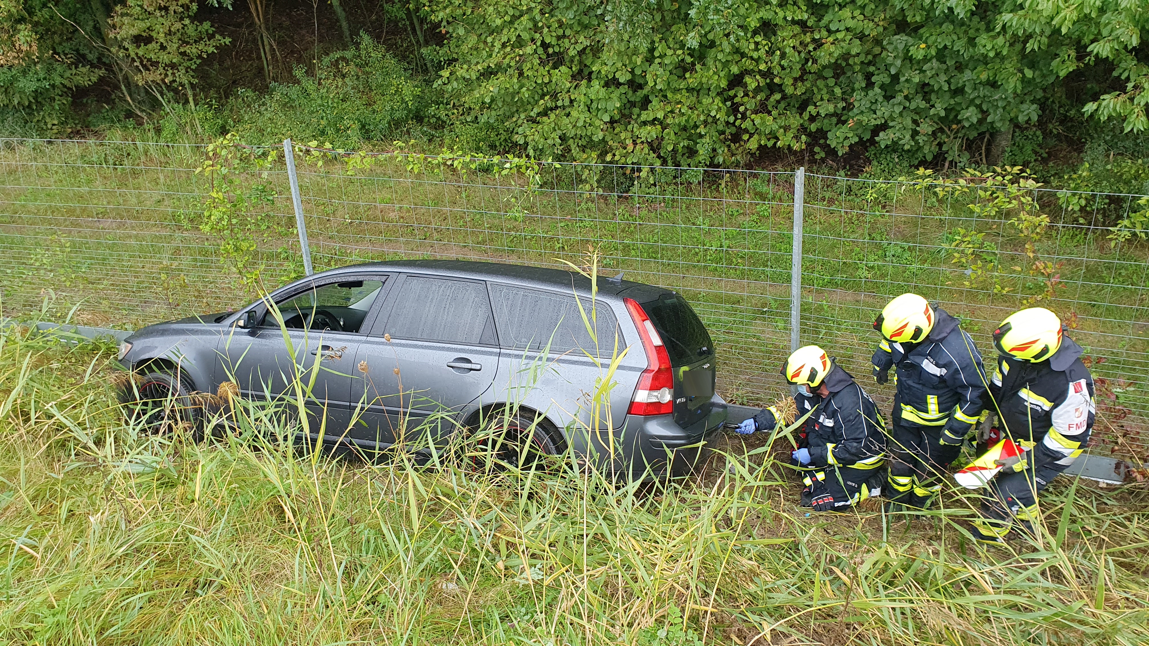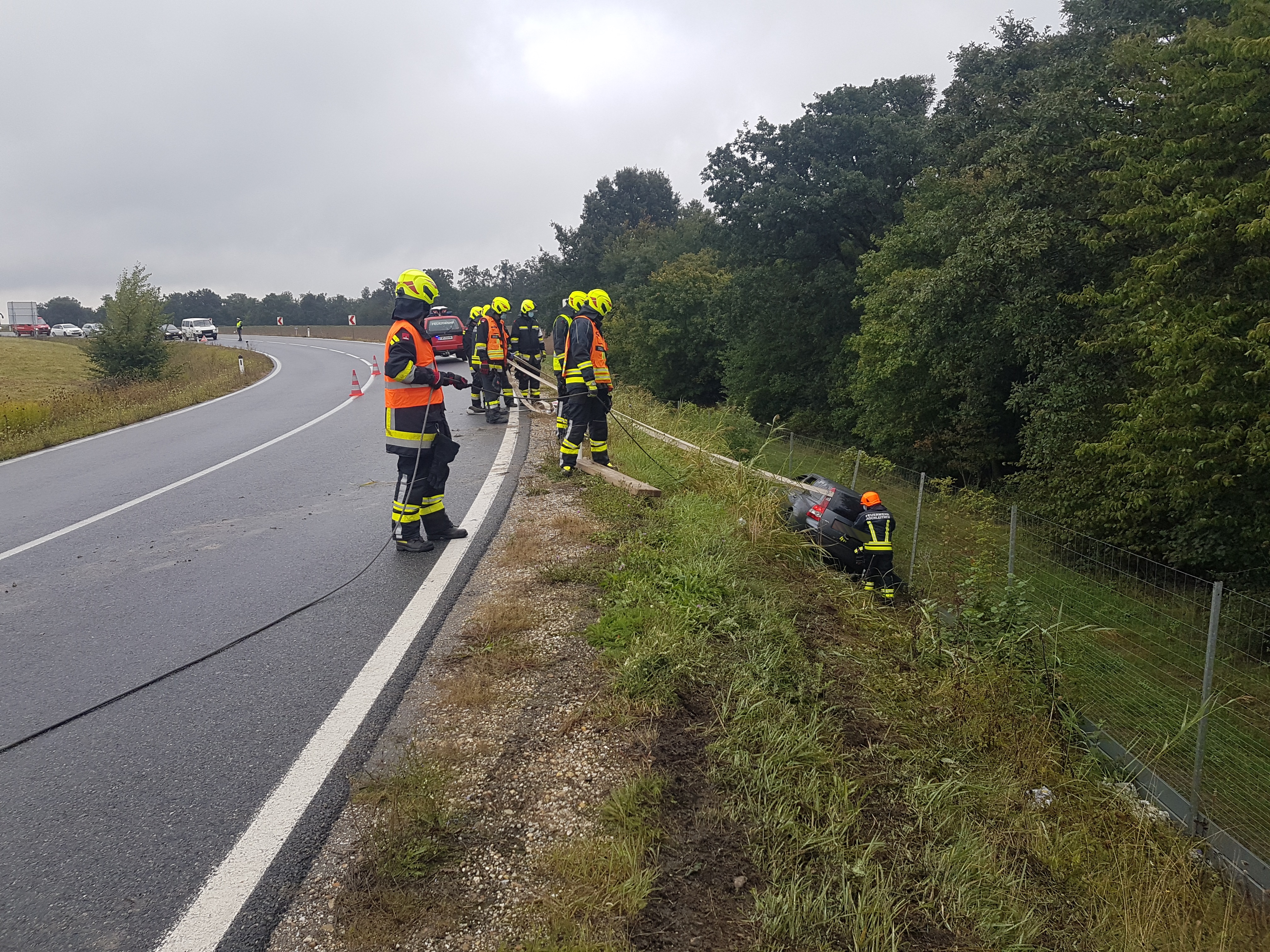 Der Start in die Woche erfolgte mit einer Fahrzeugbergung auf der B7, kurz nach dem Kreisverkehr in der Linkskurve, Fahrtrichtung Kollnbrunn. Ein PKW kam aus unbekannter Ursache von der regennassen Fahrbahn ab, rutschte über die drei Meter tiefe Böschung und prallte gegen den Wildzaun.