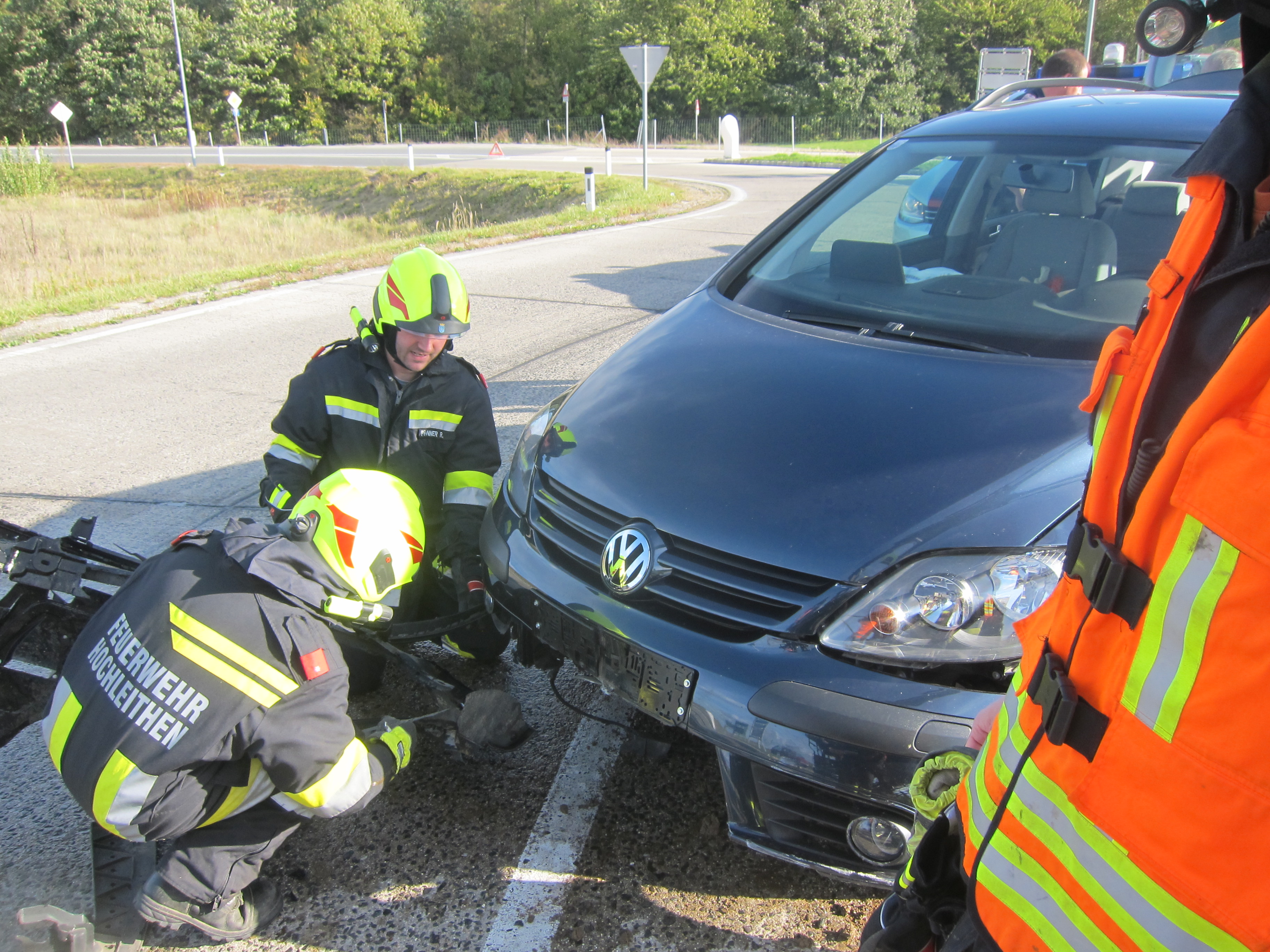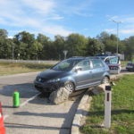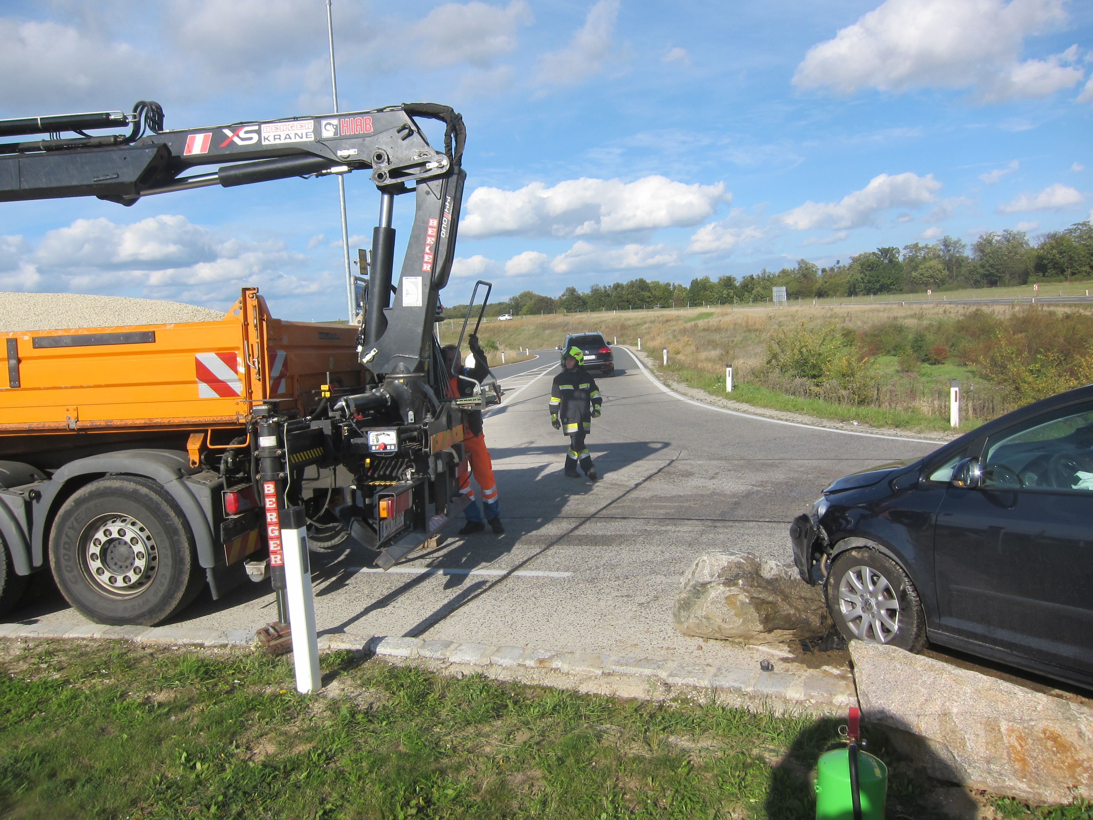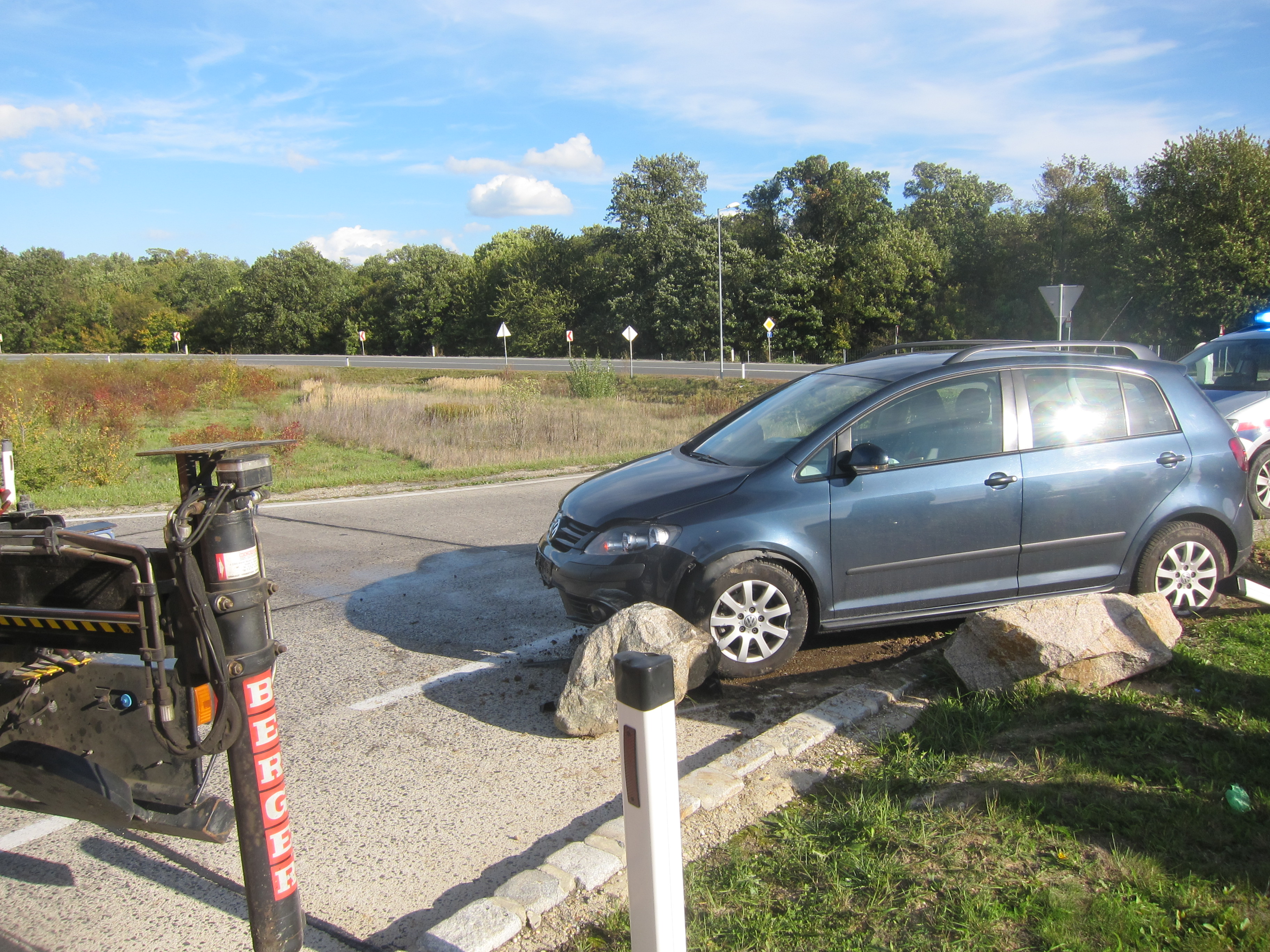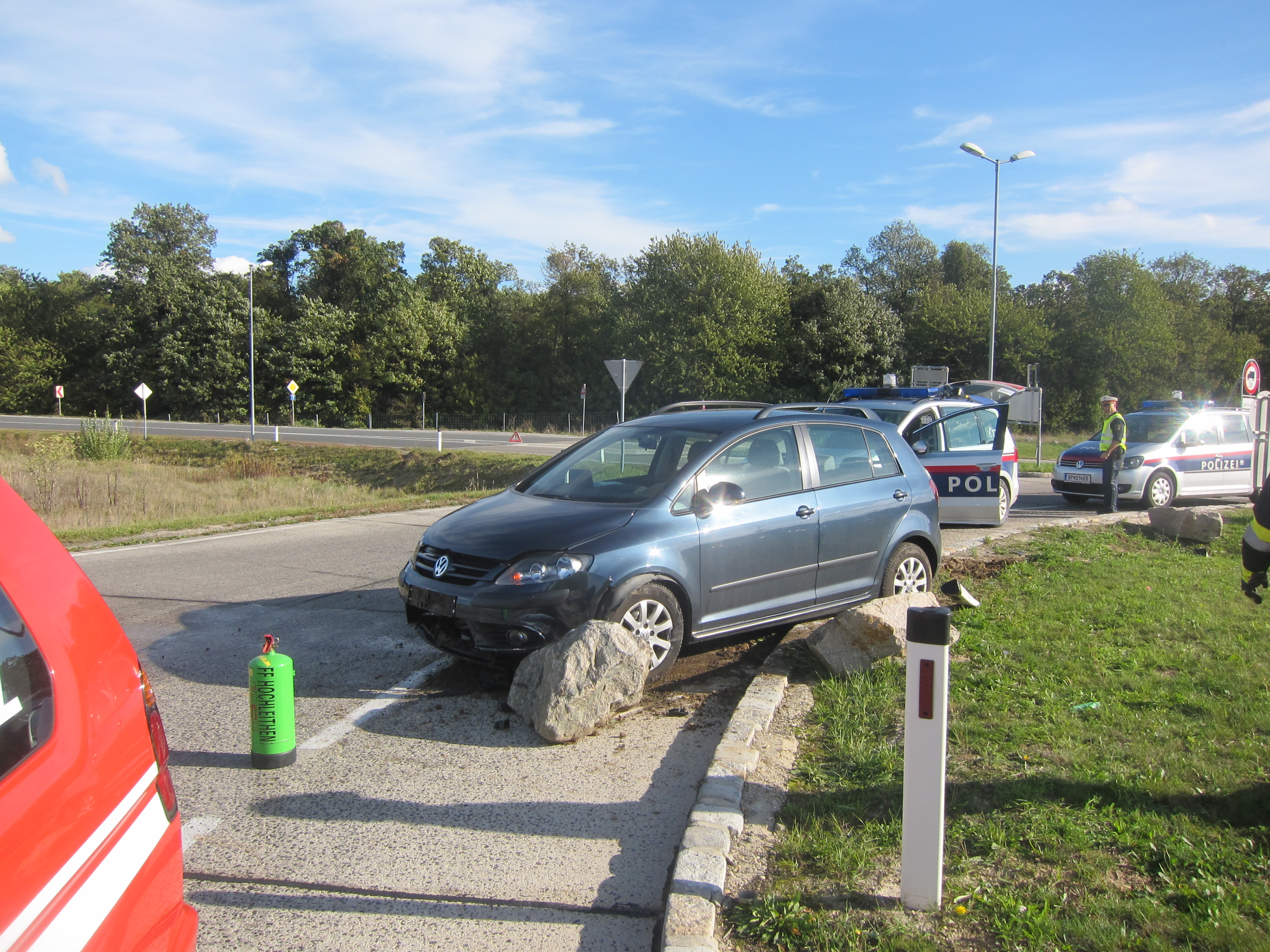 Beim Eintreffen des Vorausfahrzeugs war die Polizei bereits vor Ort. Ein Lenker verlor aus unbekannter Ursache die Kontrolle über seinen PKW und krachte mit dem Fahrzeug gegen die Begrenzungssteine im Kreisverkehr.