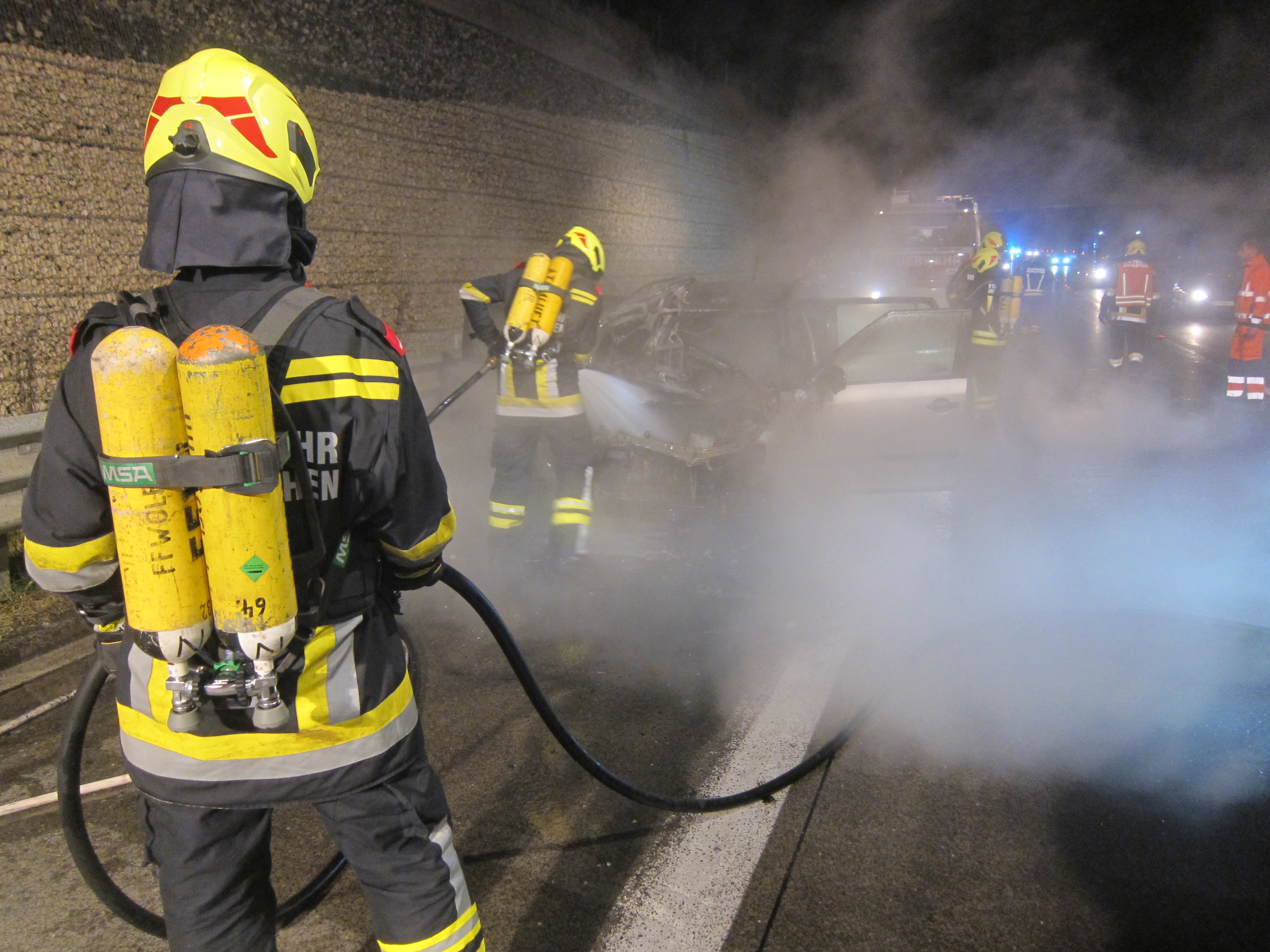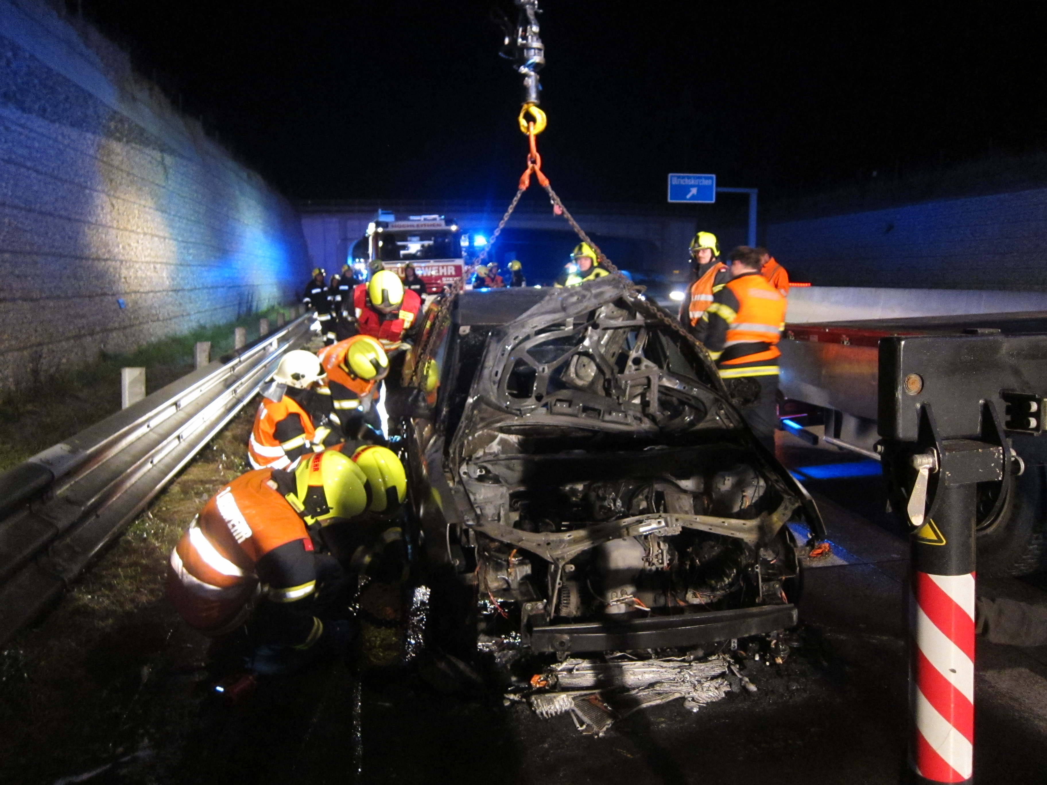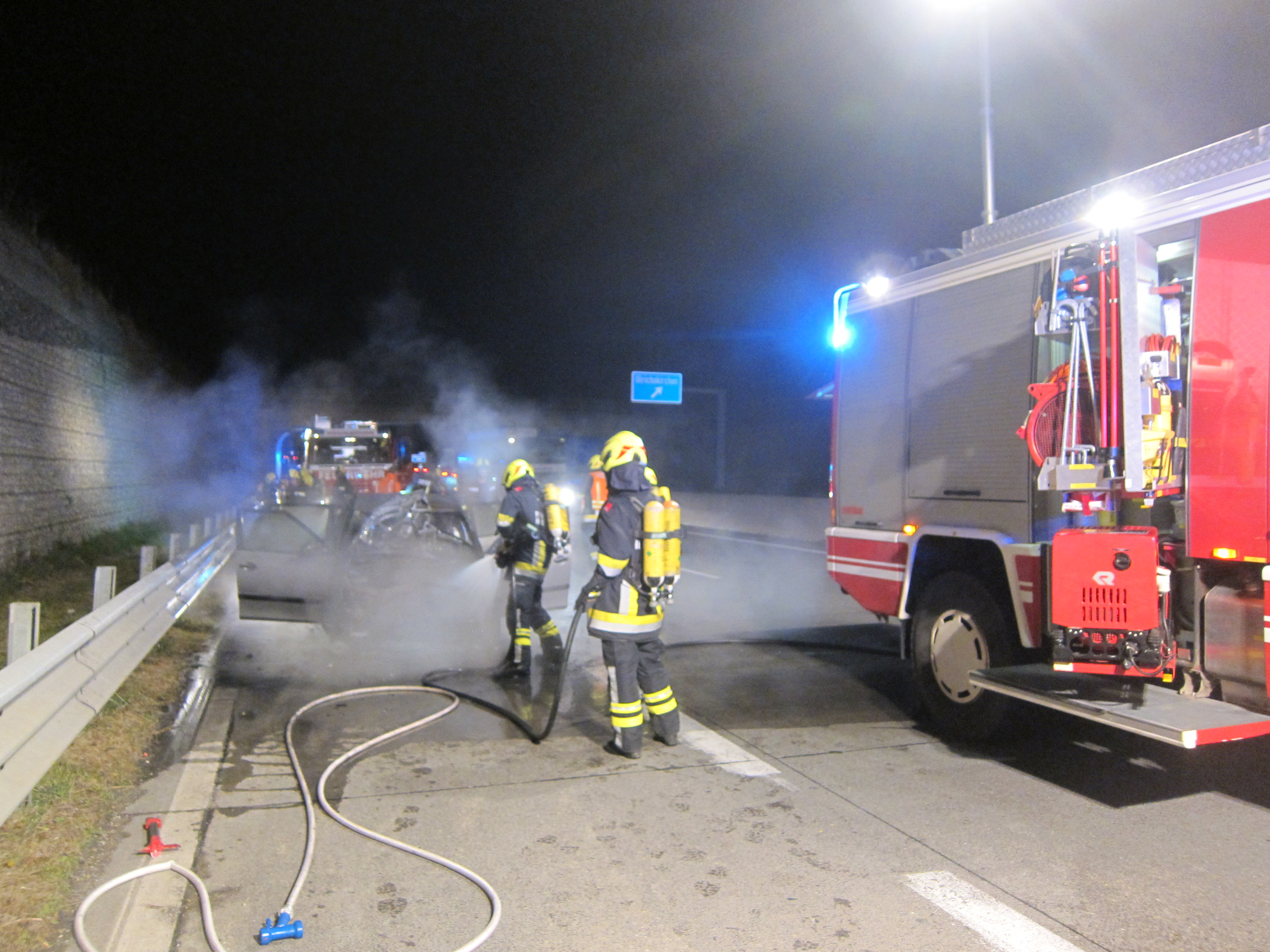 Am Einsatzort angekommen, welcher sich in Fahrtrichtung Wien befand, stand ein PKW auf dem Beschleunigungsstreifen, wobei der Motorraum in Vollbrand stand und die Flammen bereits auf den Fahrerraum übergriffen.