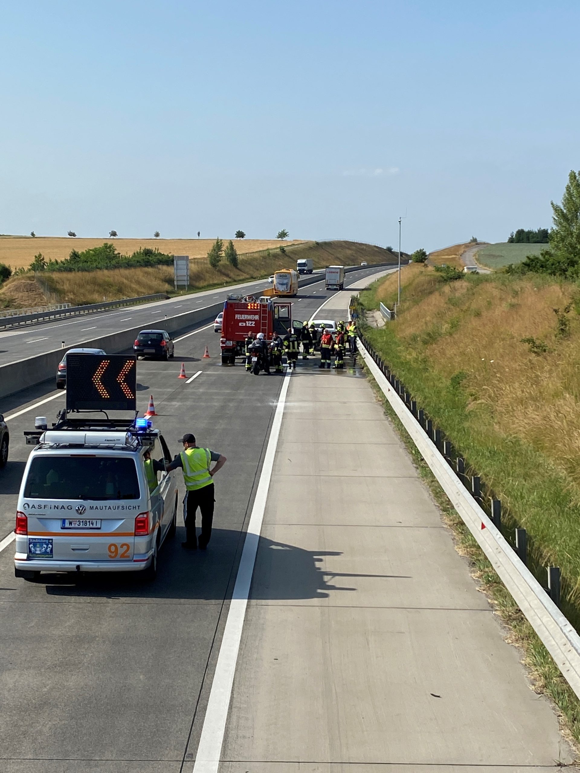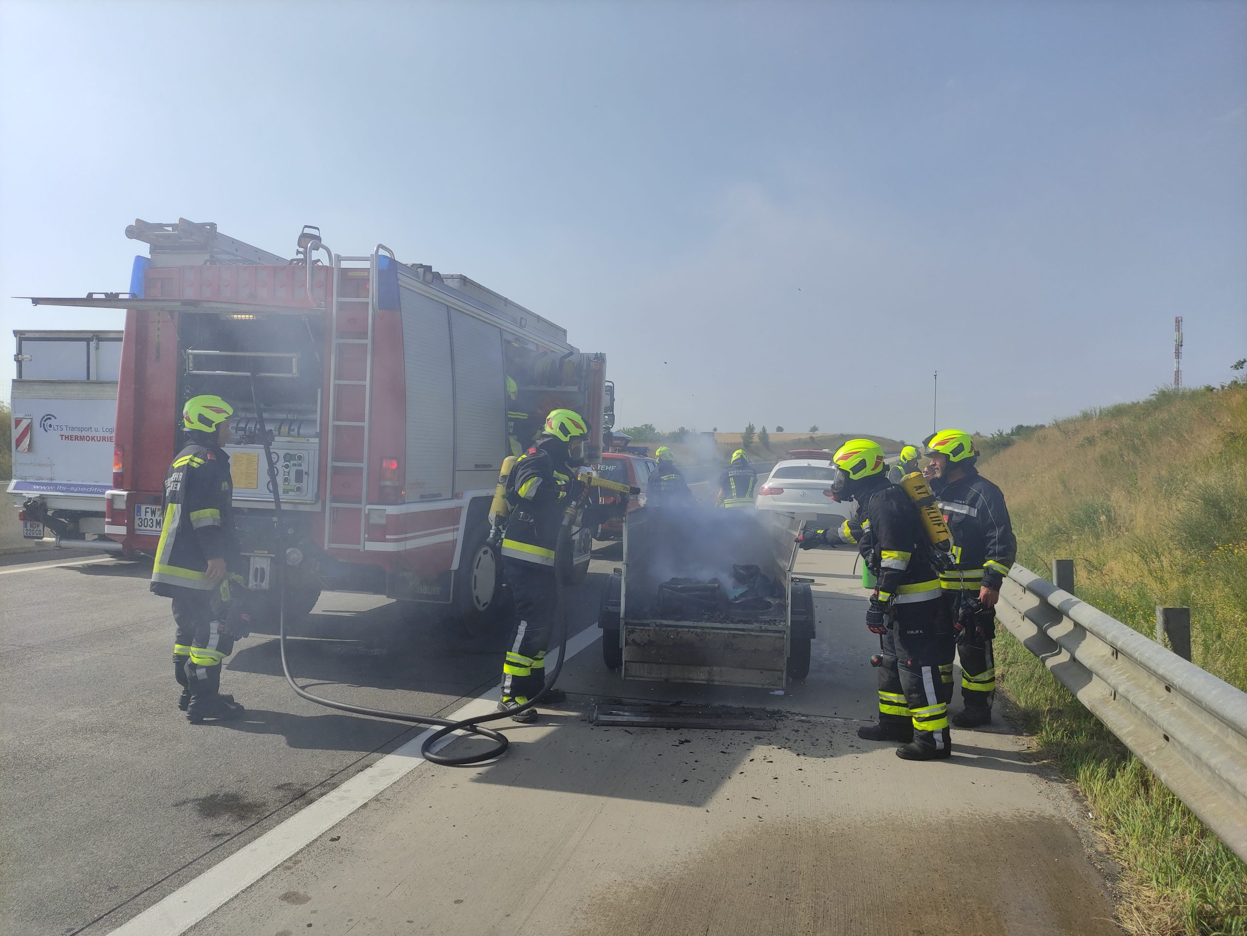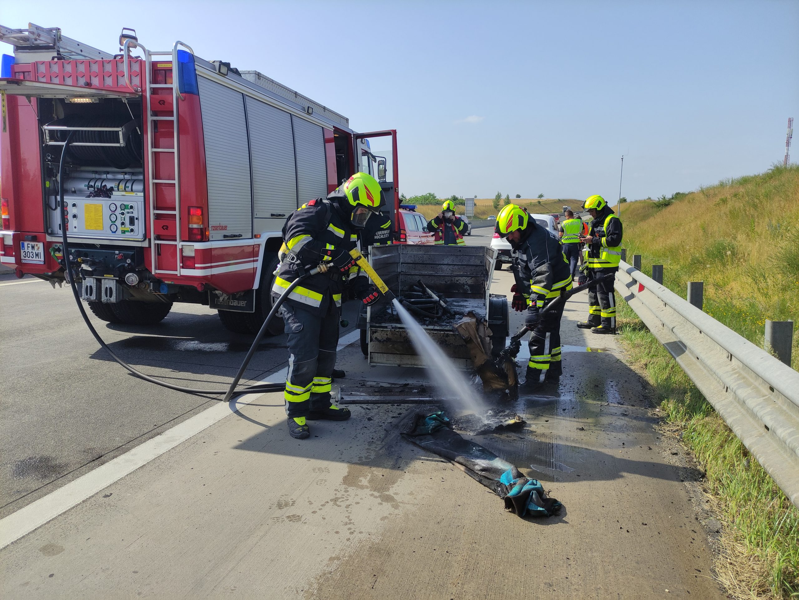 Am 23. Juni wurden wir mittels Sirenenalarm zu einem Fahrzeugbrand auf die A5, in Fahrtrichtung Brünn alarmiert. Nacheinander rückten Vorausfahrzeug, Rüstlöschfahrzeug und Tanklöschfahrzeug in Richtung Einsatzort aus.