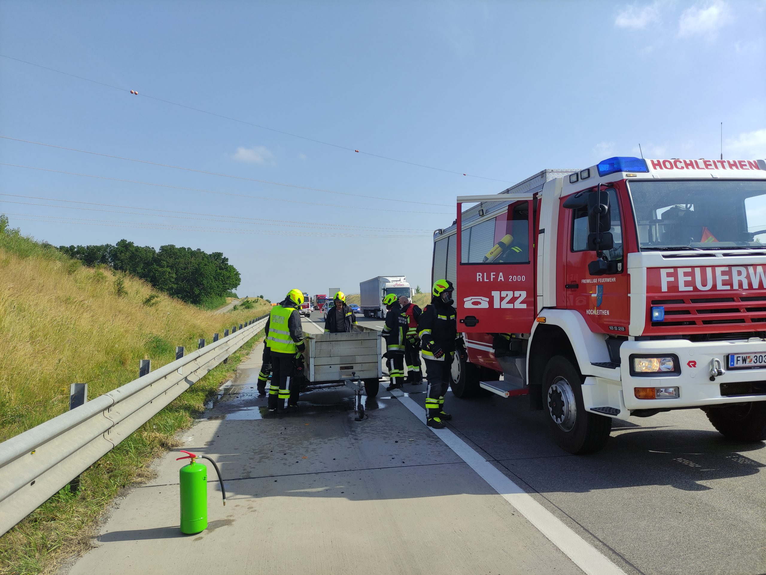 Am Einsatzort angekommen wurde sofort mittels Bioversallöscher und Schnellangriffseinrichtung des Rüstlöschfahrzeugs mit der Brandbekämpfung begonnen. Die Fahrzeugbesitzer handelten zum Glück bereits vor unserem Eintreffen geistesgegenwärtig und koppelten den Anhänger ab, um ein Übergreifen der Flammen auf das Auto zu verhindern. Rasch wurde der brennende Inhalt des Anhängers abgelöscht und nach einer abschließenden Kontrolle mit der Wärmebildkamera konnten die Fahrzeugbesitzer ihre Fahrt fortsetzen.