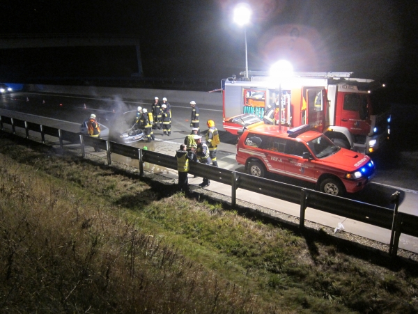 Der Kleinwagen einer aus Wien stammenden Lenkerin fing auf der A5 in Fahrtrichtung Mistelbach im Motorraum Feuer. Nachdem die Lenkerin das Fahrzeug am Pannenstreifen abgestellt hatte, alamierte sie die Feuerwehr und brachte sich mit ihrem mitgeführten Hund hinter der Leitplanke in Sicherheit.
