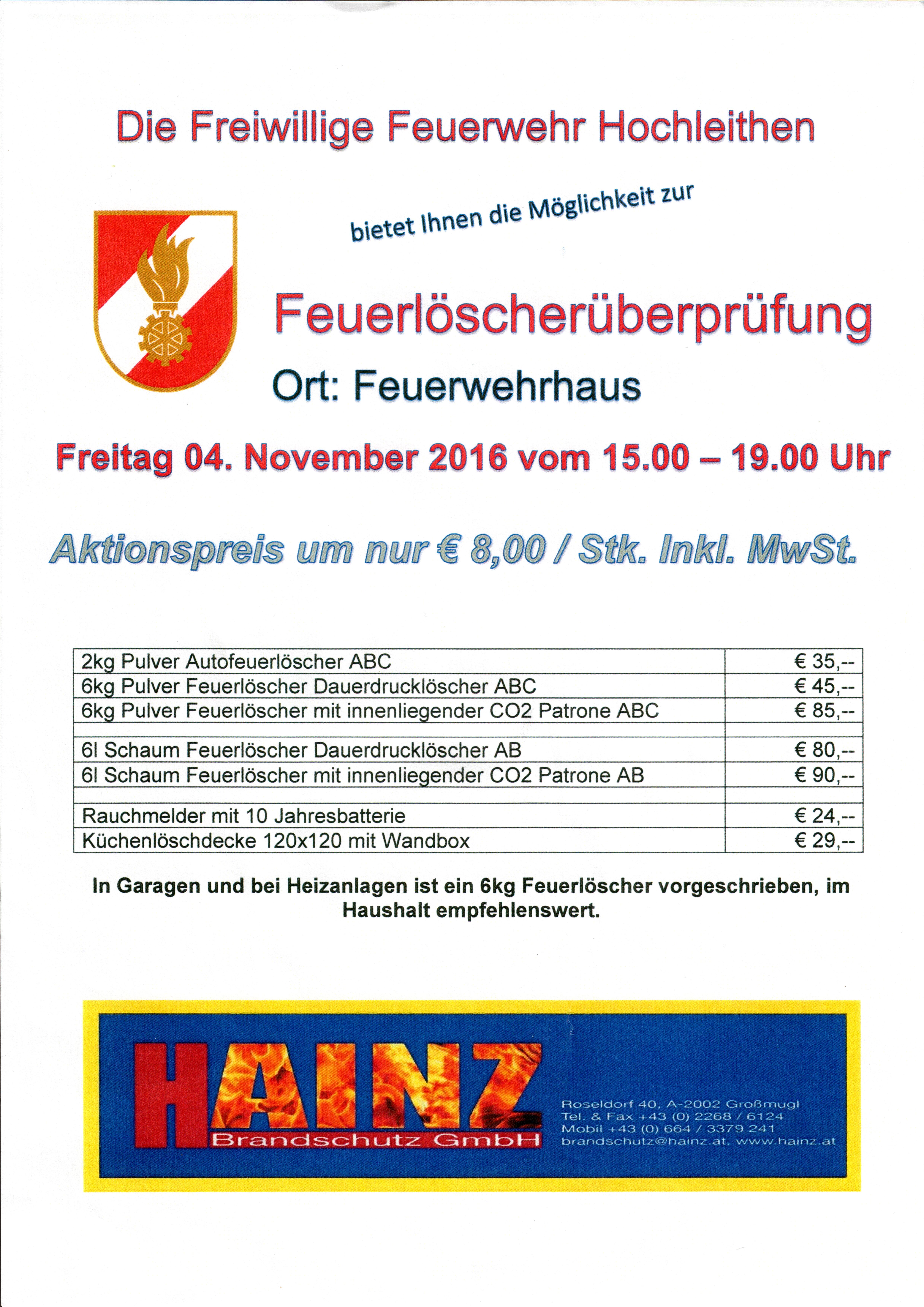 Feuerlöscherüberprüfung I 04.11.2016 – 15:00 – 19:00 I Die Feuerwehr Hochleithen bietet Ihnen die Möglichkeit zur Feuerlöscherüberprüfung. Ort: Feuerwehrhaus Aktionspreis um nur € 8,00 / Stk. inkl. MwSt. © Feuerwehr Hochleithen Bilder Autor: Stefan Ausfelder KommentarnavigationZurückVorheriger Beitrag:Geburtstagsfeier von Bundesfeuerwehrrat Johann RernböckNächstesNächster Beitrag:Laternenfest vom Kindergarten HochleithenÄhnliche BeträgeStockfleischessen im Feuerwehrhaus20. Februar 2026Ball der Freiwilligen Feuerwehr Hochleithen17. Januar 2026Fahrzeugbergung am 2. Advent7. Dezember 2025Patenschaft für neue Atemluftflaschen4. Dezember 2025Weihnachtsfeier der Feuerwehr Hochleithen29. November 2025Alarmierung zu T2 Menschenrettung29. November 2025
