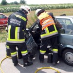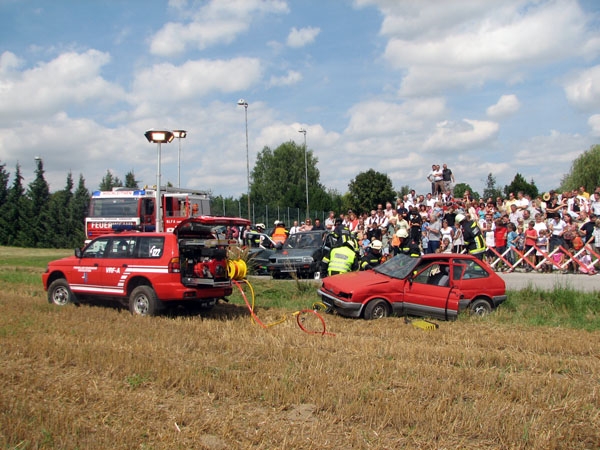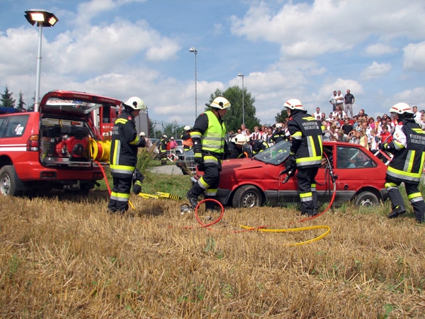 Die Feuerwehr Hochleithen lud zum alljährliche traditionellen Feuerwehrheurigen. Bei trockenem und nicht zu heißem Wetter konnten wir uns über eine große Besucheranzahl freuen. Am Samstag sorgten „Die Schopf Buam“ für gute Stimmung mit einem ausgewogenen Programm für jung und alt. Am Sonntag begann der Tag mit einer Feldmesse zelebriert von Hochwürden Pfarrer Heinrich Kaiser im Gemeindezentrum, musikalisch gestaltet durch den MV Hochleithen. Ab 10:00 Uhr startete der Frühschoppen mit unserem Musikverein. Bei gutem Grillhendl und bewehrtem Speiseplan war es ein gelungener Frühschoppen mit sehr, sehr vielen Gästen. An dieser Stelle ein großes Dankeschön an die fleißige diensthabende Mannschaft. Als Nachmittagsprogramm gab es die einsatzmäßige Vorführung des neuen Vorausfahrzeuges. Zahlreiche Gäste benutzten die Gelegenheit das Fahrzeug in Kombination mit dem Rüstlöschfahrzeug im Einsatz zu sehen. Kommentiert von Kommandant Rernböck wurde ein Verkehrsunfall mit zwei PKW von Christian Achter FZKdt, Daniela Schiller und Gerhard Kreitmeier auf dem Vorausfahrzeug und Franz Achter FZKdt. Andrea Friedl, Martin und Gerhard Poyer, Johannes Coufal, Andreas Rernböck, Andreas Schiller, Martin Führer und Klaus Hörwein auf dem Rüstlöschfahrzeug bearbeitet. Es galt eingeklemmte Personen aus den PKW´s zu retten. Dazu war die Absicherung der Unfallstelle, der Aufbau eines Brandschutzes und der Einsatz zweier hydraulischer Rettungssätze notwendig. Beobachtet von Kameraden der FF Wolkersdorf konnte diese schwierige Aufgabe in 15 Minuten ab der Alarmierung erledigt werden. Die Zuschauer dankten mit großem Applaus den Akteuren für die gelungene Vorführung. Danke an die Straßenmeisterei Wolkersdorf und Franz Toifl, der mit dem Bagger die Unfallfahrzeuge vorbereitete. Danke auch an die Jugend für ihre Mitarbeit als Statisten. Zusätzlich zum Nachmittagsprogramm gab es die Möglichkeit einer kostenlosen Fahrradkodierung durch die Polizeiinspektion Wolkersdorf, ein Dankeschön an die Kameraden der Polizeiinspektion Wolkersdorf. Der diesjährige Besucherrekord übertraf all unsere Erwartungen und ist ein großer Ansporn für unser FF Hochleithen Organisationsteam. © Feuerwehr Hochleithen