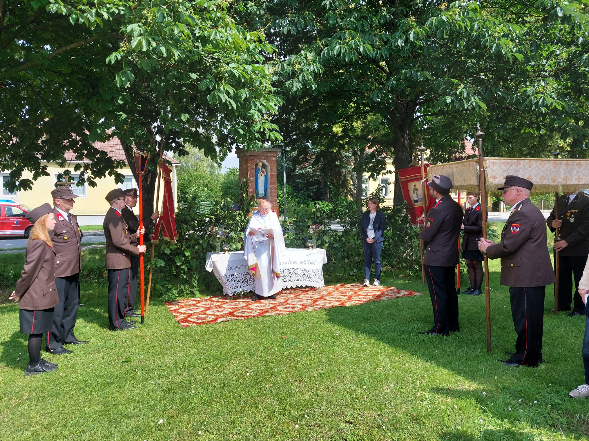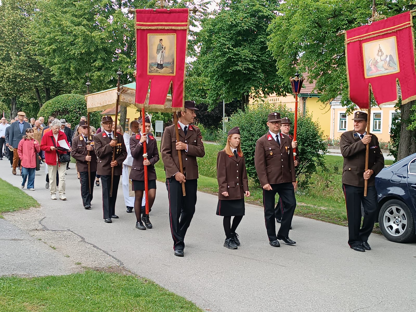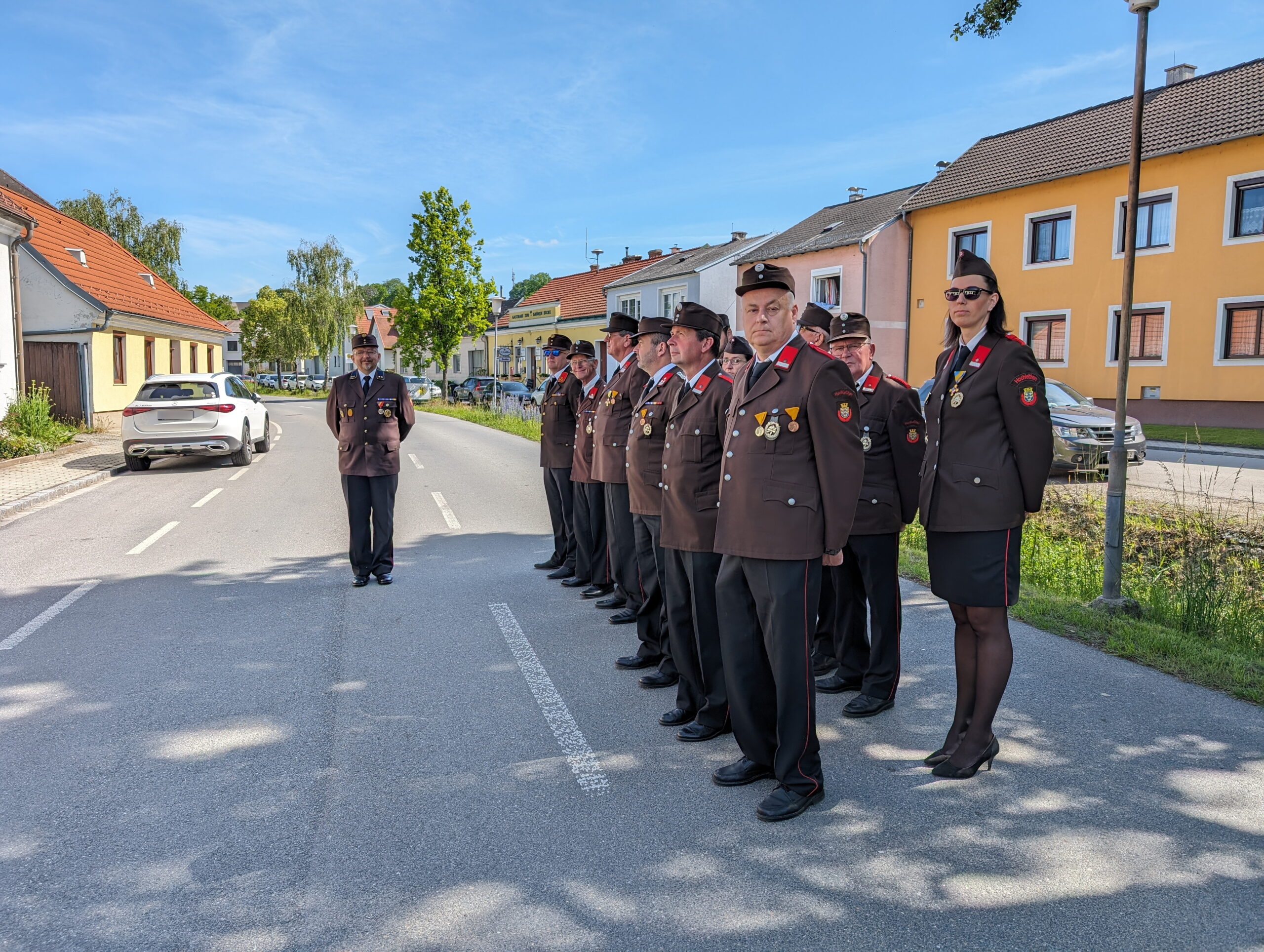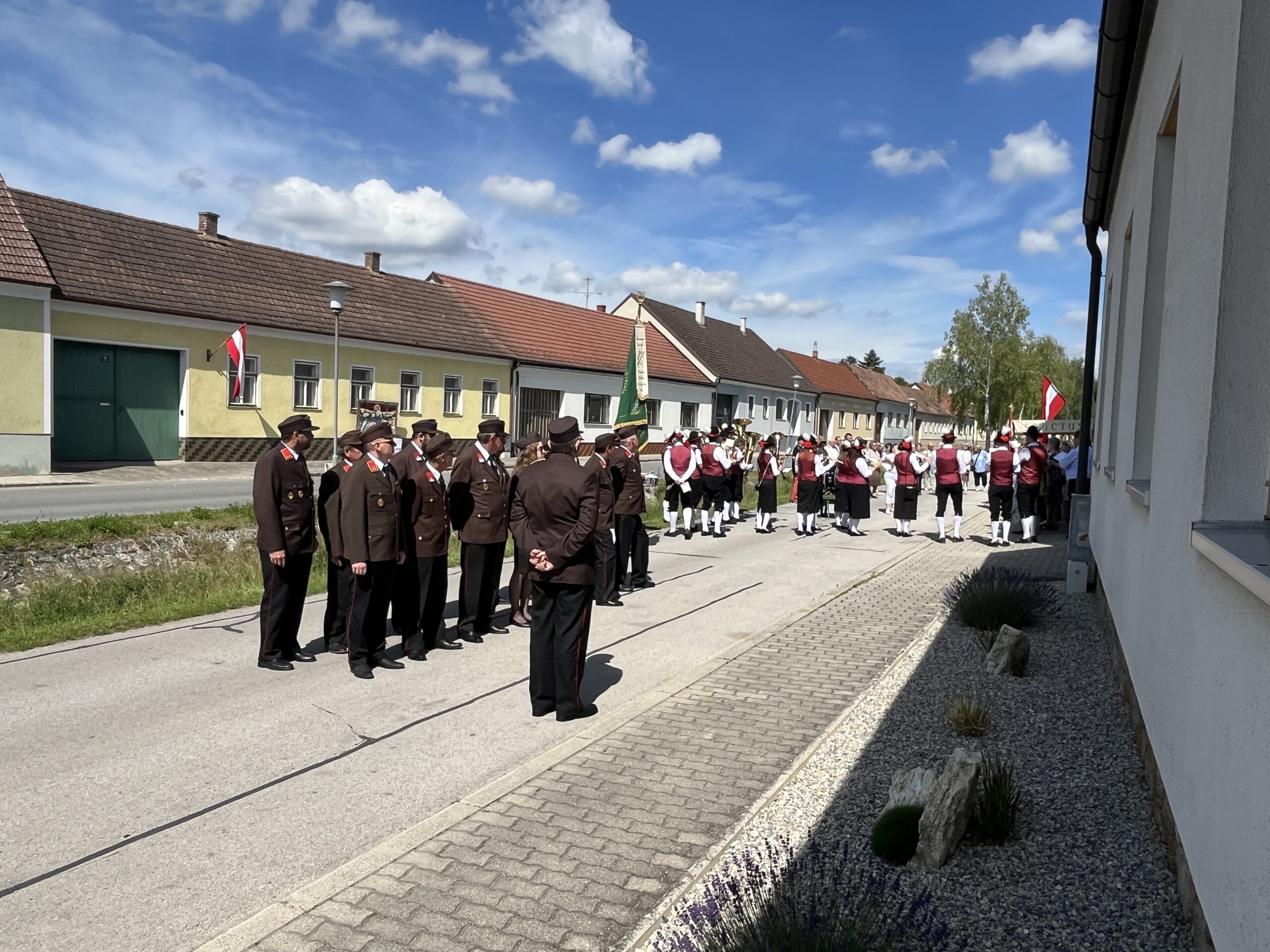Bei strahlendem Sonnenschein und sommerlichen Temperaturen wohnten die Kameradinnen und Kameraden der Freiwilligen Feuerwehr Hochleithen den Festumzügen bei.
