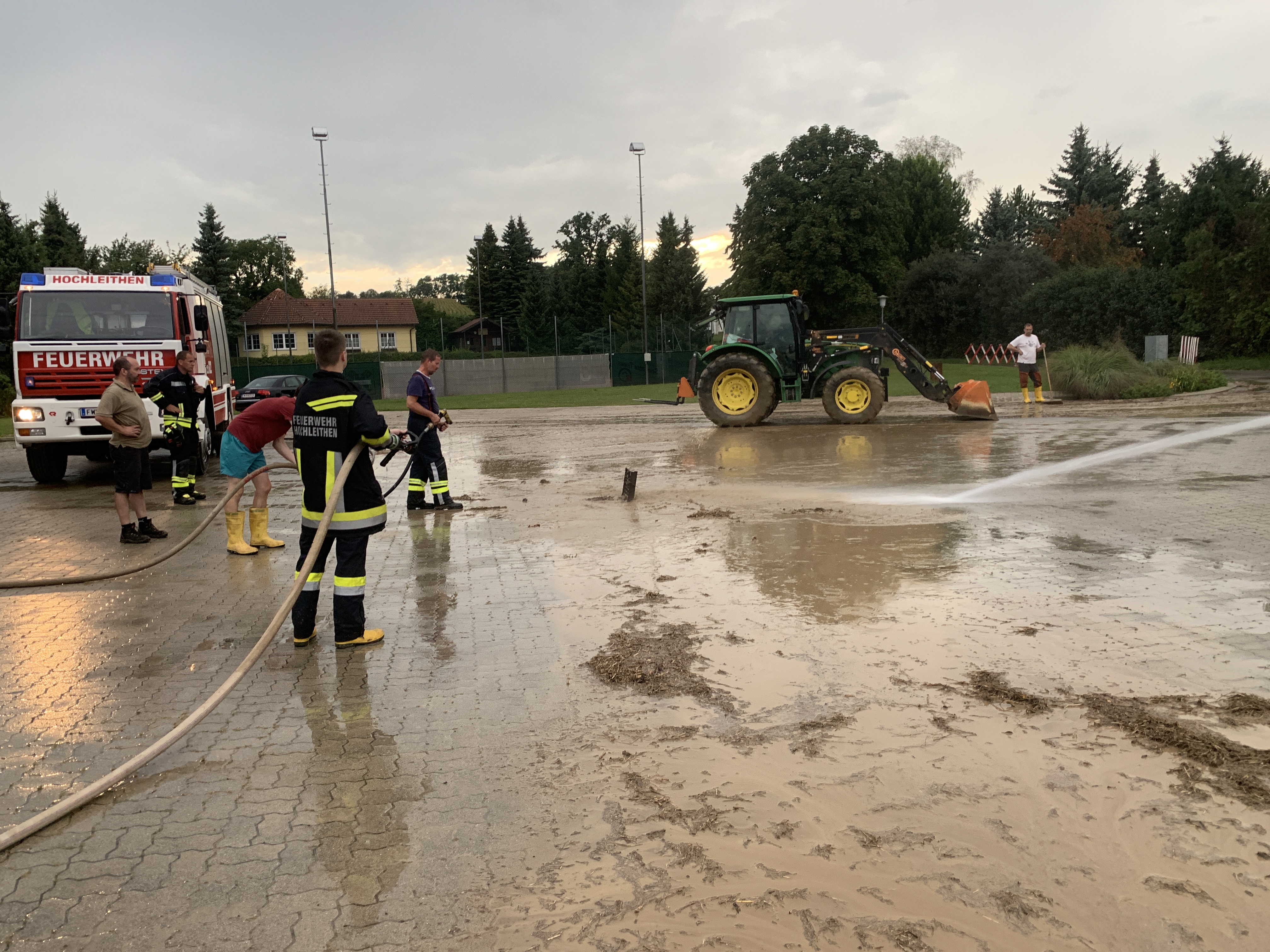 Ein plötzliches Gewitter erwischte die Gemeinde Hochleithen mit voller Wucht. Mit den folgenden Aufräumarbeiten waren wir bis in die Abendstunden gefordert. Dazu gehörten Auspumparbeiten, Freimachen von Verklausungen im Bachbett sowie diverse Straßenreinigungen. Insgesamt waren 31 Feuerwehrmitglieder mit sämtlichen Einsatzfahrzeugen im Einsatz. Dank der tatkräftigen Unterstützung mittels Gemeindetraktor samt Frontlader konnten wir die enormen Schlammmassen nach und nach beseitigen.
