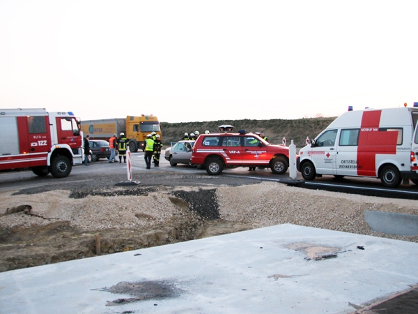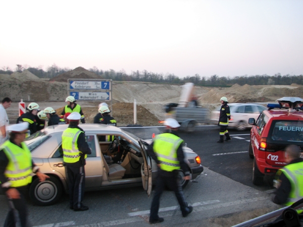 Der Mercedes-Fahrer war ansprechbar, somit ließen wir den Lenker im PKW sitzen, da er Anzeichen auf eine Verletzung hatte. Die Rettung übernahm die Erstversorgung mit Halskrause und Sauerstoff dabei musste die Feuerwehr Hochleithen helfen, den Fahrer aus dem Auto zu heben, damit die Wirbelsäule nicht zu sehr belastet wird. Der Unfalllenker blieb unverletzt.