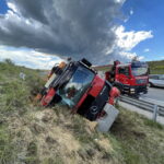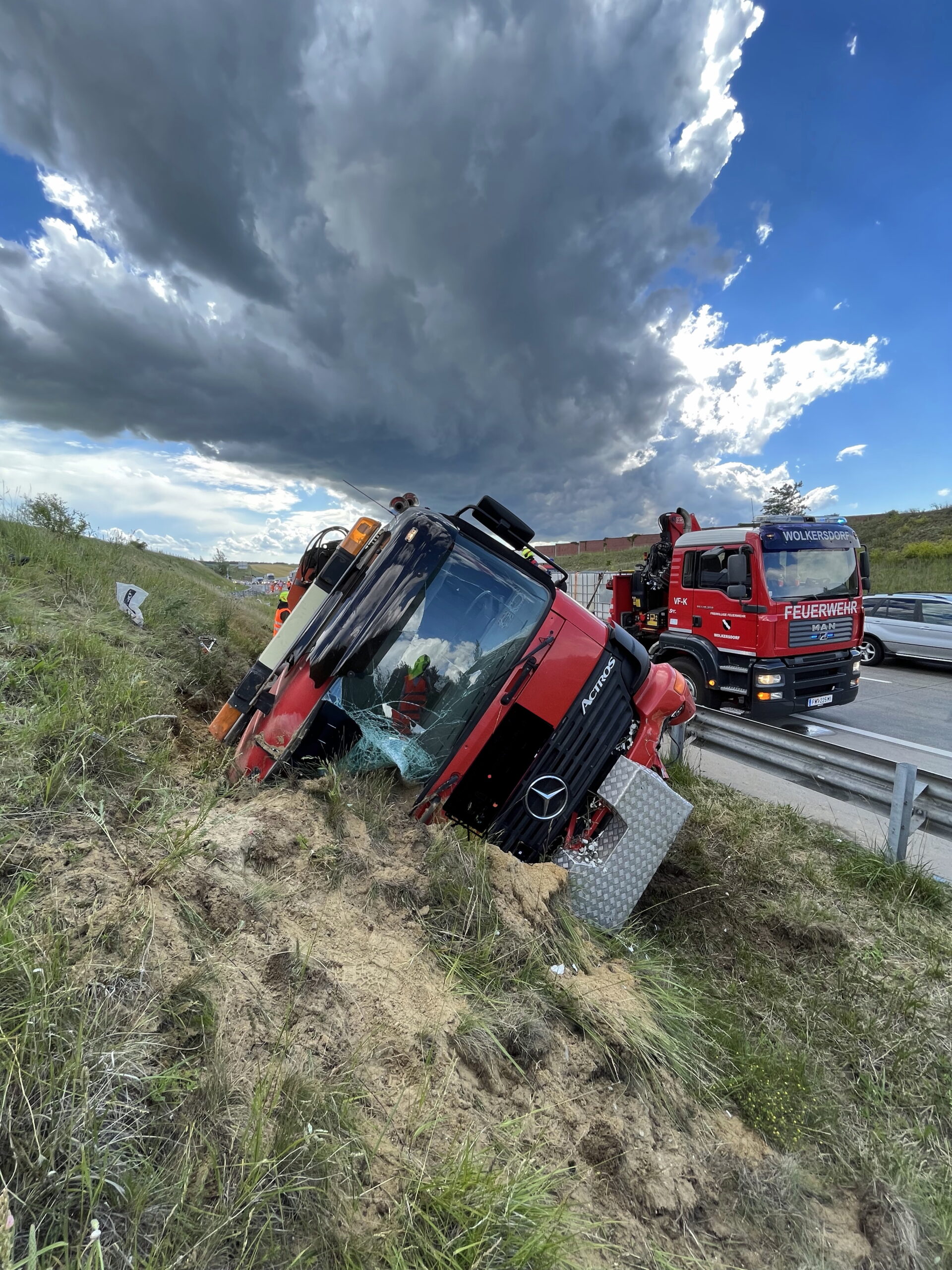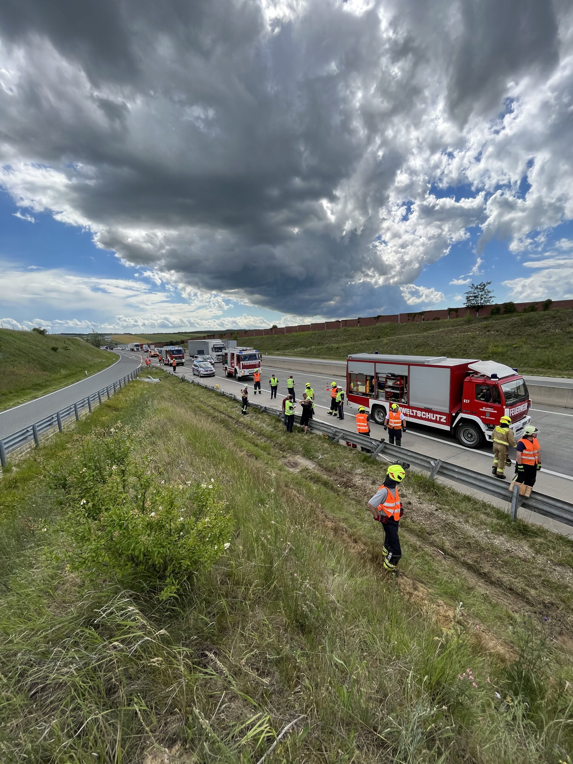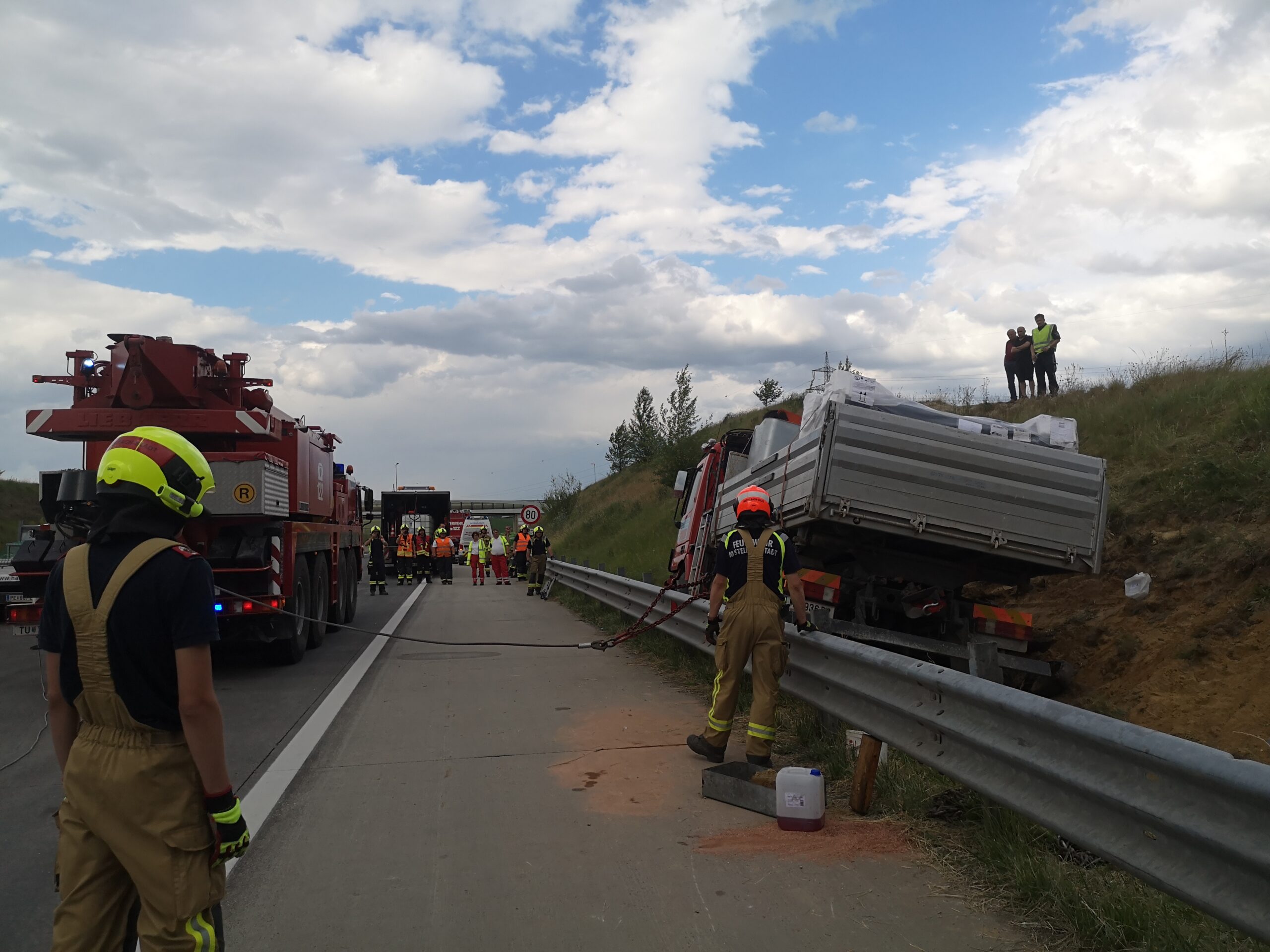 Am frühen Nachmittag des 13. Juni wurden wir zu einer LKW- Bergung auf die Autobahn A5 Fahrtrichtung Brünn alarmiert. Zügig wurden Voraus sowie Rüstlöschfahrzeug besetzt und rückten zum Unfallort aus. Auf Grund des Schadensausmaßes wurde kurze Zeit später das Hilfeleistungsfahrzeug zum Einsatzort nachalarmiert. Am Einsatzort angekommen bot sich uns folgende Schadenslage: unmittelbar auf Höhe Abfahrt Gaweinstal kam ein LKW aus noch unbekannter Ursache hinter der Leitplanke im Graben zum liegen. Wir sicherten die Unfallstelle ab und bauten den Brandschutz auf. Weiters wurden der Schadstoffzug Mistelbach und der Kran Mistelbach zur weiteren Einsatzabwicklung hinzugezogen. Über die Dauer der gesamten Einsatzes waren 35 Mitglieder der Feuerwehren Hochleithen, Wolkersdorf und Mistelbach anwesend. Das Unfallfahrzeug wurde durch die Firma Raupold abgeschleppt und gesichert abgestellt.