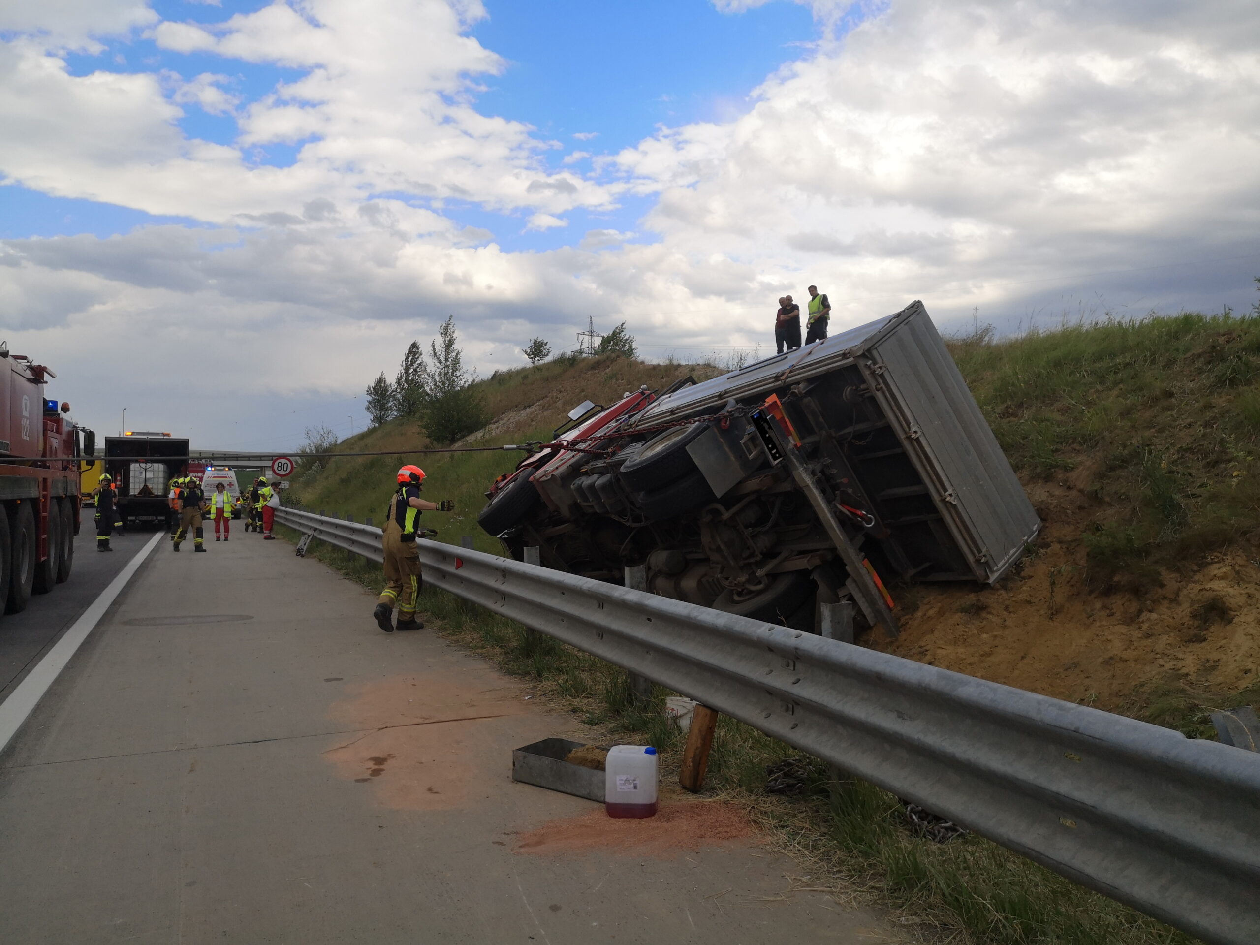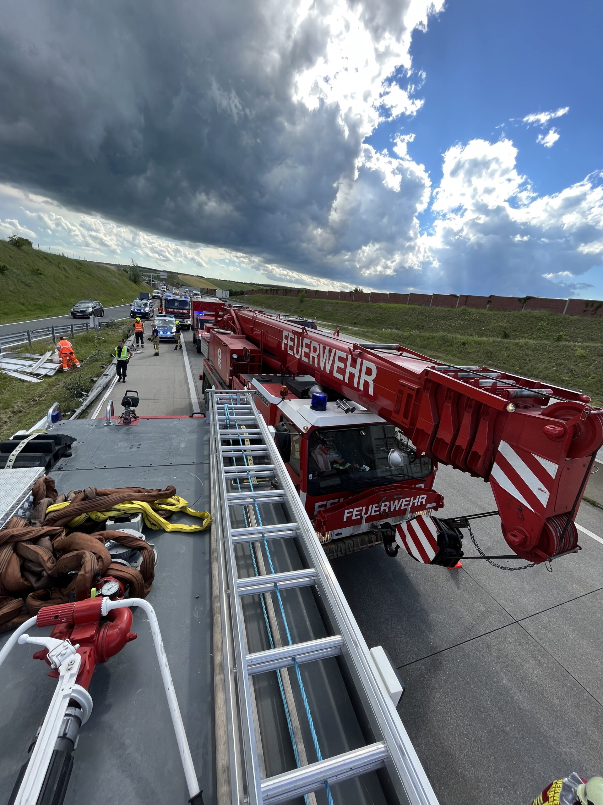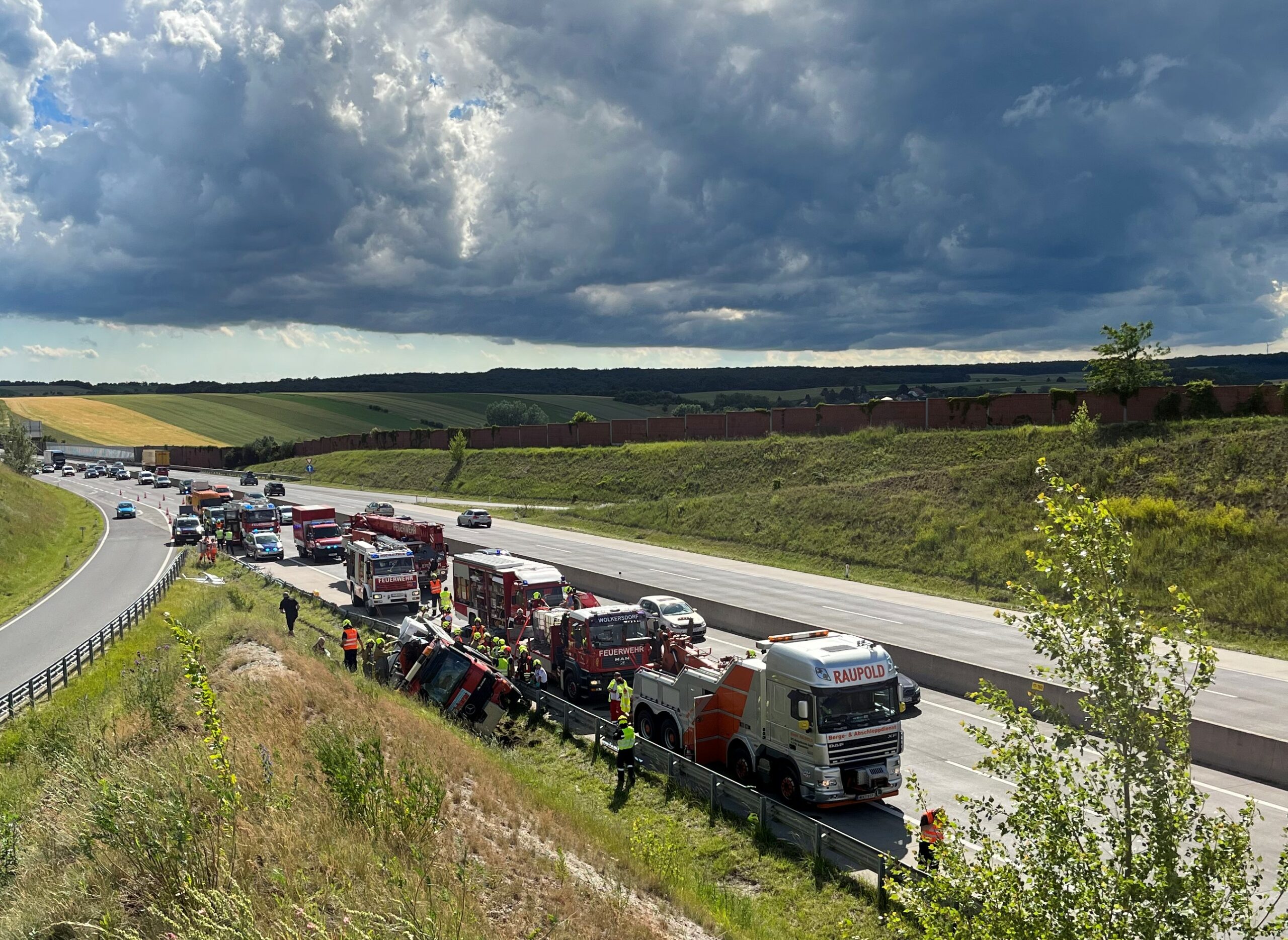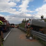 Am frühen Nachmittag des 13. Juni wurden wir zu einer LKW- Bergung auf die Autobahn A5 Fahrtrichtung Brünn alarmiert. Zügig wurden Voraus sowie Rüstlöschfahrzeug besetzt und rückten zum Unfallort aus. Auf Grund des Schadensausmaßes wurde kurze Zeit später das Hilfeleistungsfahrzeug zum Einsatzort nachalarmiert. Am Einsatzort angekommen bot sich uns folgende Schadenslage: unmittelbar auf Höhe Abfahrt Gaweinstal kam ein LKW aus noch unbekannter Ursache hinter der Leitplanke im Graben zum liegen. Wir sicherten die Unfallstelle ab und bauten den Brandschutz auf. Weiters wurden der Schadstoffzug Mistelbach und der Kran Mistelbach zur weiteren Einsatzabwicklung hinzugezogen. Über die Dauer der gesamten Einsatzes waren 35 Mitglieder der Feuerwehren Hochleithen, Wolkersdorf und Mistelbach anwesend. Das Unfallfahrzeug wurde durch die Firma Raupold abgeschleppt und gesichert abgestellt.