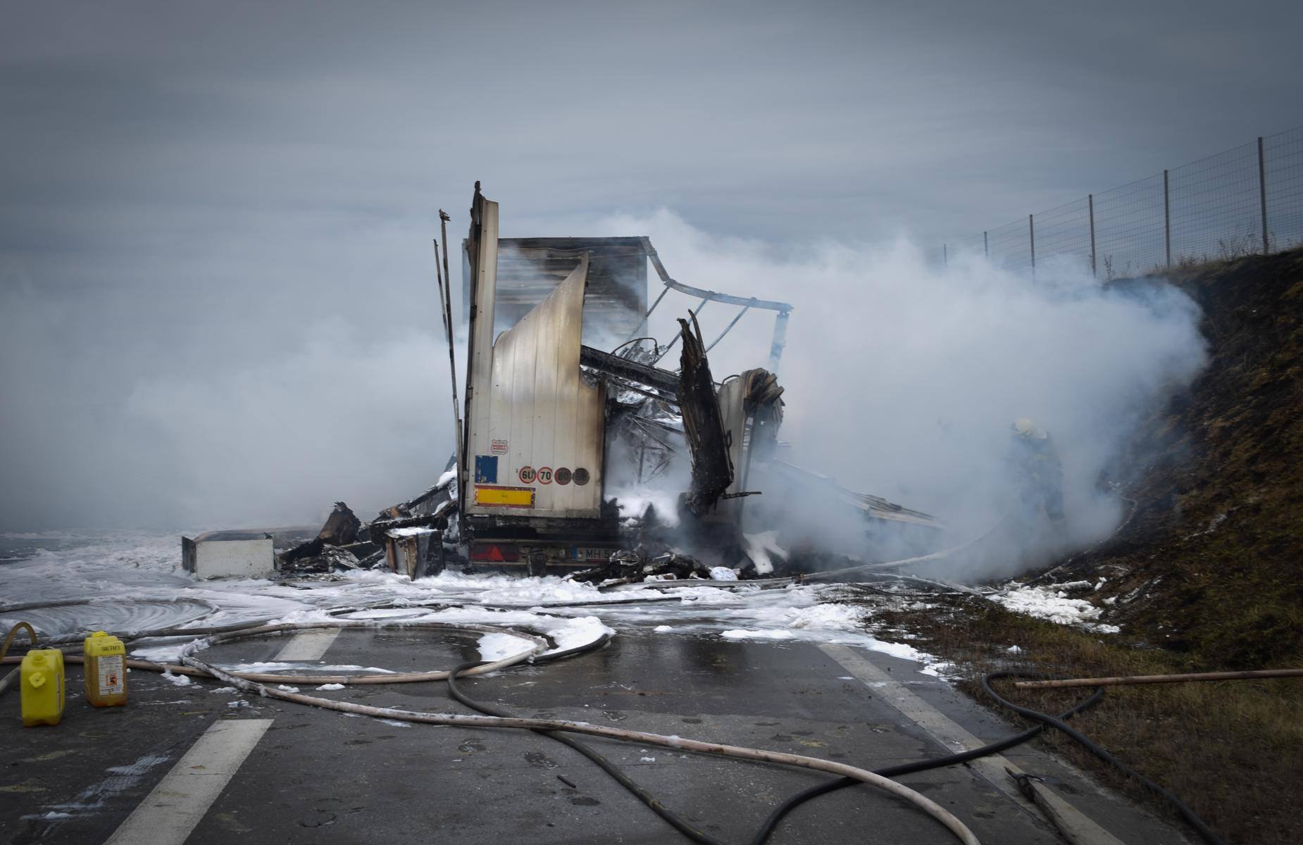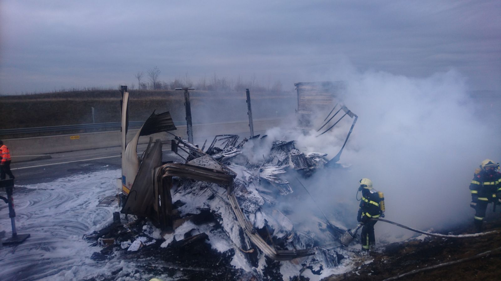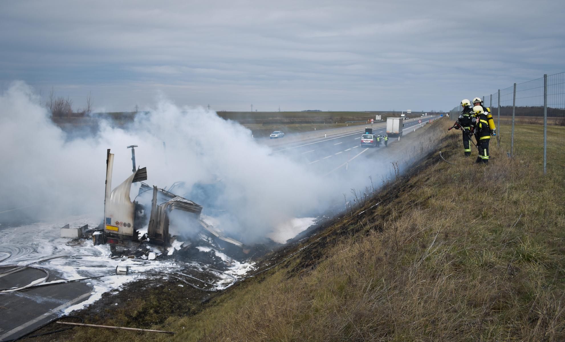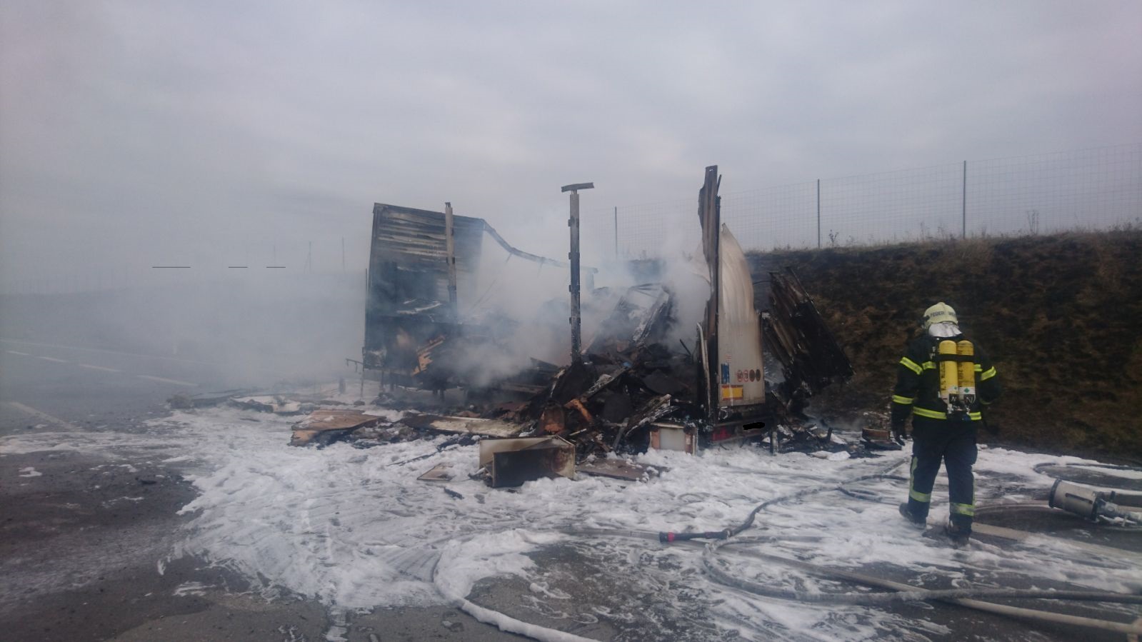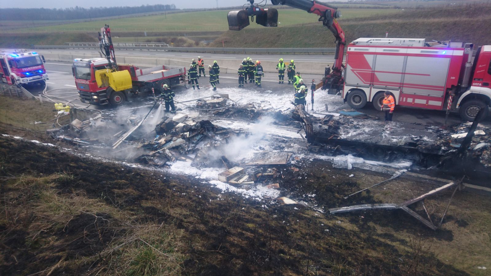 Bereits von weitem war eine riesige Rauchsäule zu erkennen. Die Mannschaften des RLFs und TLFs legten schon während der Anfahrt die Atemschutzgeräte an, um bei der Ankunft unverzüglich eingreifen zu können. Am Einsatzort angekommen ergab sich folgendes Bild: Ein LKW-Anhänger befand sich in Vollbrand. Glücklicherweise konnte der Lenker die Zugmaschine noch abkoppeln und diese so im letzten Moment vor den Flammen retten. Gleichzeitig mit den Kameraden aus Wolkersdorf begannen wir via Schnellangriffseinrichtung sofort mit den ersten Löschmaßnahmen. Die Autobahnpolizei veranlasste außerdem eine Vollsperre der Richtungsfahrbahn Brünn.