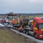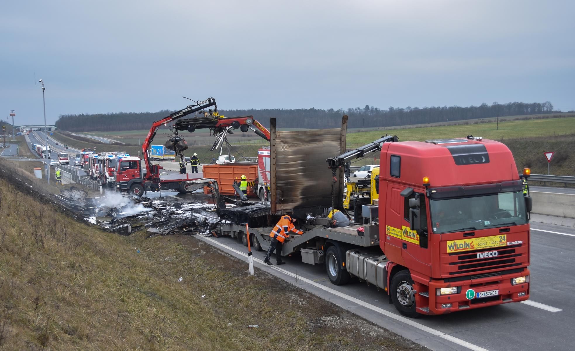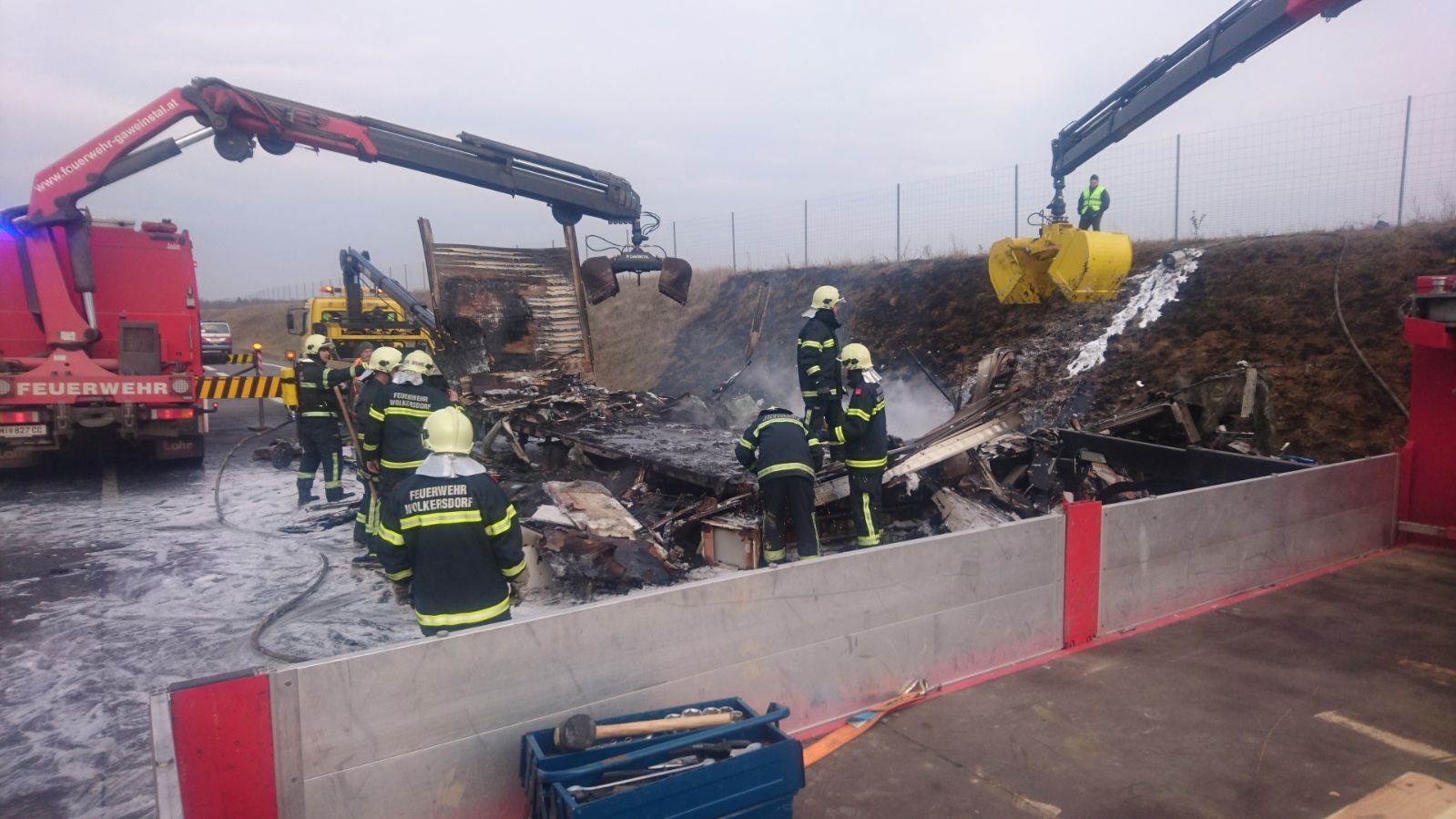 Nachdem der Brand größtenteils gelöscht war, wurde das restliche Brandgut Stück für Stück auseinandergeräumt, um die verbleibenden Glutnester sukzessive ablöschen zu können. Abschließend wurden von der Autobahnpolizei ein Abschlepp- und ein Entsorgungsunternehmen angefordert.