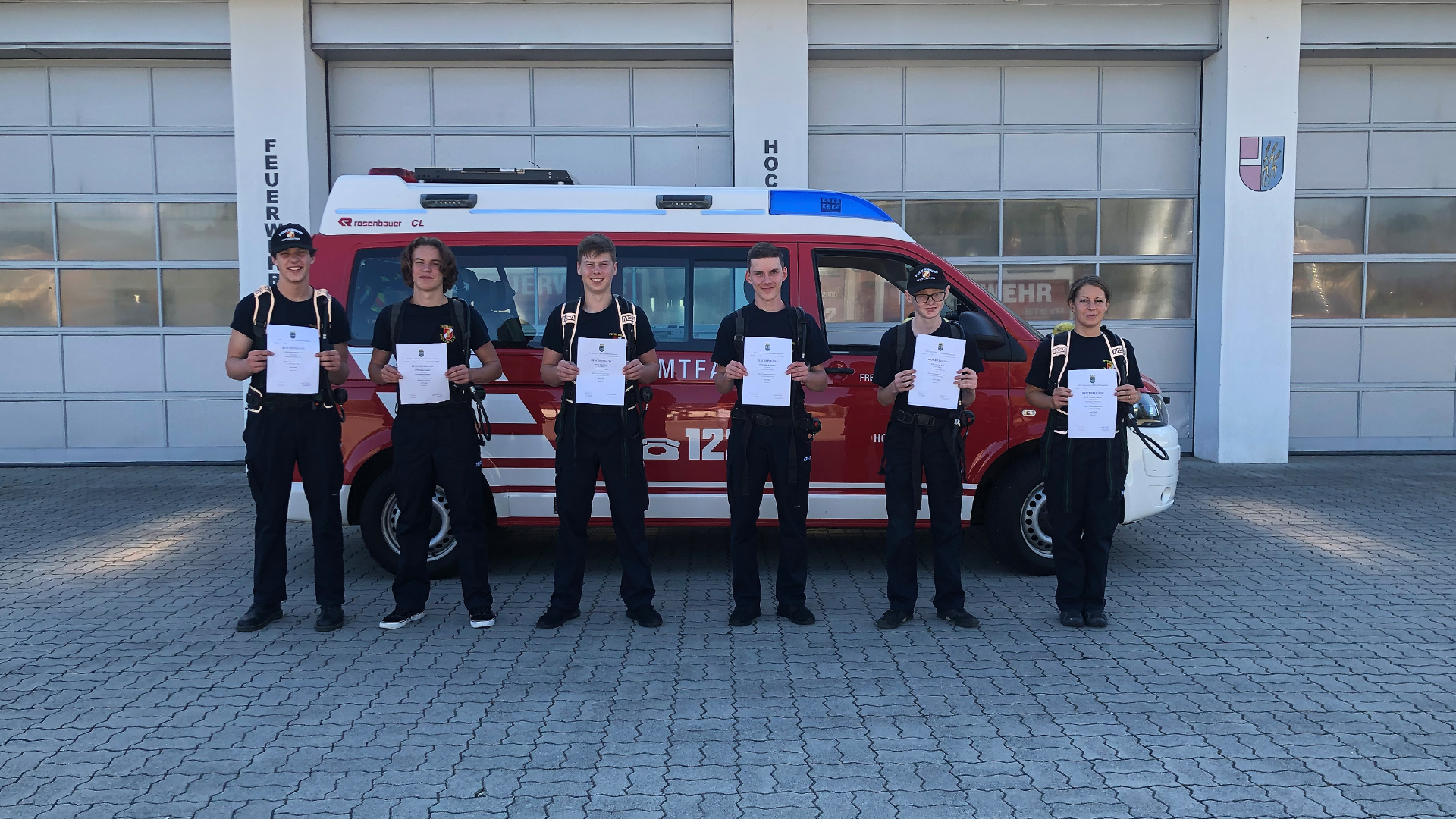 Die Feuerwehr Hochleithen hat seitdem wieder sechs fertig ausgebildete Atemschutzgeräteträger: FM Julian Dengler, FM Benjamin Haertl, FM Andreas Koller, FM Niklas Kreitmeier, FM Cornelia Schmidt und FM Jonas Vogt. Die Feuerwehr Hochleithen gratuliert zur bestandenen Prüfung recht herzlich.