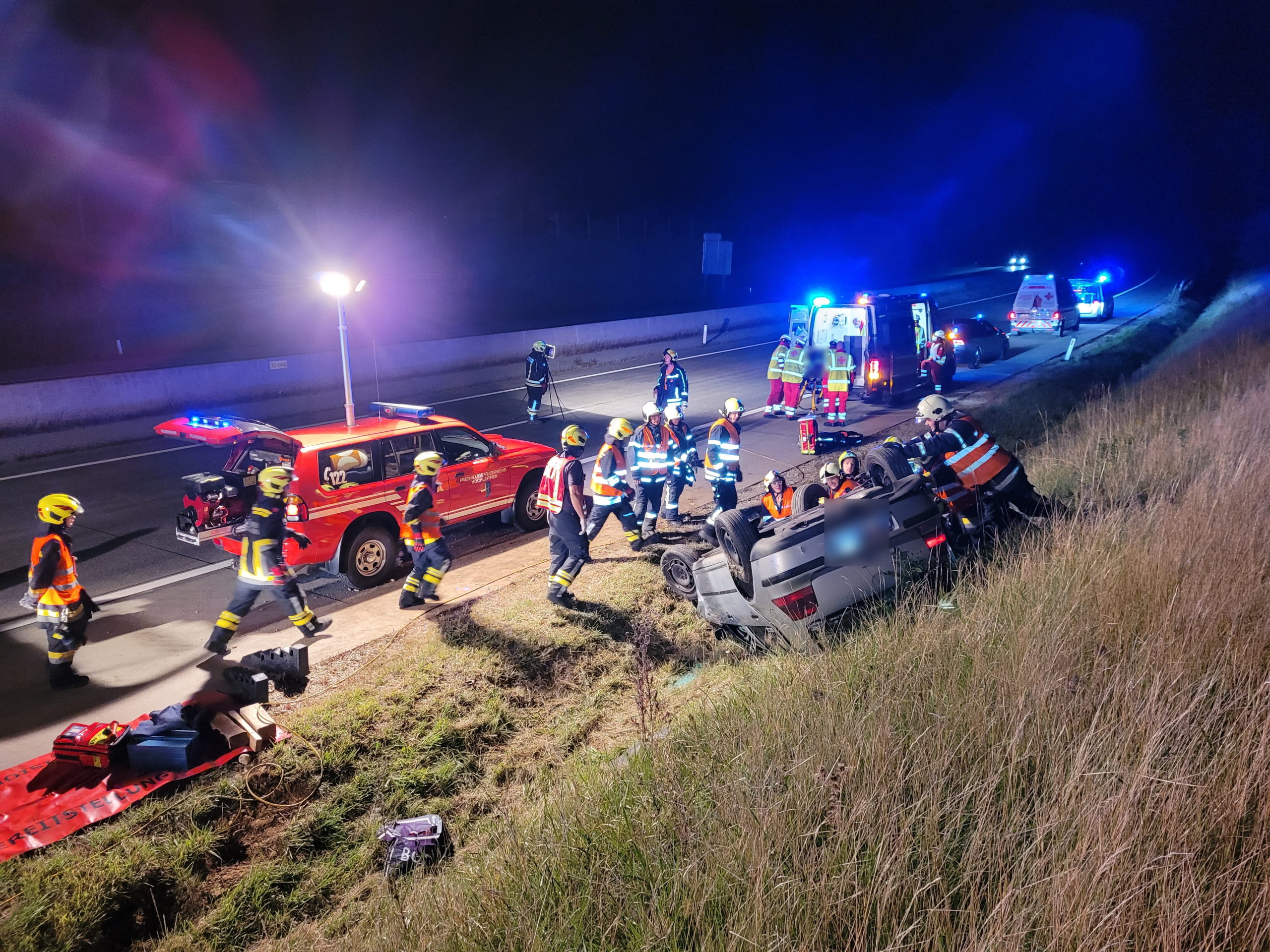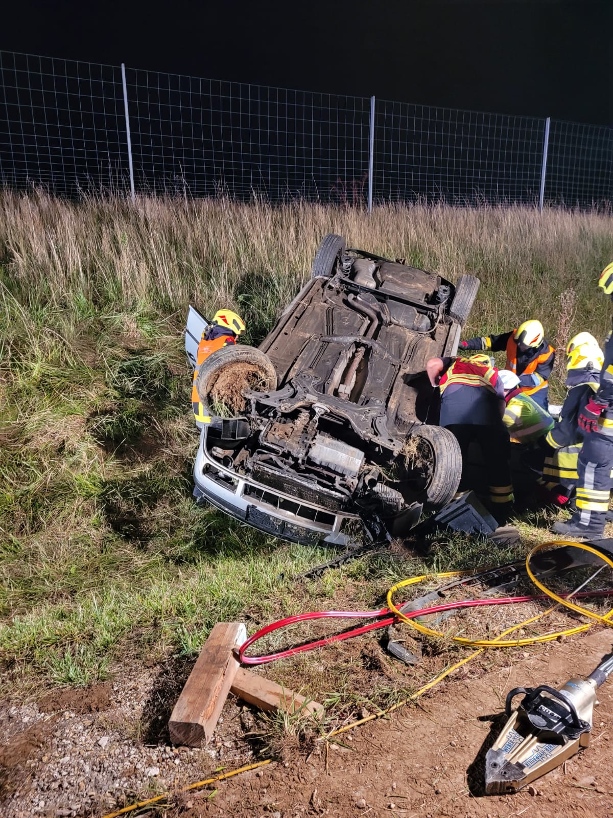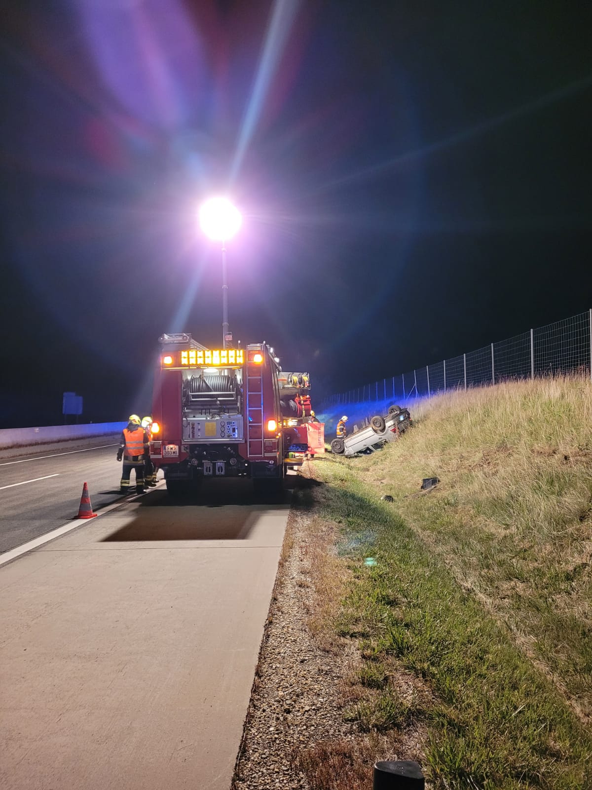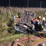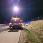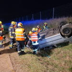 Beim Eintreffen lag ein PKW bei der angrenzenden Böschung auf dem Dach. Nachdem die Fahrzeuglenkerin noch angeschnallt war und damit kopfüber im Gurt hing, wurde sofort eine Menschenrettung durchgeführt. Da von den vor Ort anwesenden Rettungskräften der Notarzthubschrauber nachalarmiert wurde, musste die A5 kurzfristig, durch die Polizei, für die Landung komplett gesperrt werden. Die verletzte Person wurde schlussendlich mit der Rettung ins Landesklinikum Mistelbach-Gänserndorf transportiert. Anschließend halfen wir der FF Wolkersdorf beim Aufrichten und Verladen des verunfallten PKWs und säuberten die verunreinigte Fahrbahn – an dieser Stelle ein herzliches Dankeschön für die reibungslose Zusammenarbeit.
