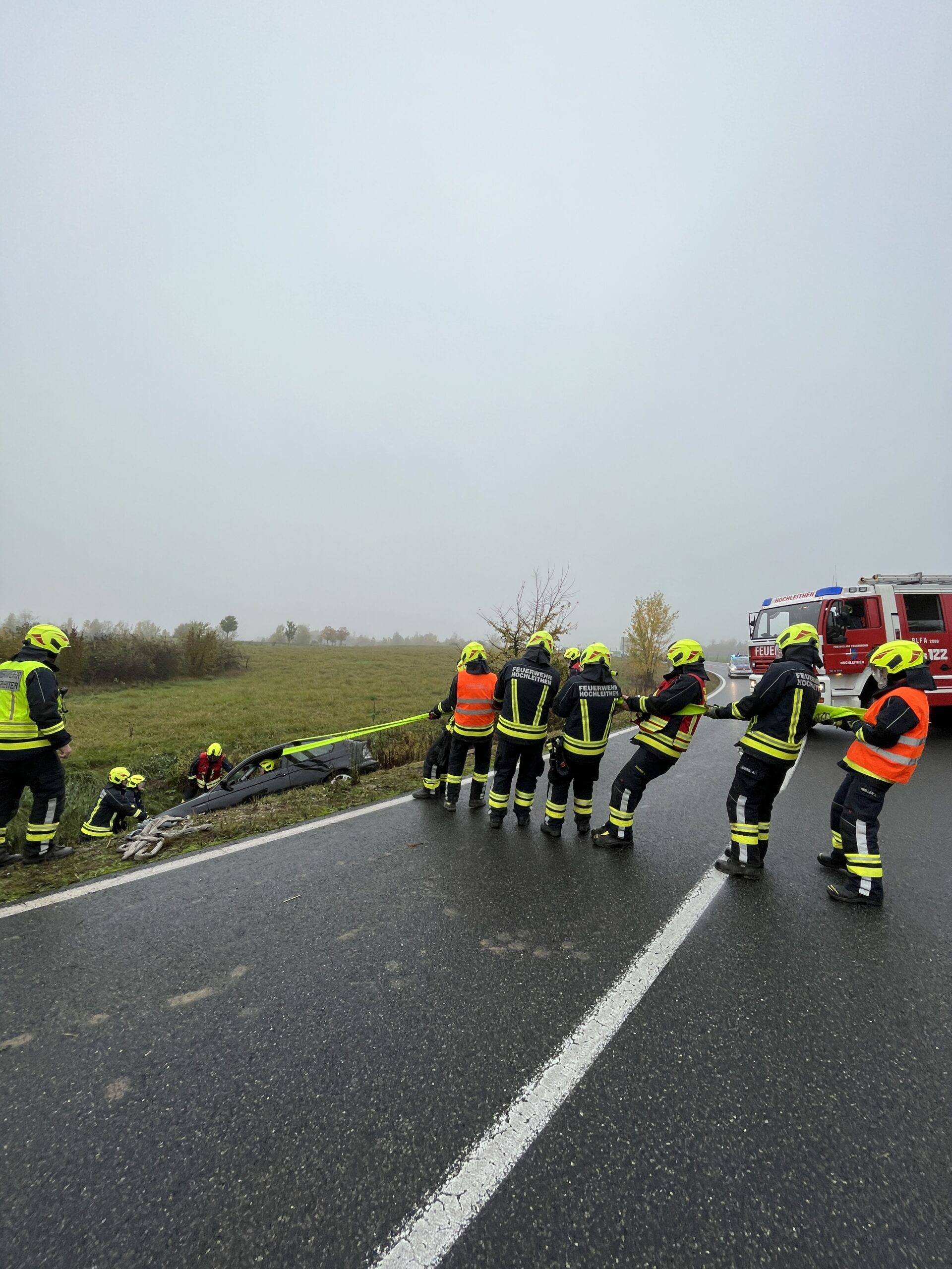 Bei der Unfallstelle angekommen sicherten wir die Einsatzstelle ab und bauten den Brandschutz auf. Aus noch unbekannter Ursache rutschte ein PKW von der Fahrbahn ab und kam im Graben zum Stillstand. Die beteiligten Personen blieben unverletzt.