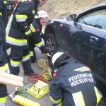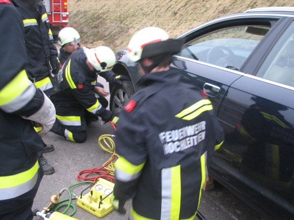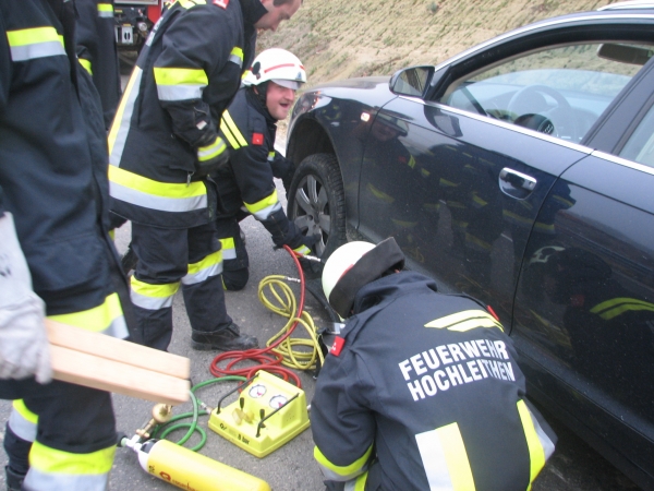 Die Feuerwehr montierte mittels Rettungskissen den Reservereifen, sodass der PKW weiterfahren konnte.