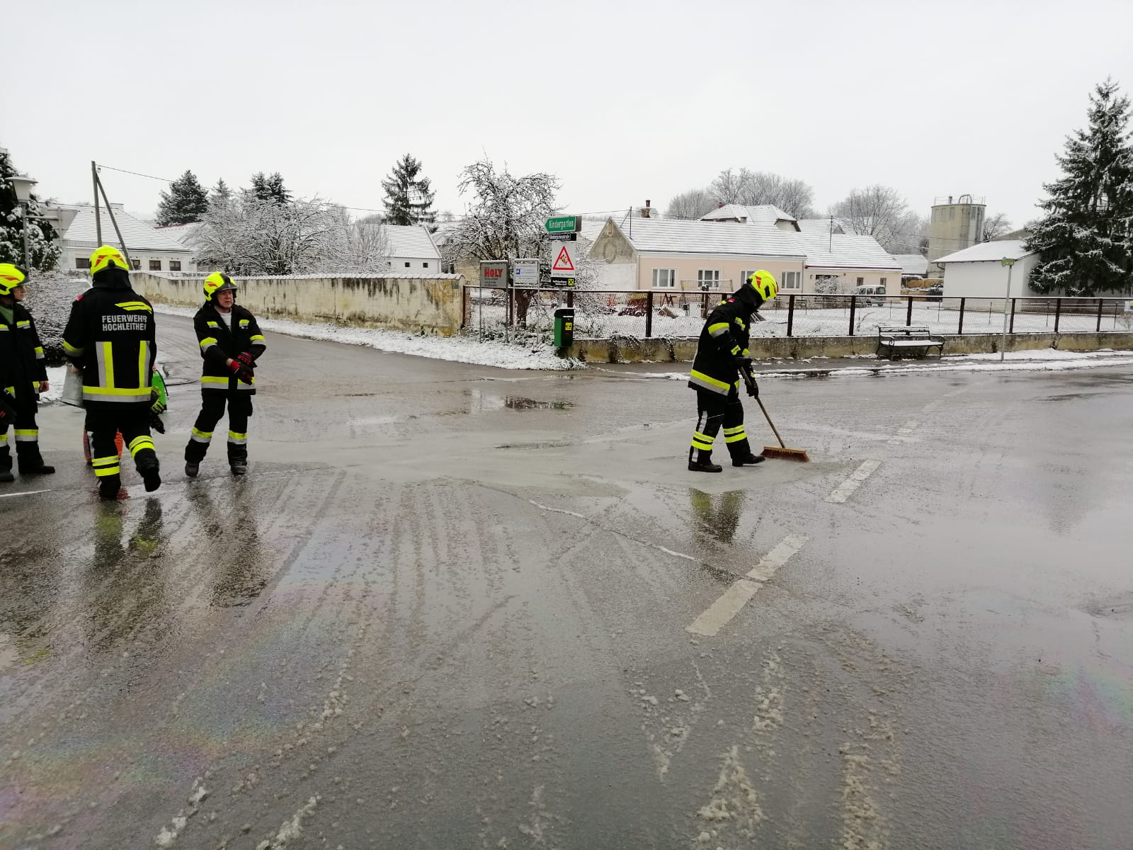 Nachdem die ausgerückten Kameraden am Einsatzort eingetroffen waren, wurde die Säuberung der betroffenen Stellen auch schon in Angriff genommen. Dazu wurde Ölbindemittel aufgetragen und anschließend zusammengekehrt. Nach rund einer Stunde konnten die Arbeiten beendet werden und die Einsatzbereitschaft wiederhergestellt werden.