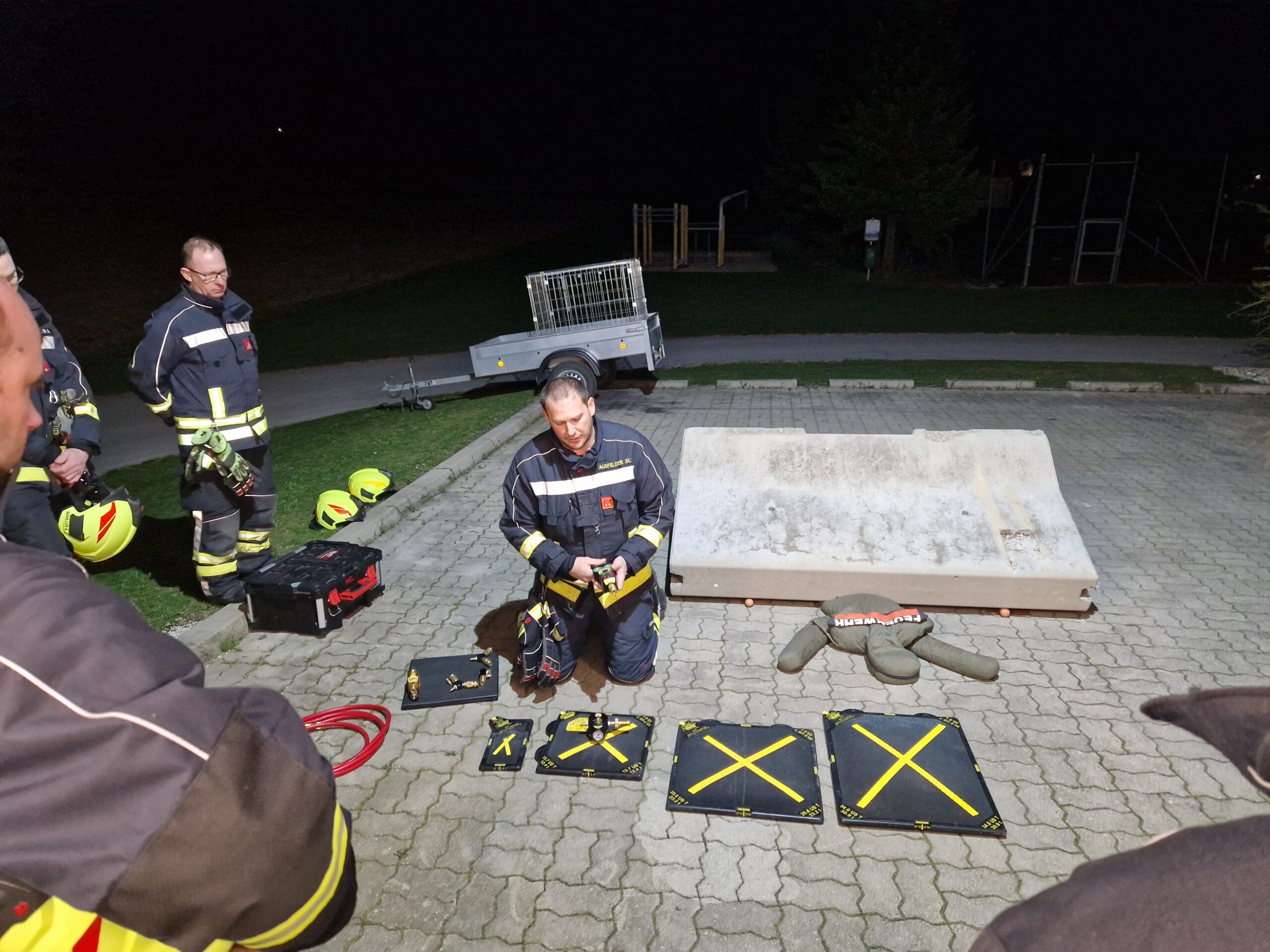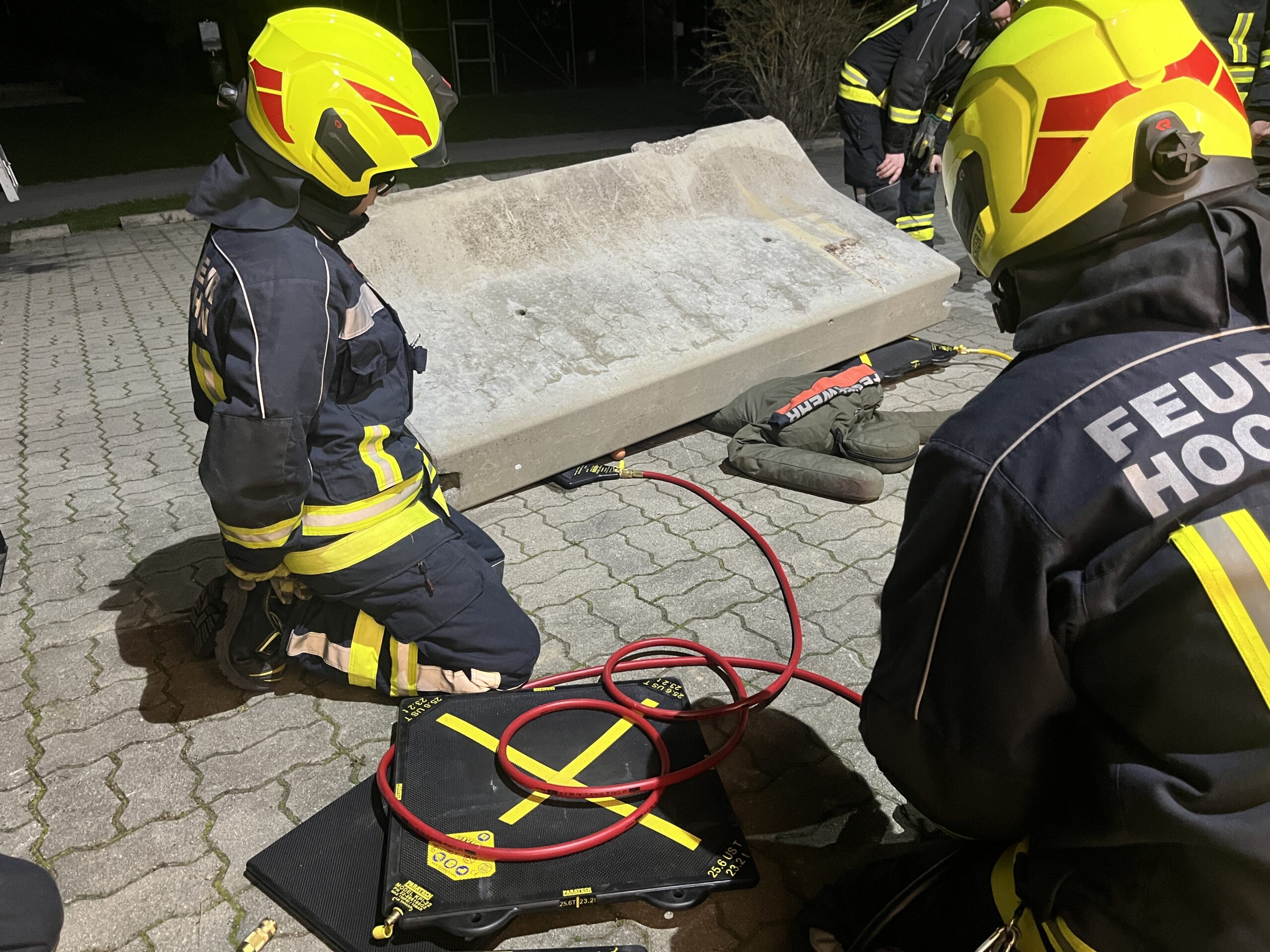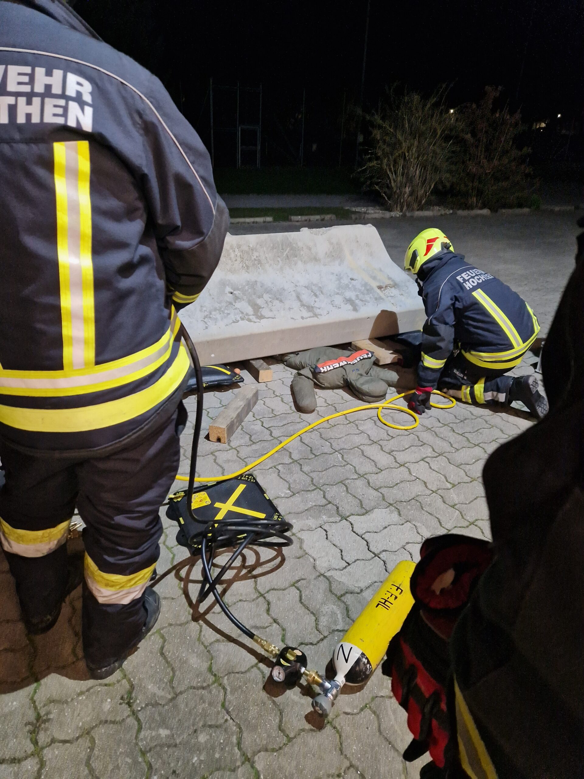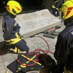 Bei der ersten Station wurde eine Menschenrettung mithilfe eines Dummies simuliert. Die Übungspuppe wurde dafür unter einer Betonschutzwand platziert. Geschult wurde hierbei der gezielte Einsatz von Hebemitteln und Unterleghölzern bei der Menschenrettung einer eingeklemmten Person.