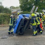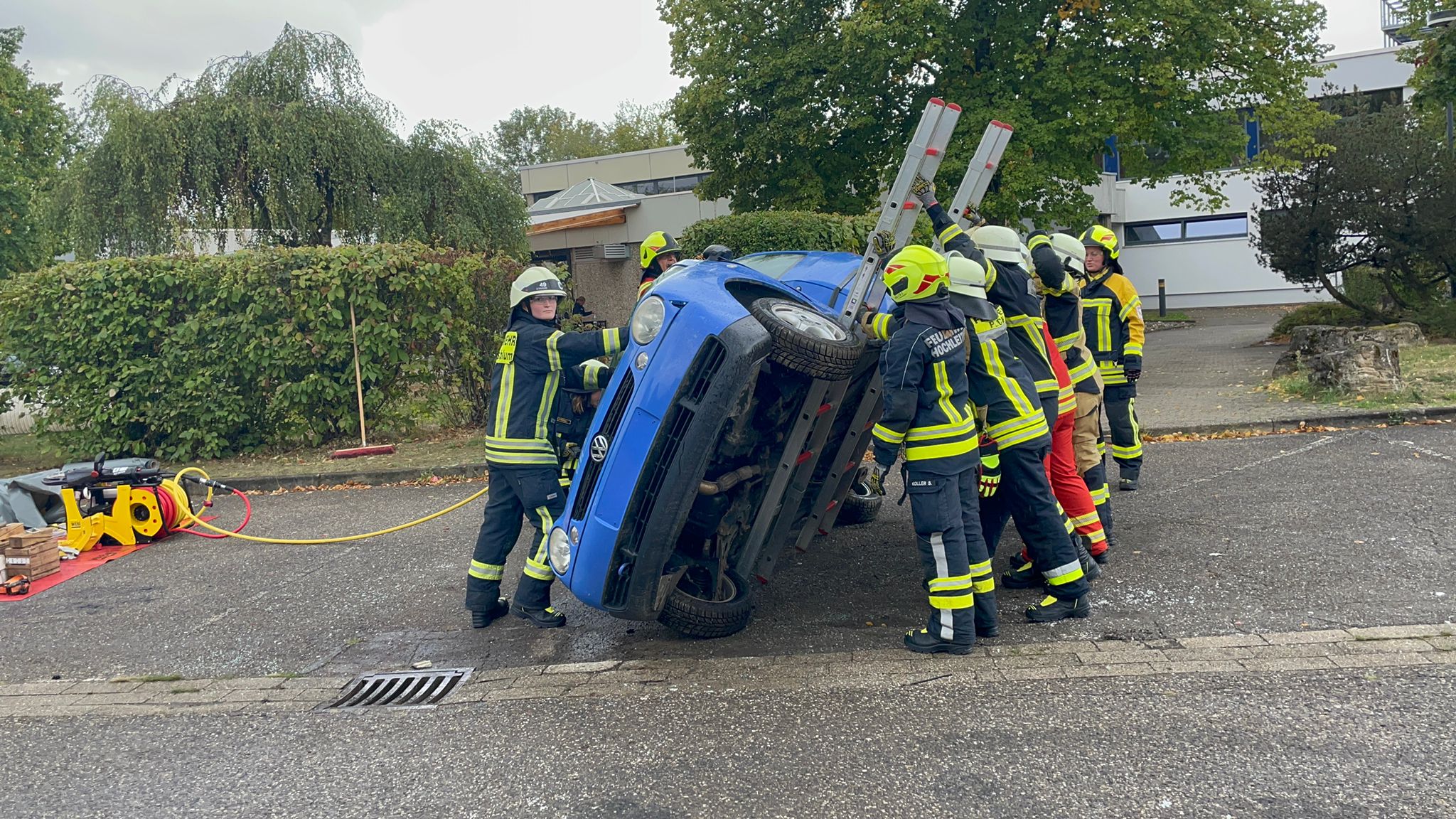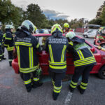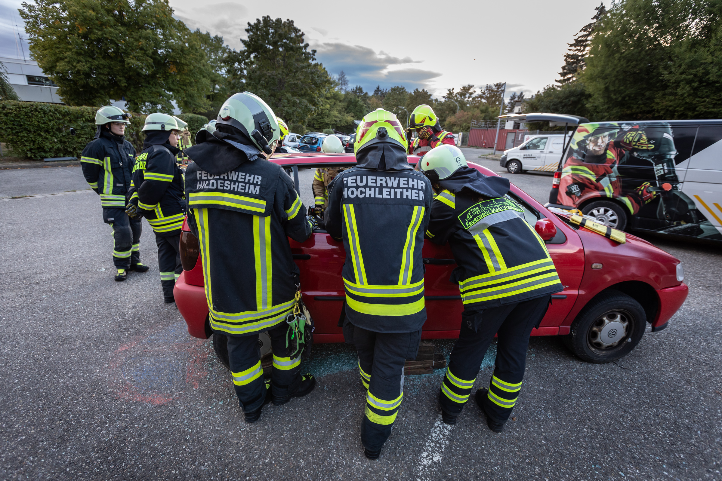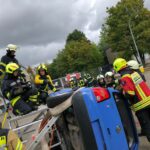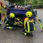 In kleinen Gruppen wurden 3 Situationen behandelt. Das Unfallfahrzeug stand somit einmal auf allen vier Reifen, einmal lag es seitlich und einmal auf dem Dach. Ziel der Übung war es, möglichst effektiv und mit neuen Methoden die verunfallte Person schonend zu befreien.
