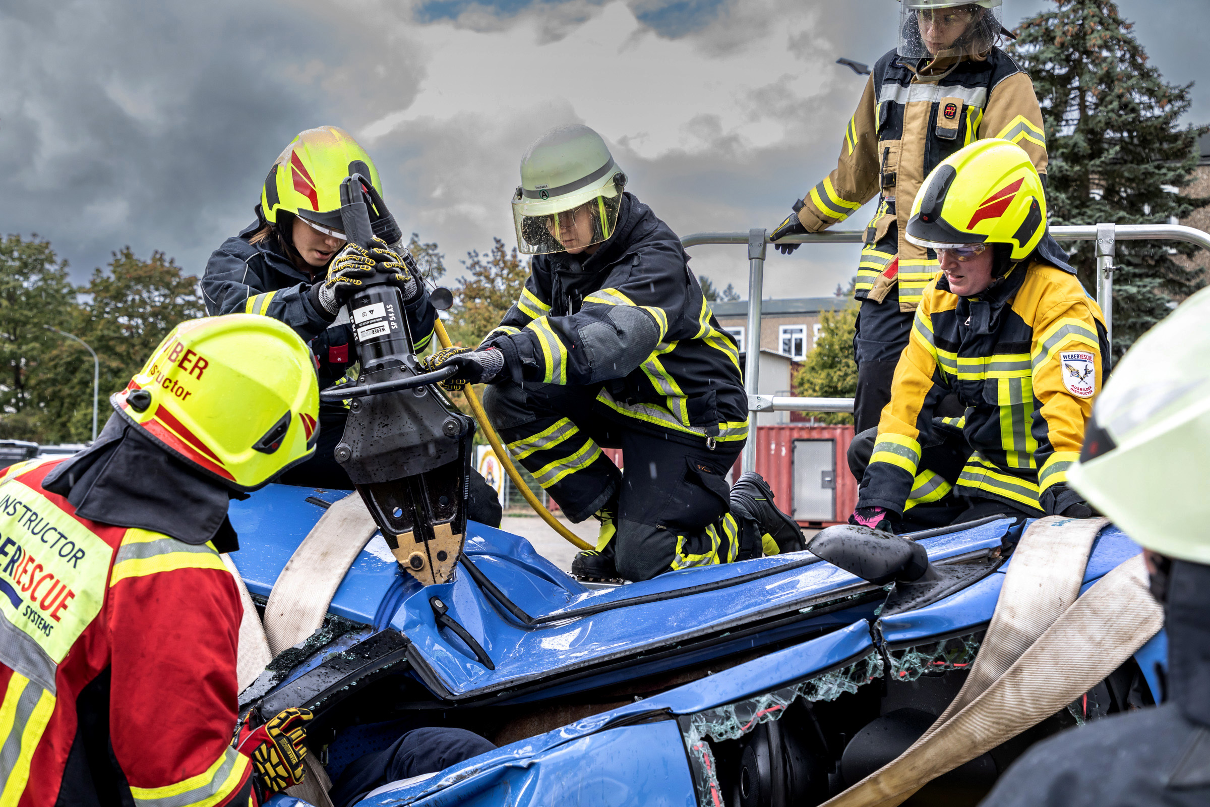 Dort angekommen, lernte sie mit den aktuellsten Werkzeugen für den Feuerwehrgebrauch neue Herangehensweisen und Taktiken zum Thema Menschenrettung aus einem Unfallfahrzeug kennen.
