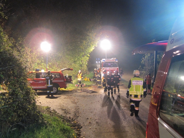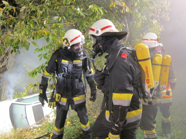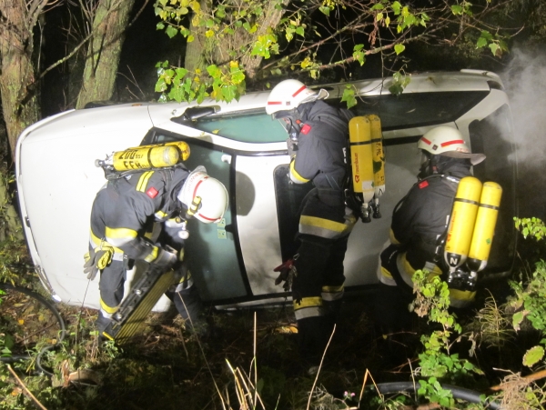Annahme war, dass eine verletzte Person nach einem Überschlag im PKW eingeklemmt war. Zusätzlich kam hinzu, dass der PKW zu brennen beginnen drohte.