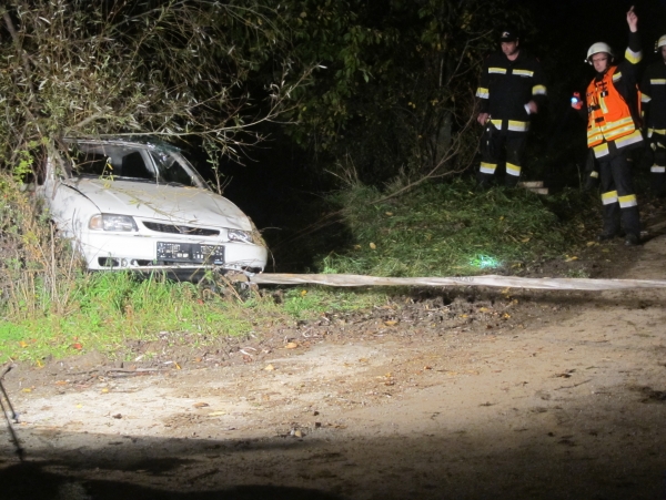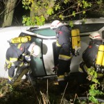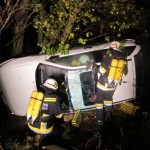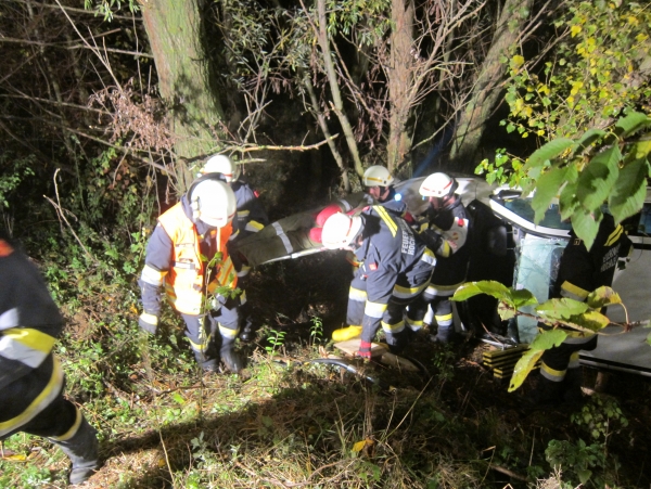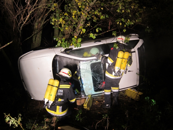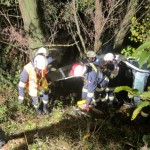 Unter Atemschutz wurde die verletzte Person gerettet und anschließend das Fahrzeug mittels Seilwinde geborgen.