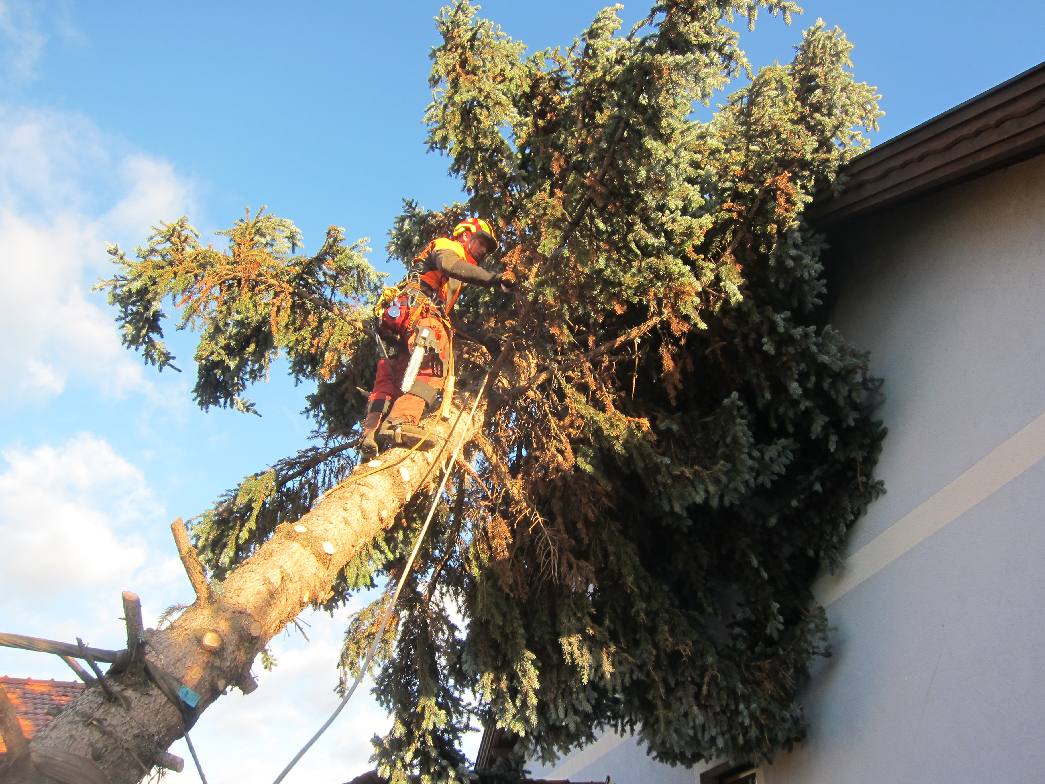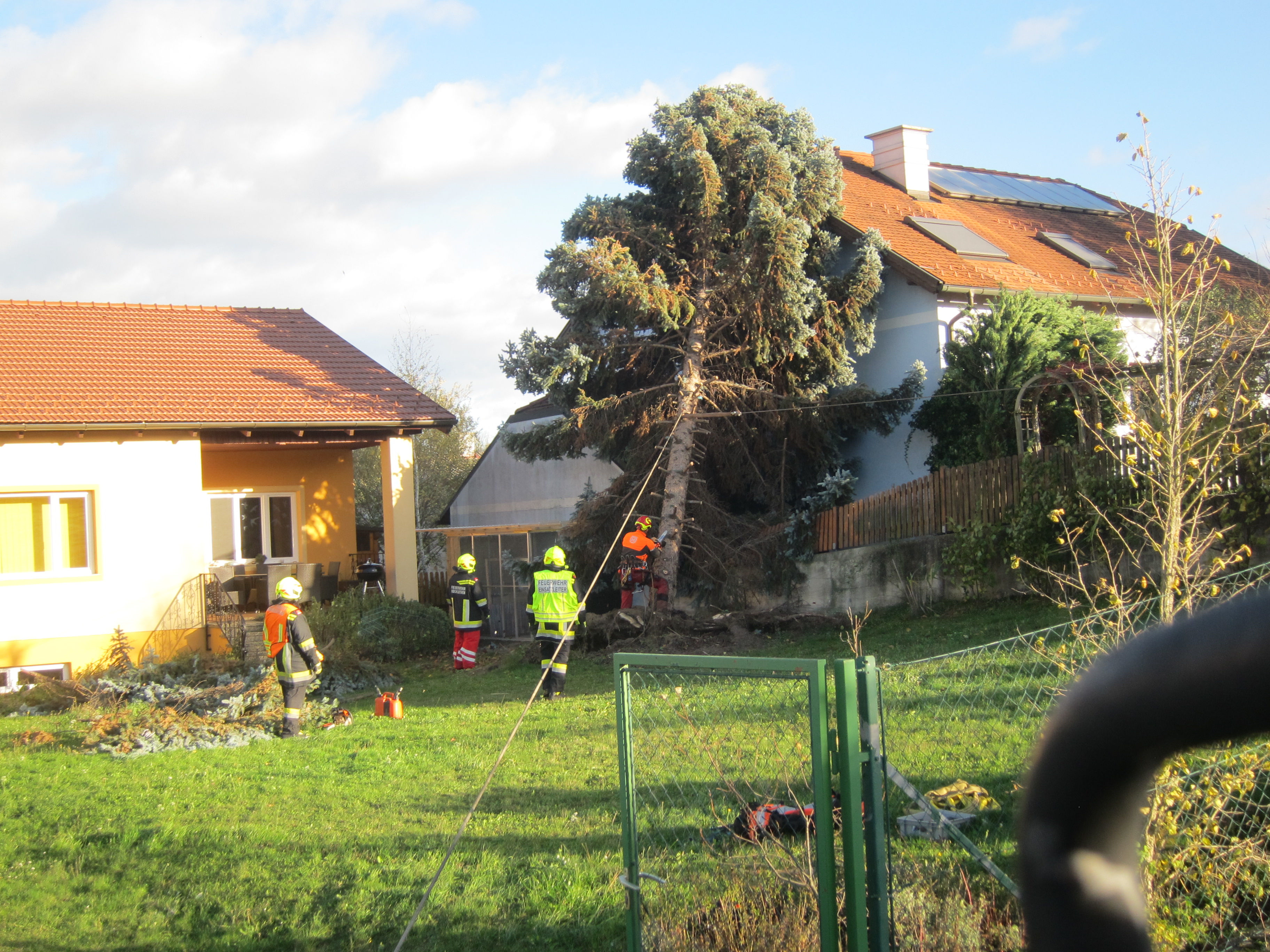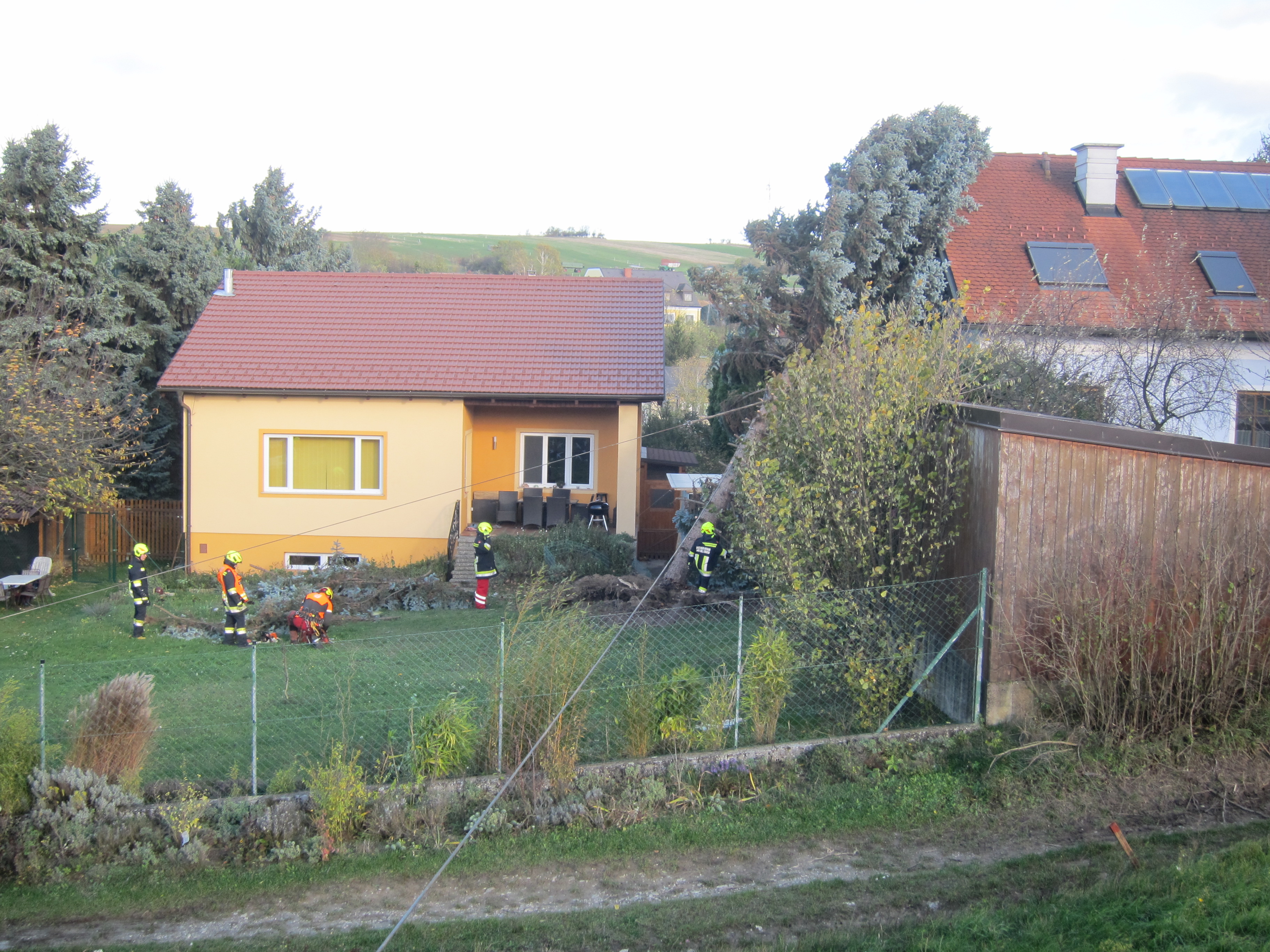 In der Kellergasse wurde durch die heftigen Windböen ein Baum entwurzelt und stürzte auf ein Haus. Nach der ersten Lageerkundung begannen die Kameraden mit der Sicherung des Baumstammes. Um dem Wind die Angriffsfläche zu nehmen, entästeten wir den Stamm sukzessive und konnten den Baum schließlich knapp unterhalb der Spitze mit einer Endlosschleife sichern beziehungsweise mittels Seilwinde aufziehen. Trotz des heftigen Sturms und Regens landete der Baum wieder im ursprünglichen Garten.