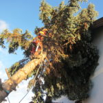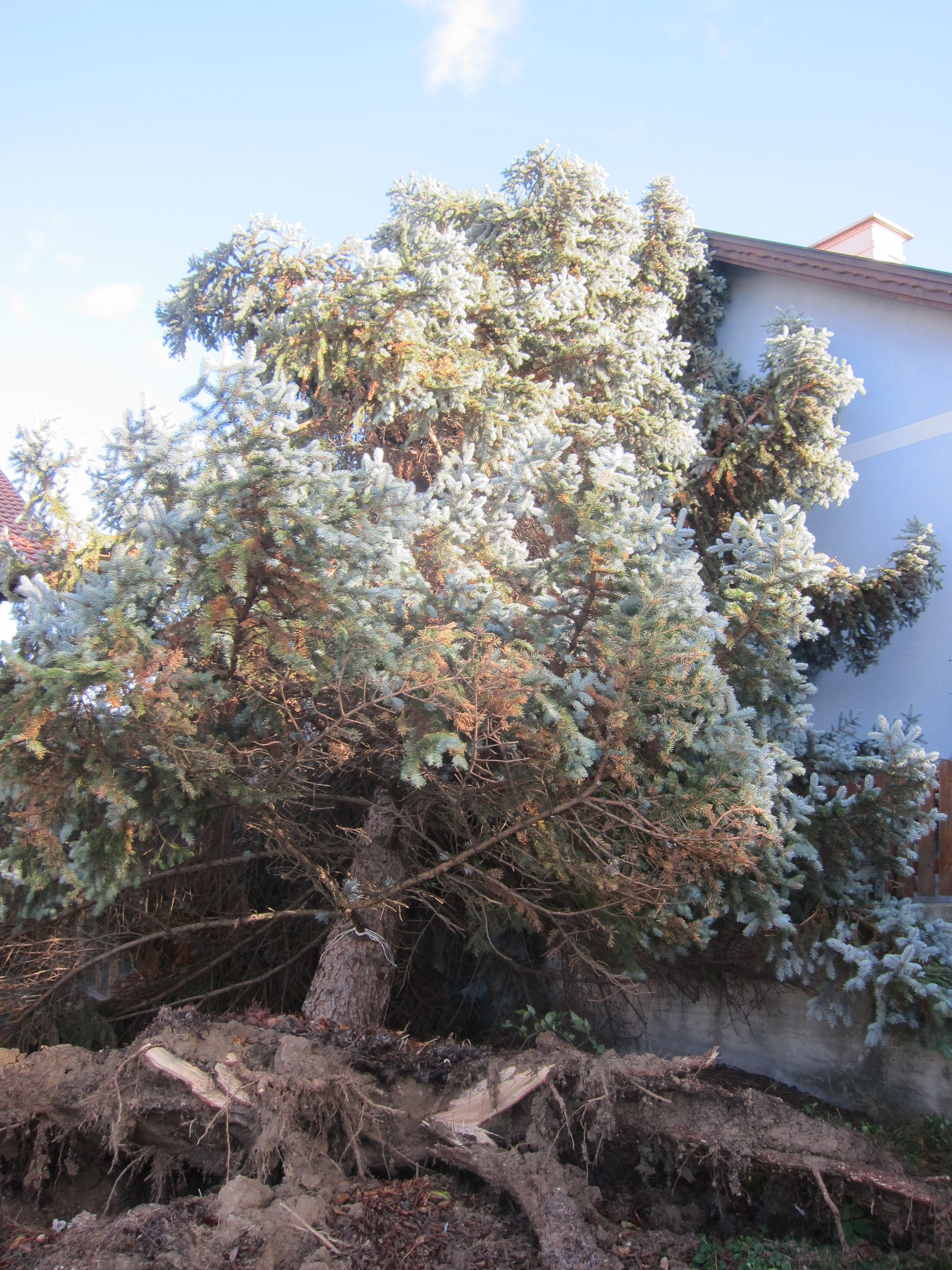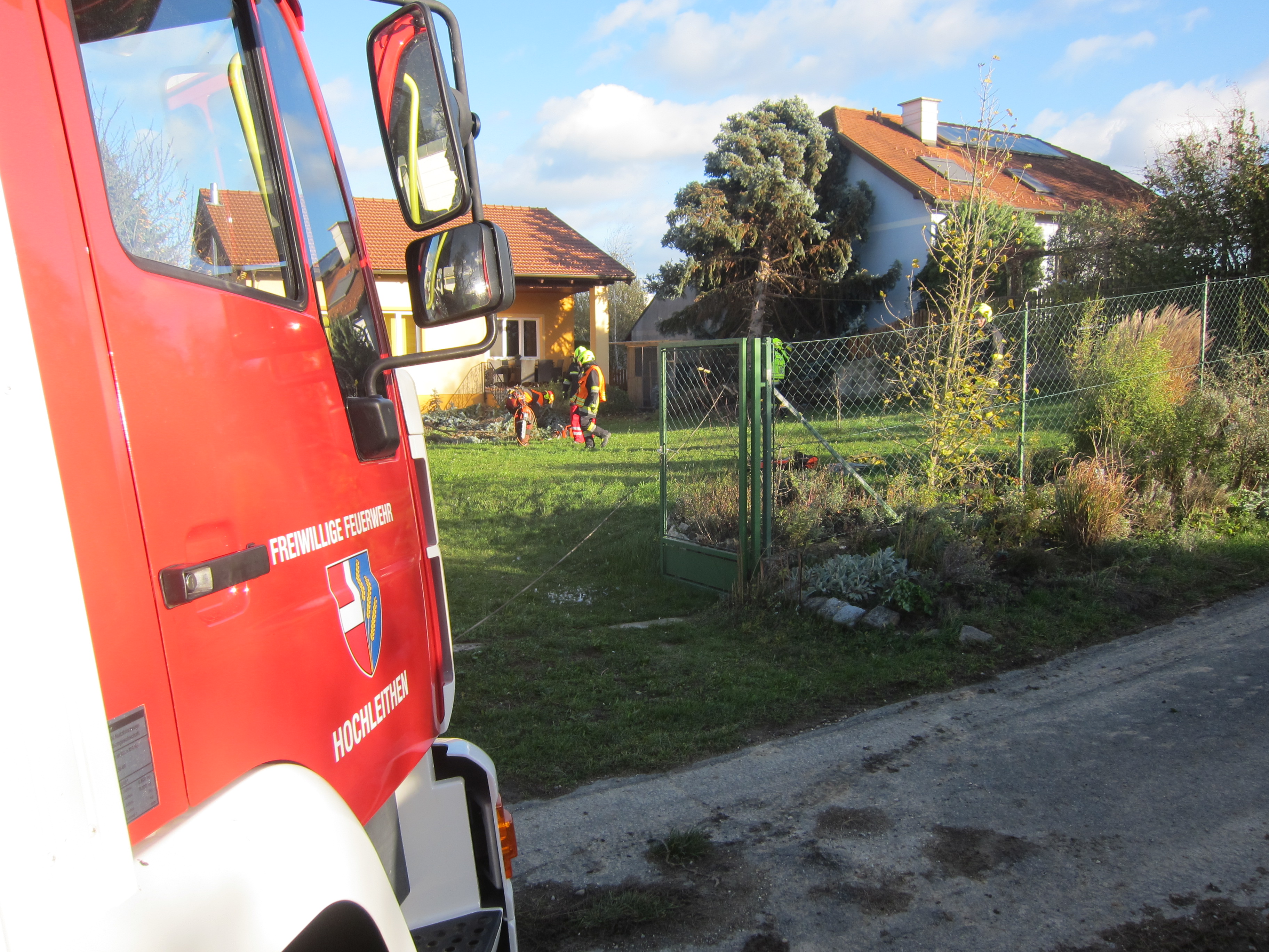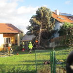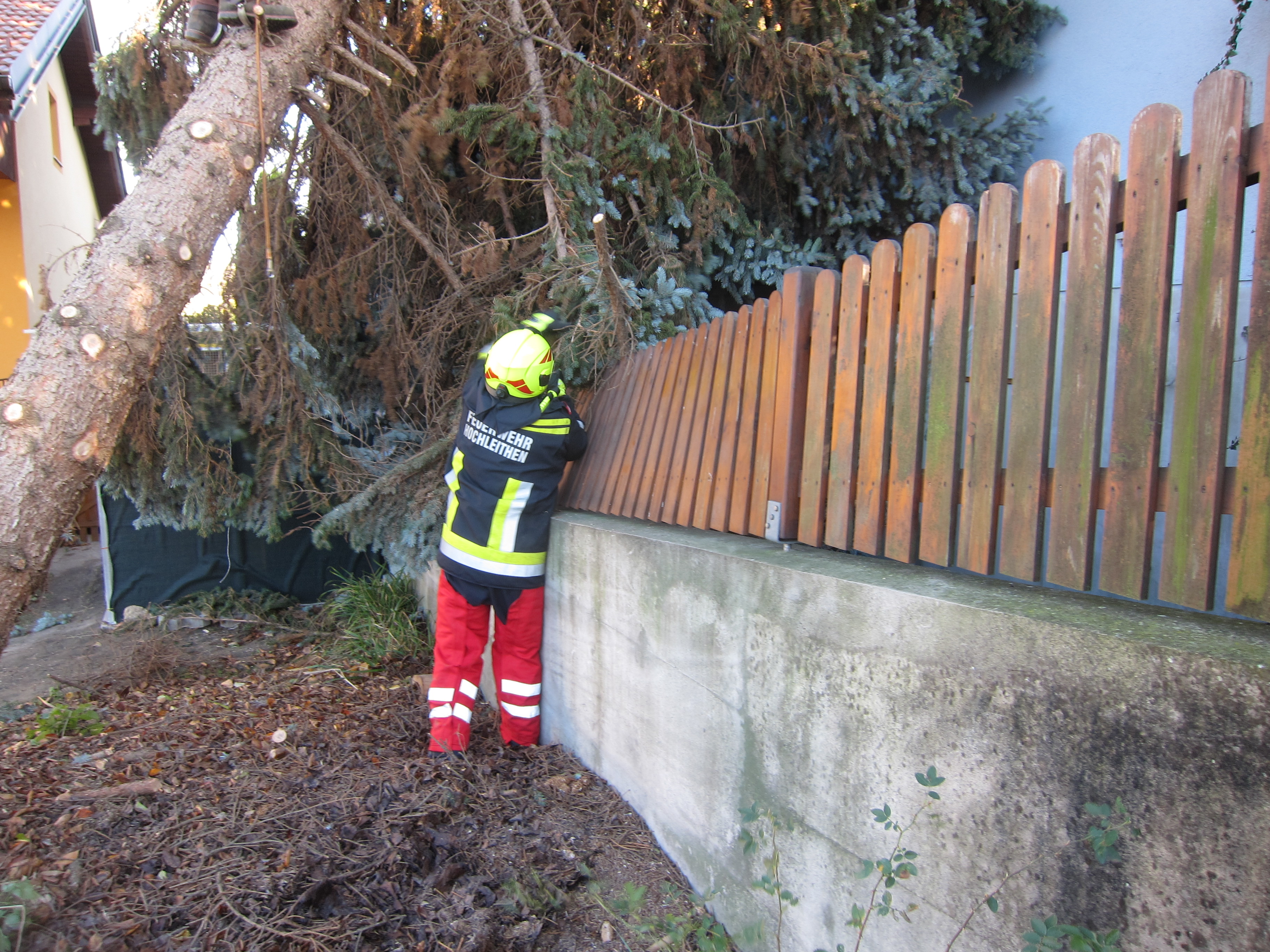 In der Kellergasse wurde durch die heftigen Windböen ein Baum entwurzelt und stürzte auf ein Haus. Nach der ersten Lageerkundung begannen die Kameraden mit der Sicherung des Baumstammes. Um dem Wind die Angriffsfläche zu nehmen, entästeten wir den Stamm sukzessive und konnten den Baum schließlich knapp unterhalb der Spitze mit einer Endlosschleife sichern beziehungsweise mittels Seilwinde aufziehen. Trotz des heftigen Sturms und Regens landete der Baum wieder im ursprünglichen Garten.