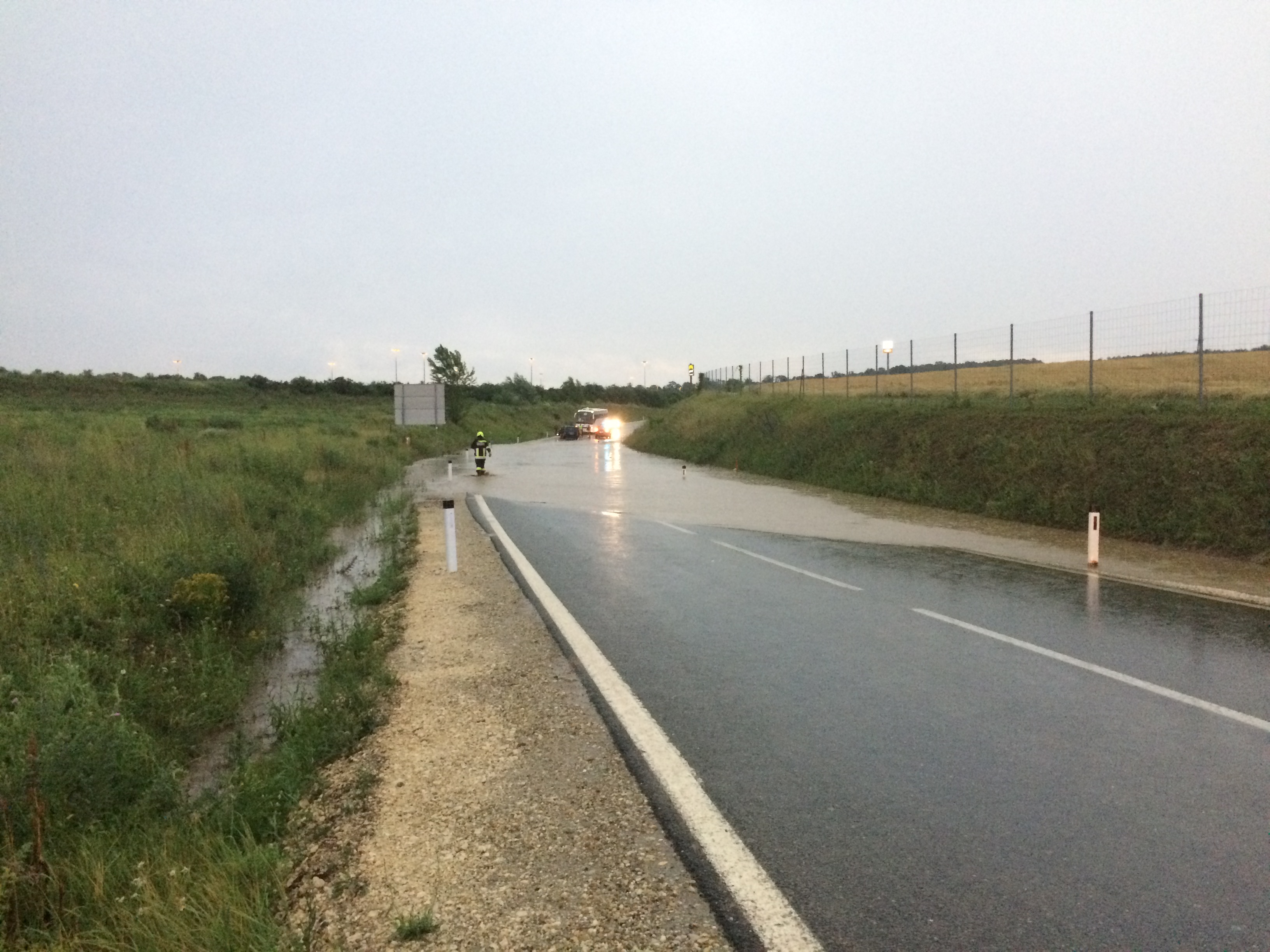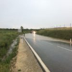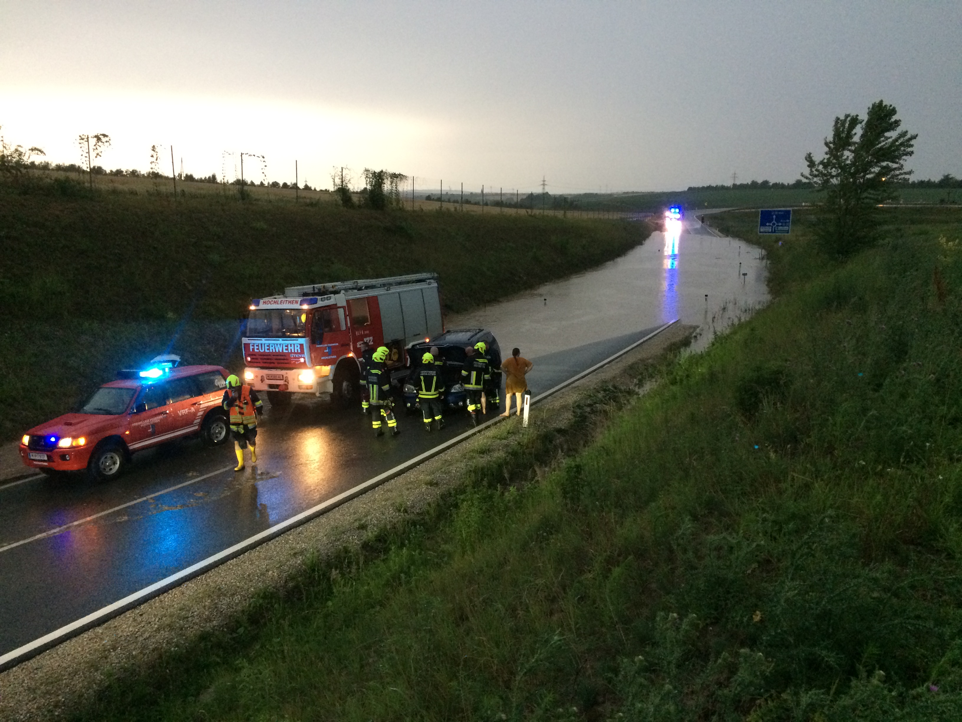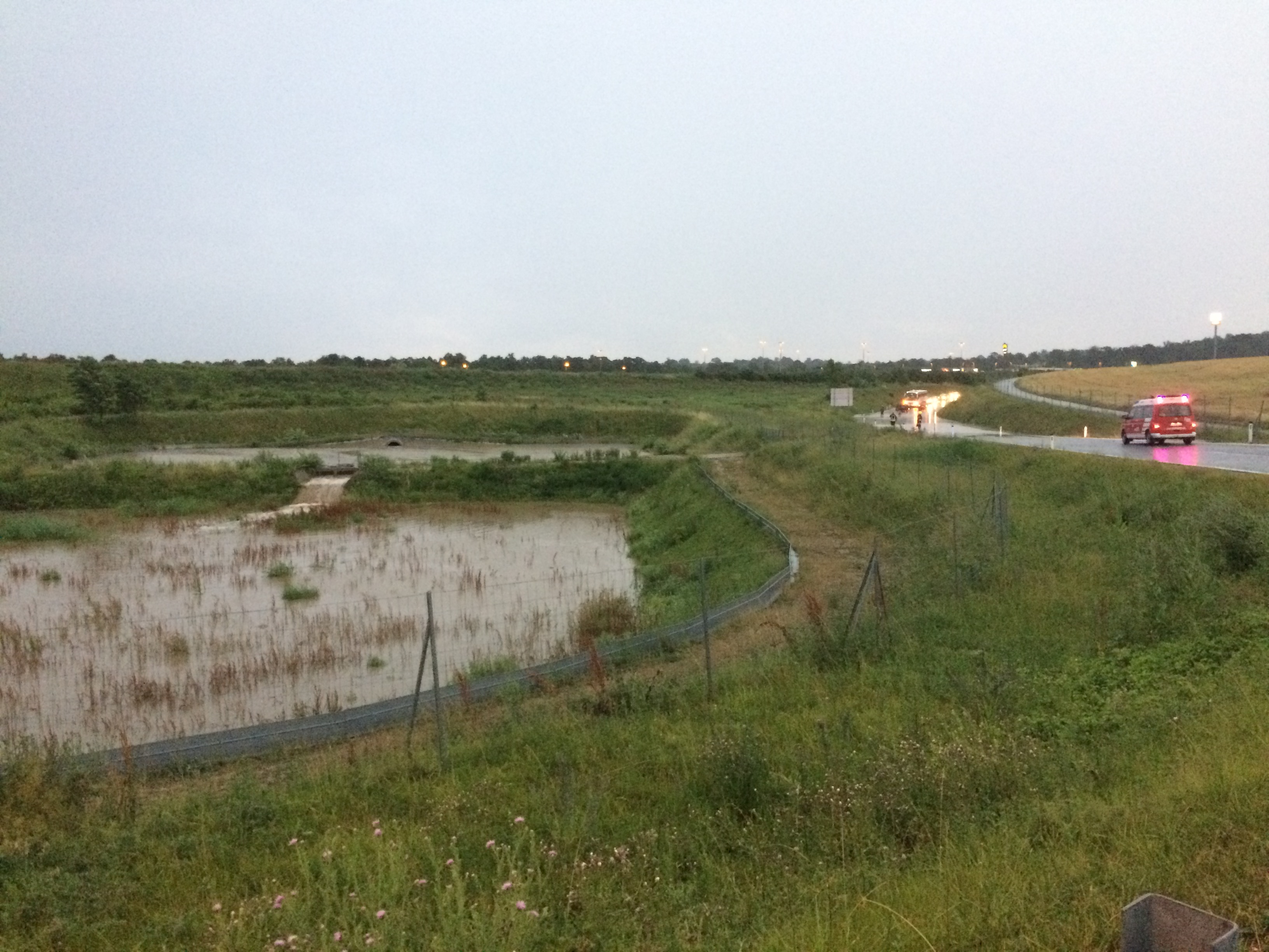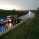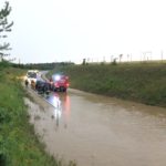 Dabei konnten wir wiederum schwere Überschwemmungen in der Triftstraße und auf der B7, neben den Auffangbecken feststellen. Hierbei kamen wir gerade rechtzeitig um eine Familie in ihrem PKW vor den Wassermassen zu retten. Bei der Durchquerung der überfluteten Straße kam das Auto aufgrund eines technischen Defekts zum Stillstand und die Insassen wurden von dem steigenden Wasserpegel eingeschlossen. Mittels Endlosschleife schleppten wir das Fahrzeug aus der Gefahrenzone und stellten es gesichert ab.