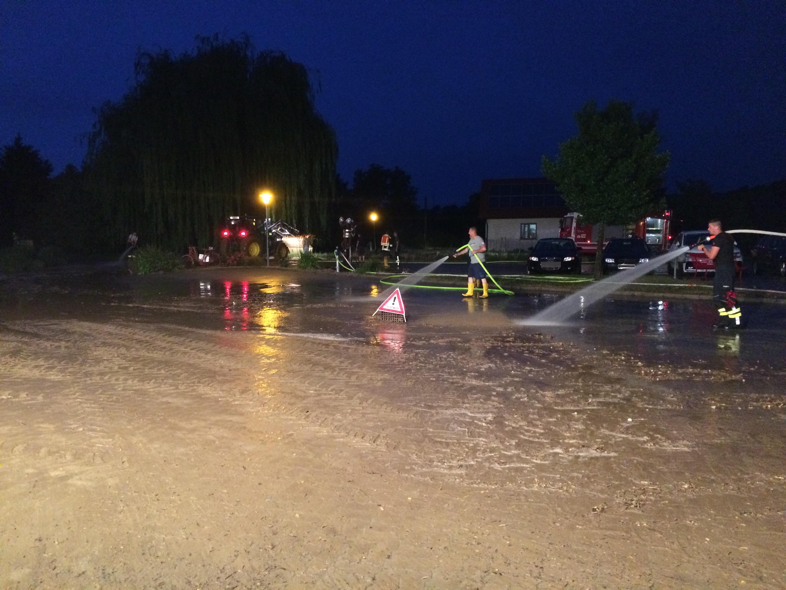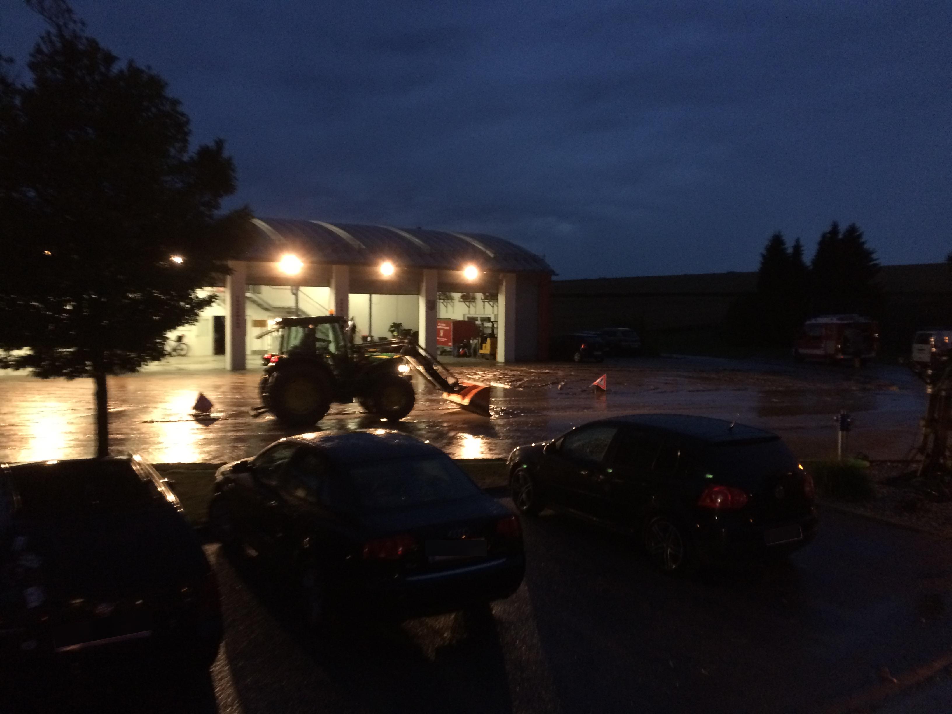 Anschließend mussten wir auch noch vor unserer eigenen Haustüre kehren. Der Starkregen überschwemmte den Vorplatz des Feuerwehrhauses mit großen Schlammmassen. Die Gemeinde stellte für die Aufräumarbeiten  dankenswerter Weise den Traktor zur Verfügung. Zusätzlich reinigten wir den Platz mittels zwei C-Rohren. Nach einem anstrengenden Tag konnten wir schlussendlich gegen Mitternacht unsere Arbeiten beenden.
