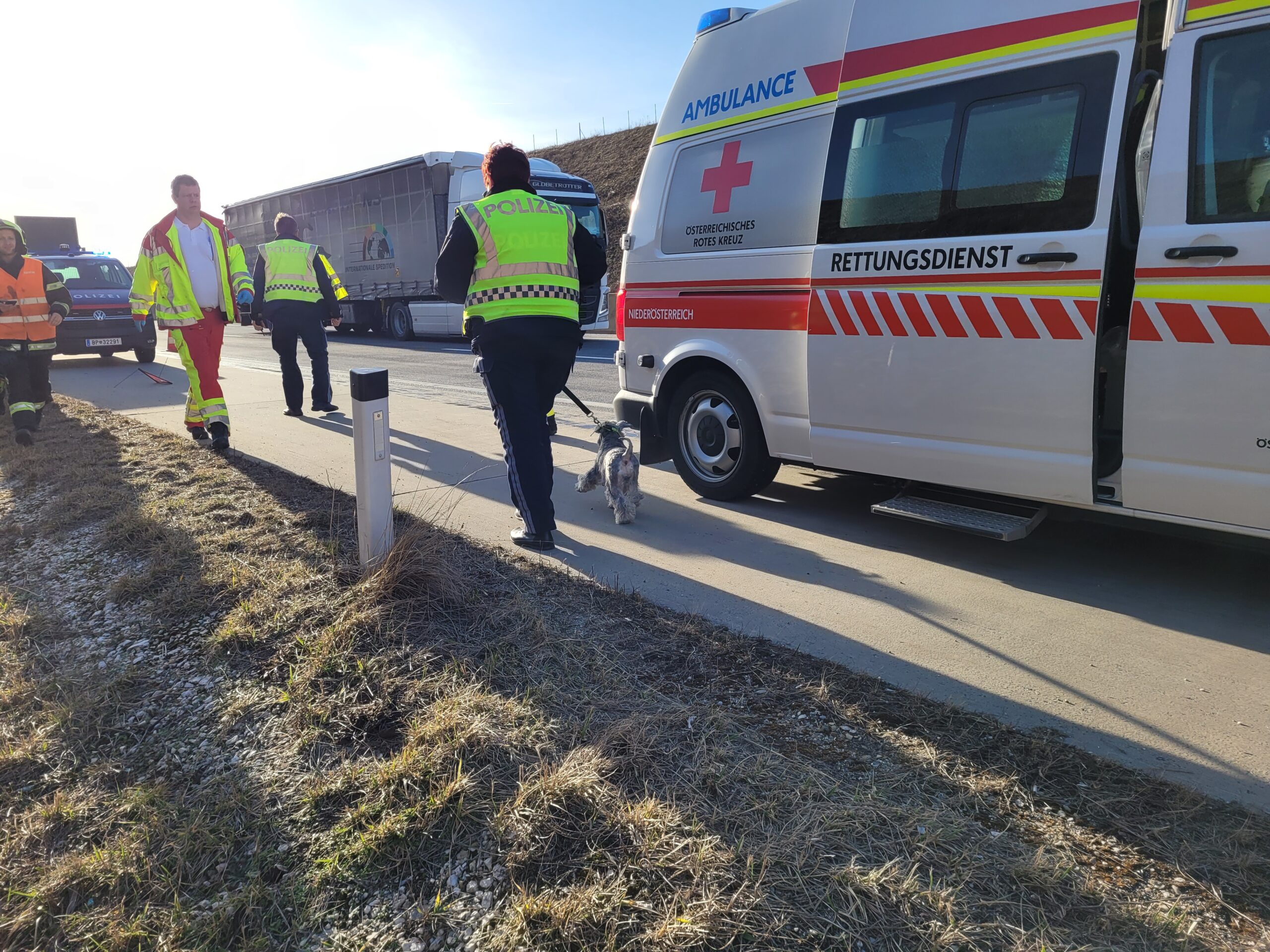 Um 14:46 Uhr wurden wir mittels Funkmeldeempfänger und BlaulichtSMS zu einem Verkehrsunfall auf die A5 in Fahrtrichtung Brünn alarmiert.