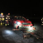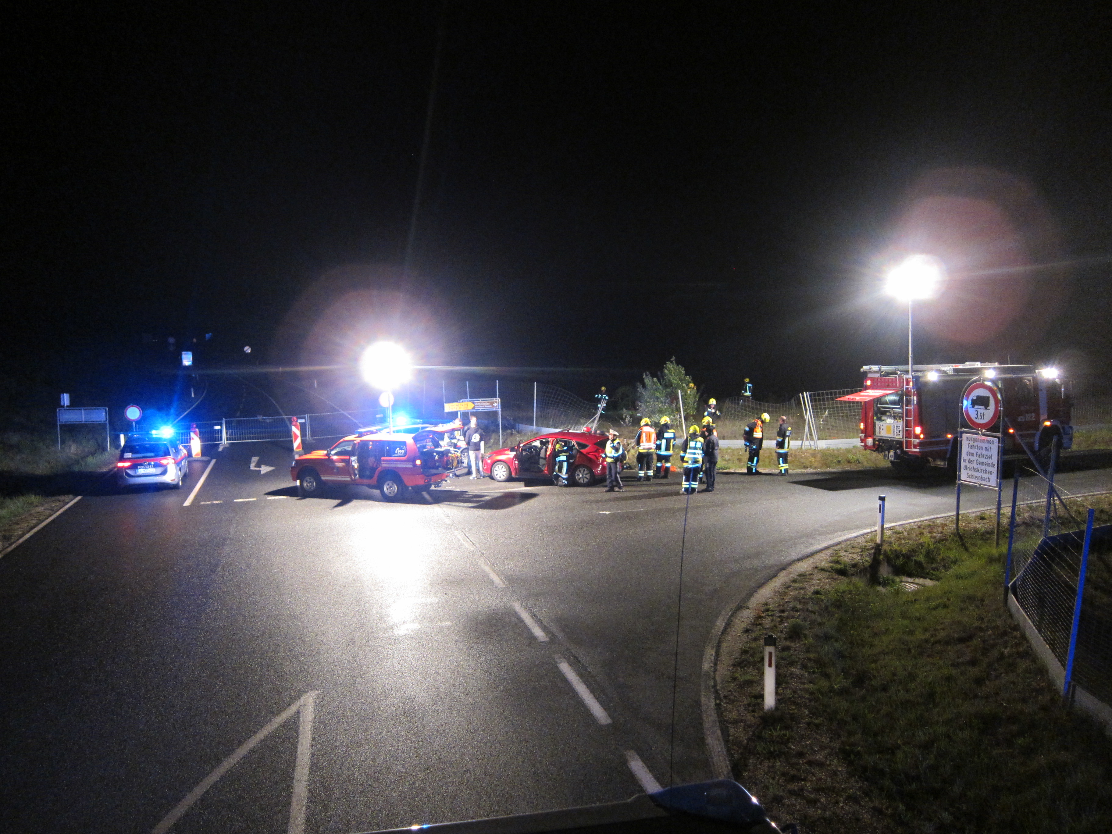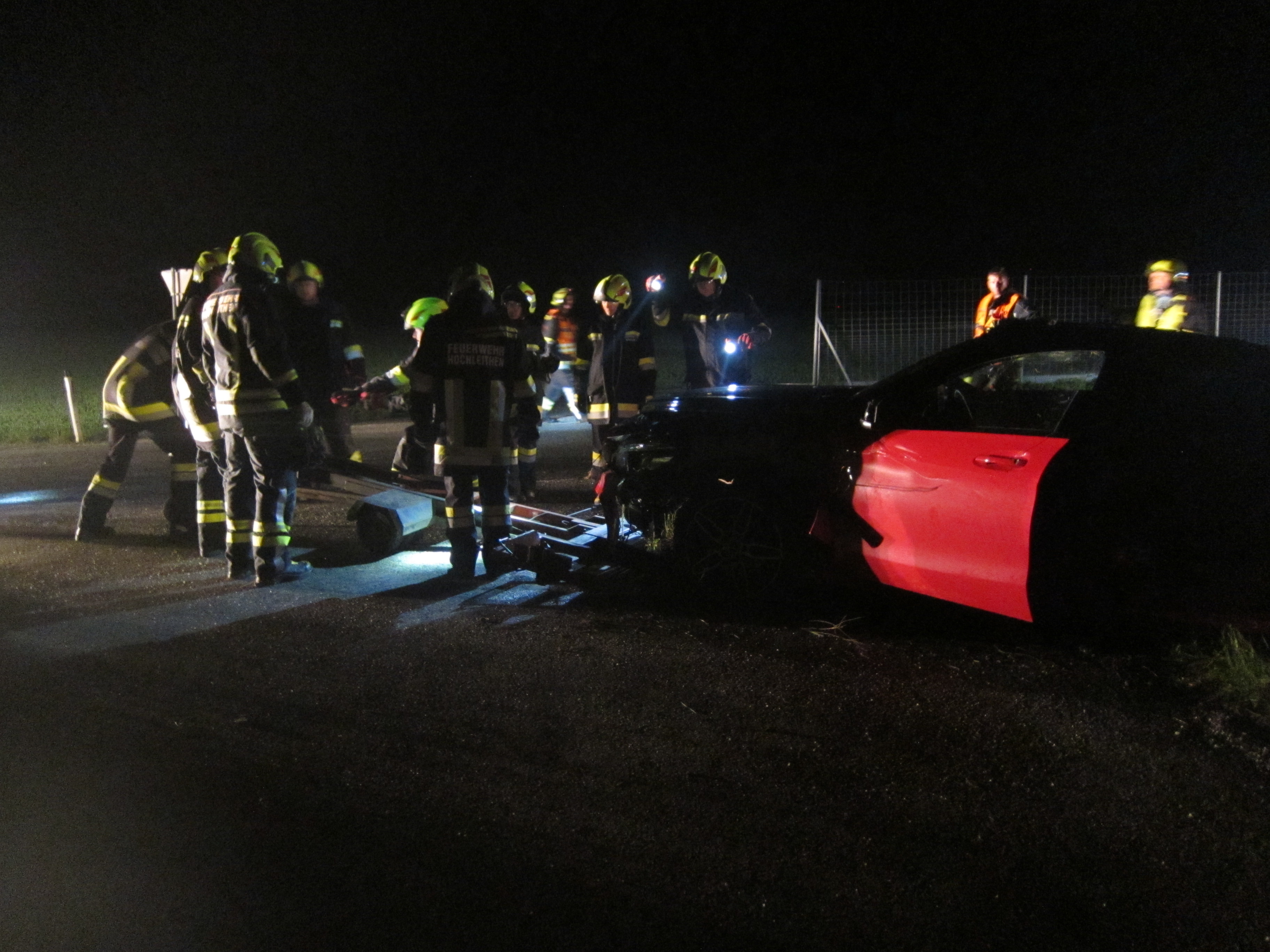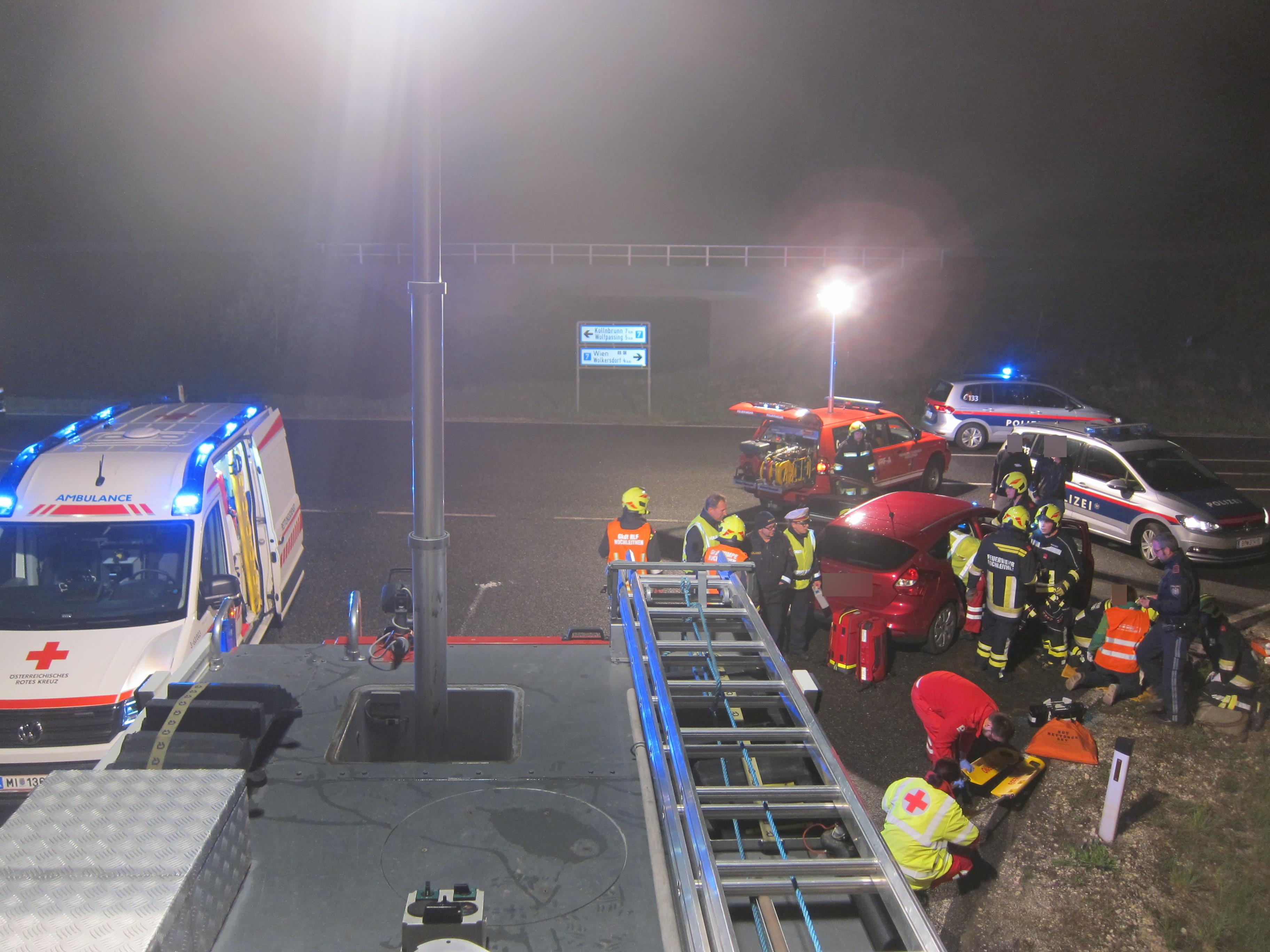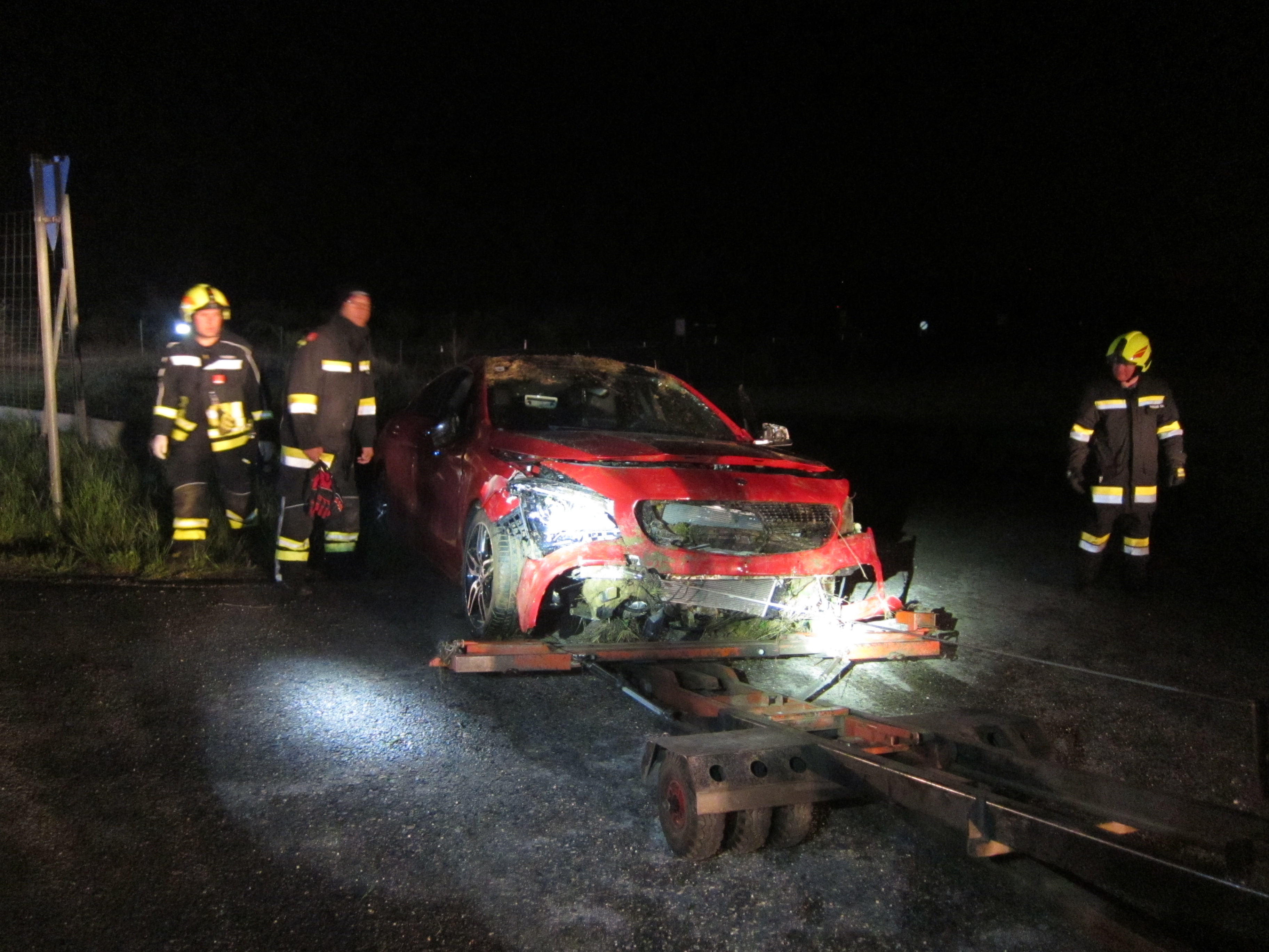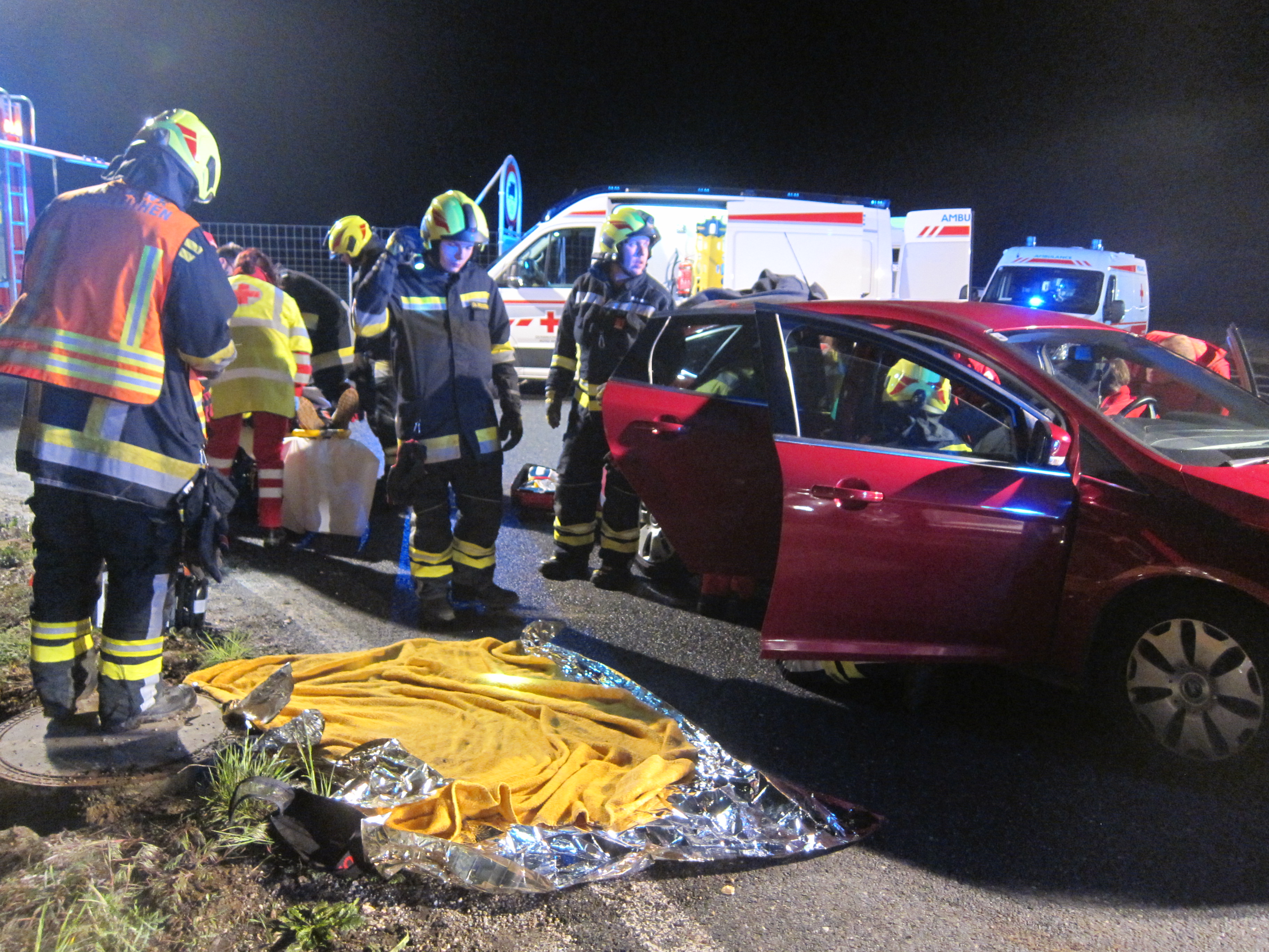 Als das Vorausfahrzeug am Unfallort eintraf, war noch keine Rettungsmannschaft anwesend. Da die verletzten Personen sich bereits selbständig aus dem Auto befreien konnten, übernahmen wir sofort die Erstversorgung der Unfallbeteiligten. Dazu stabilisierten wir die beiden Insassen. Als eine Person außerdem über starke Rückenschmerzen klagte, legten wir zusätzlich ein Stifneck an, um eventuelle Verletzungen der Halswirbelsäule zu vermeiden. Kurz danach traf auch das Rote Kreuz ein, mit dem wir gemeinsam den Verletzten auf eine Vakuummatratze umlagerten.