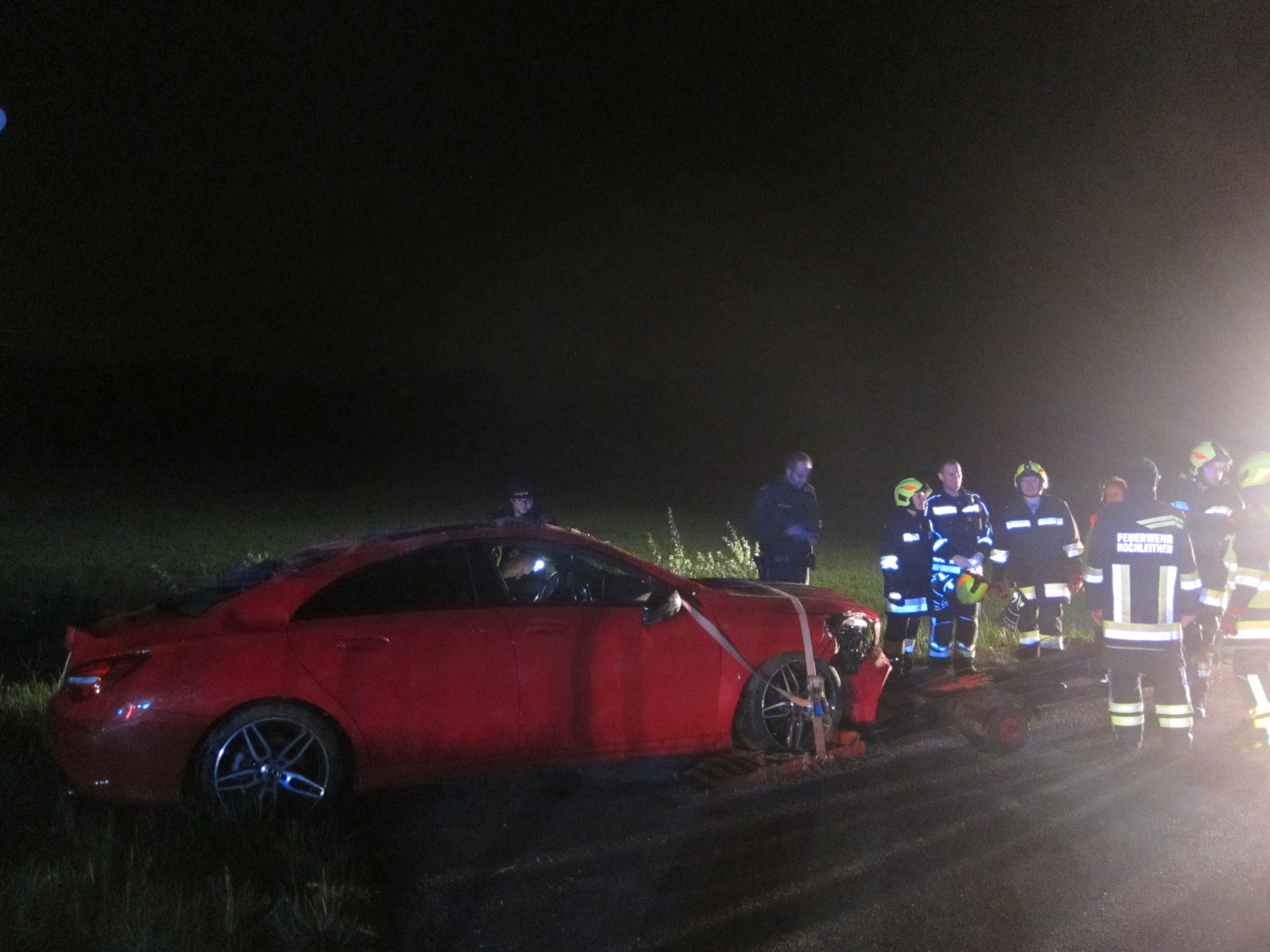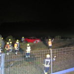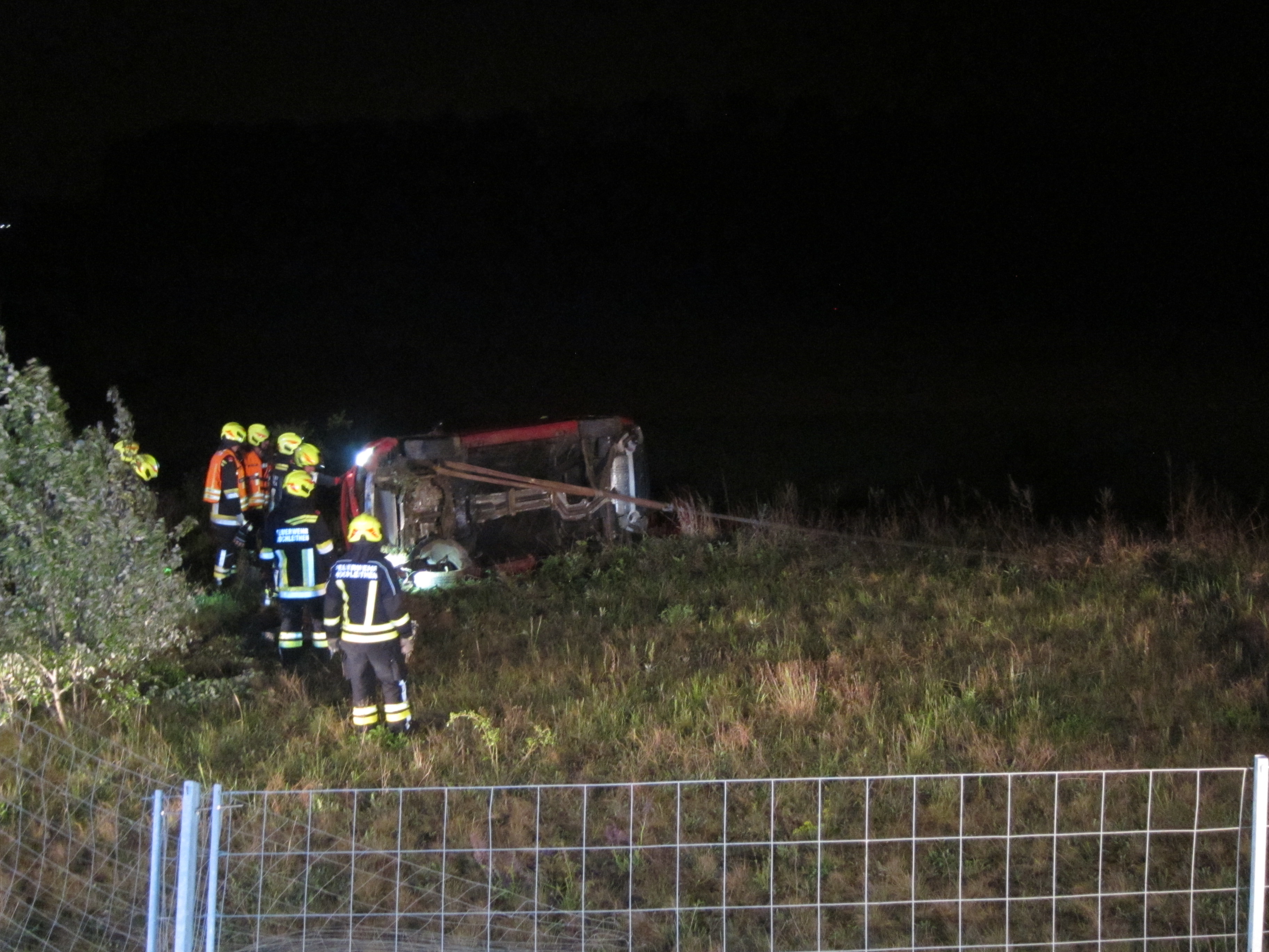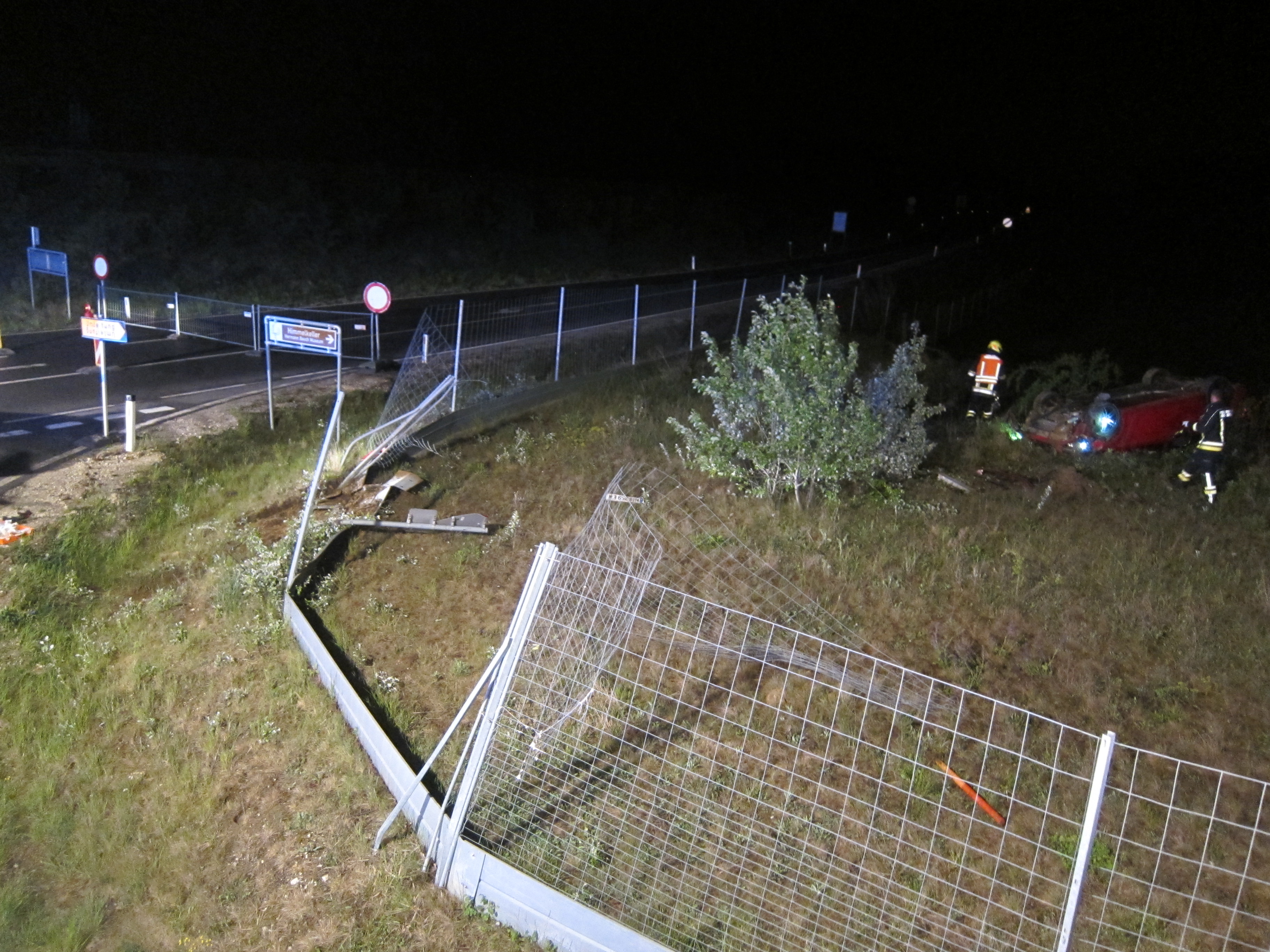 Ein PKW kam kurz vor dem gesperrten Teilstück der B7, bei der Abzweigung nach Kronberg, von der Fahrbahn ab, durchbrach einen Wildzaun und blieb nach einem Überschlag auf dem Dach liegend zum Stillstand.