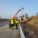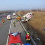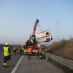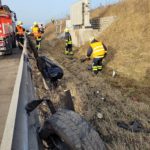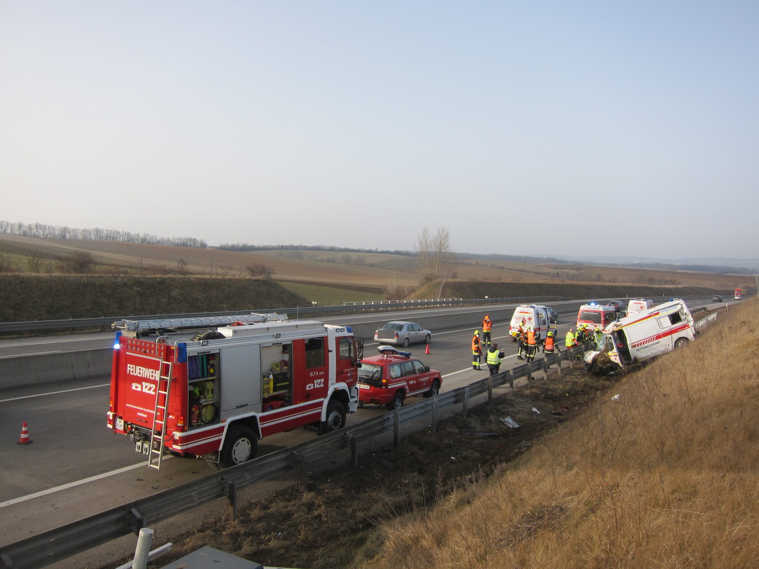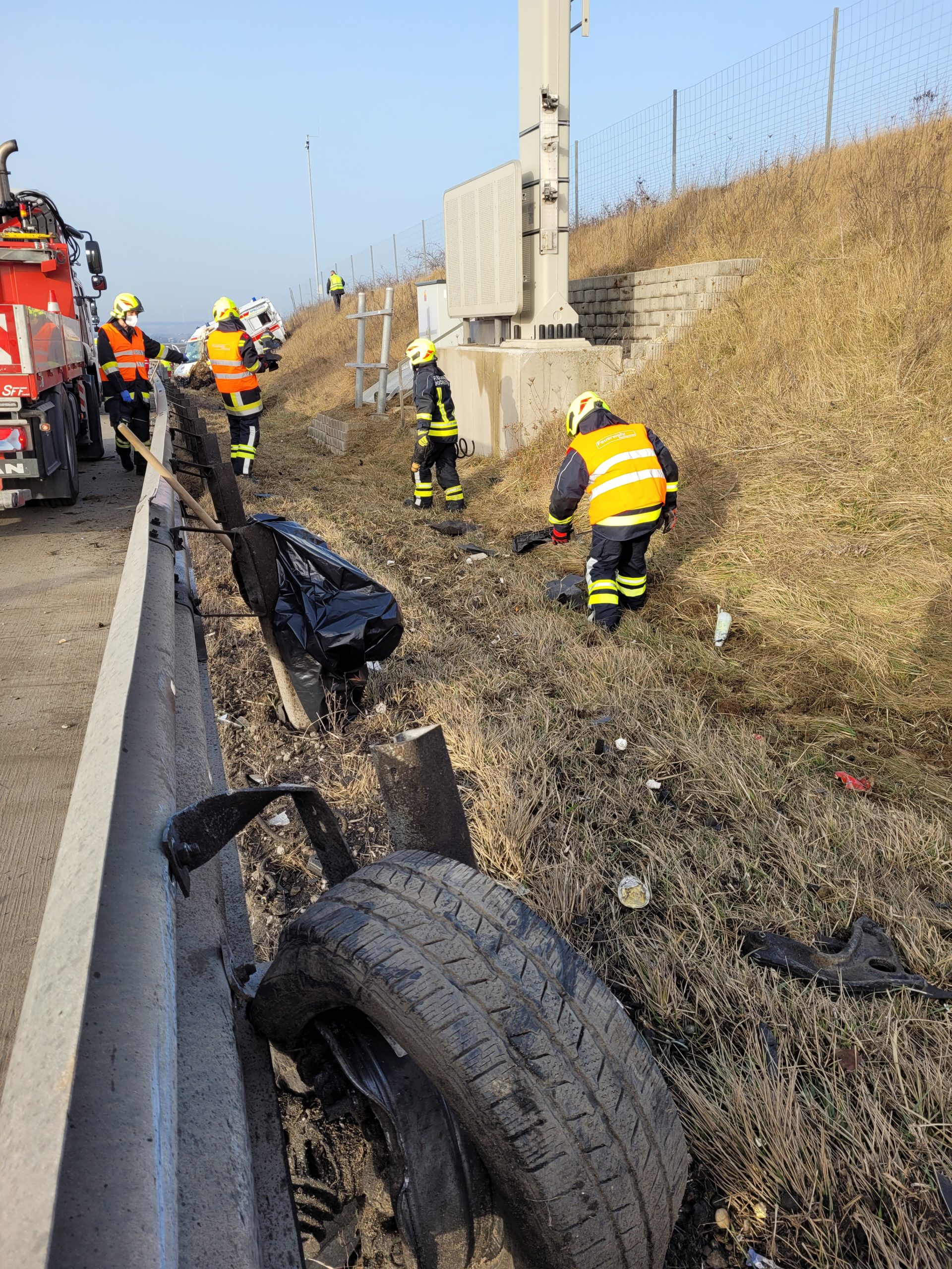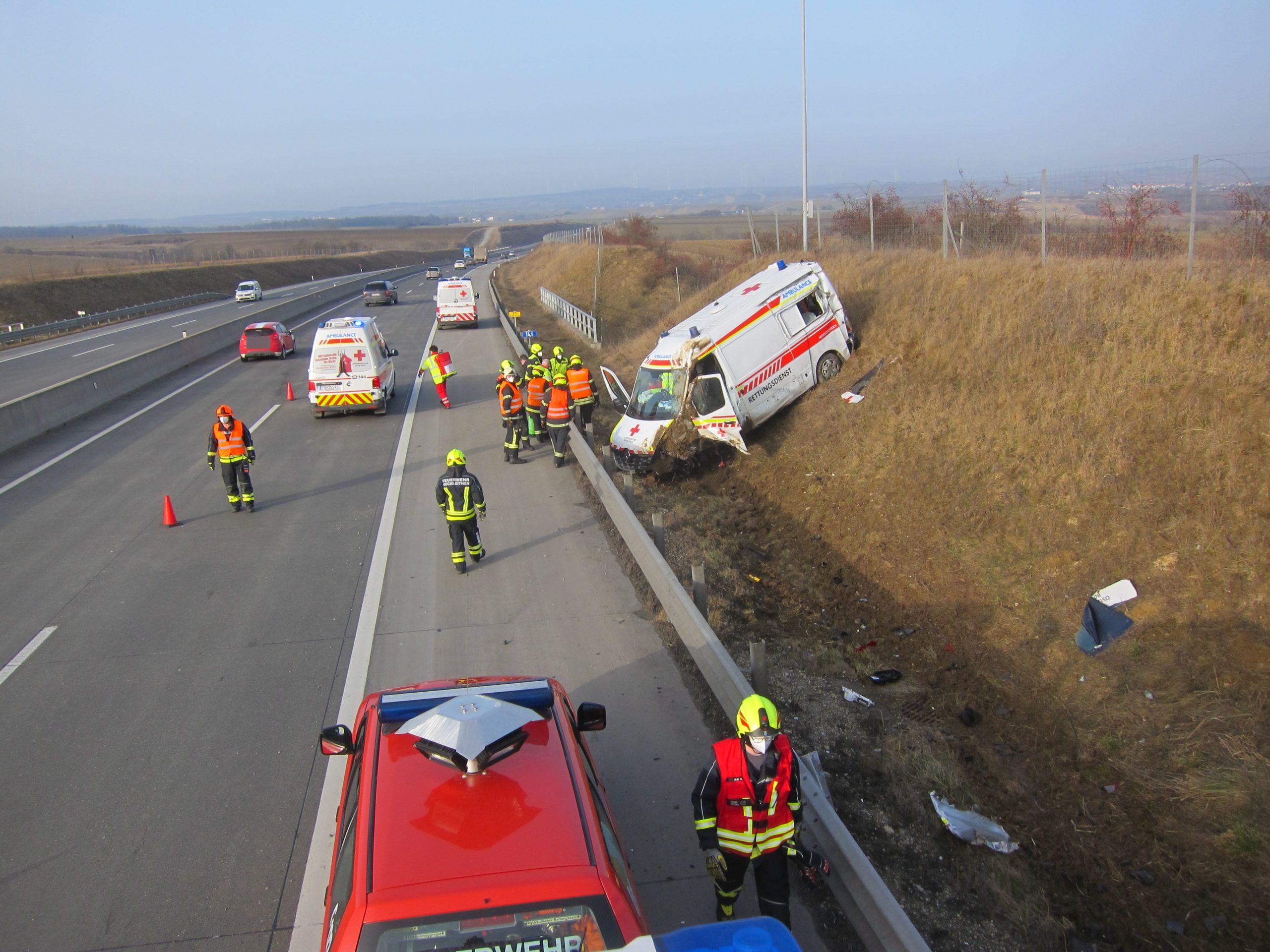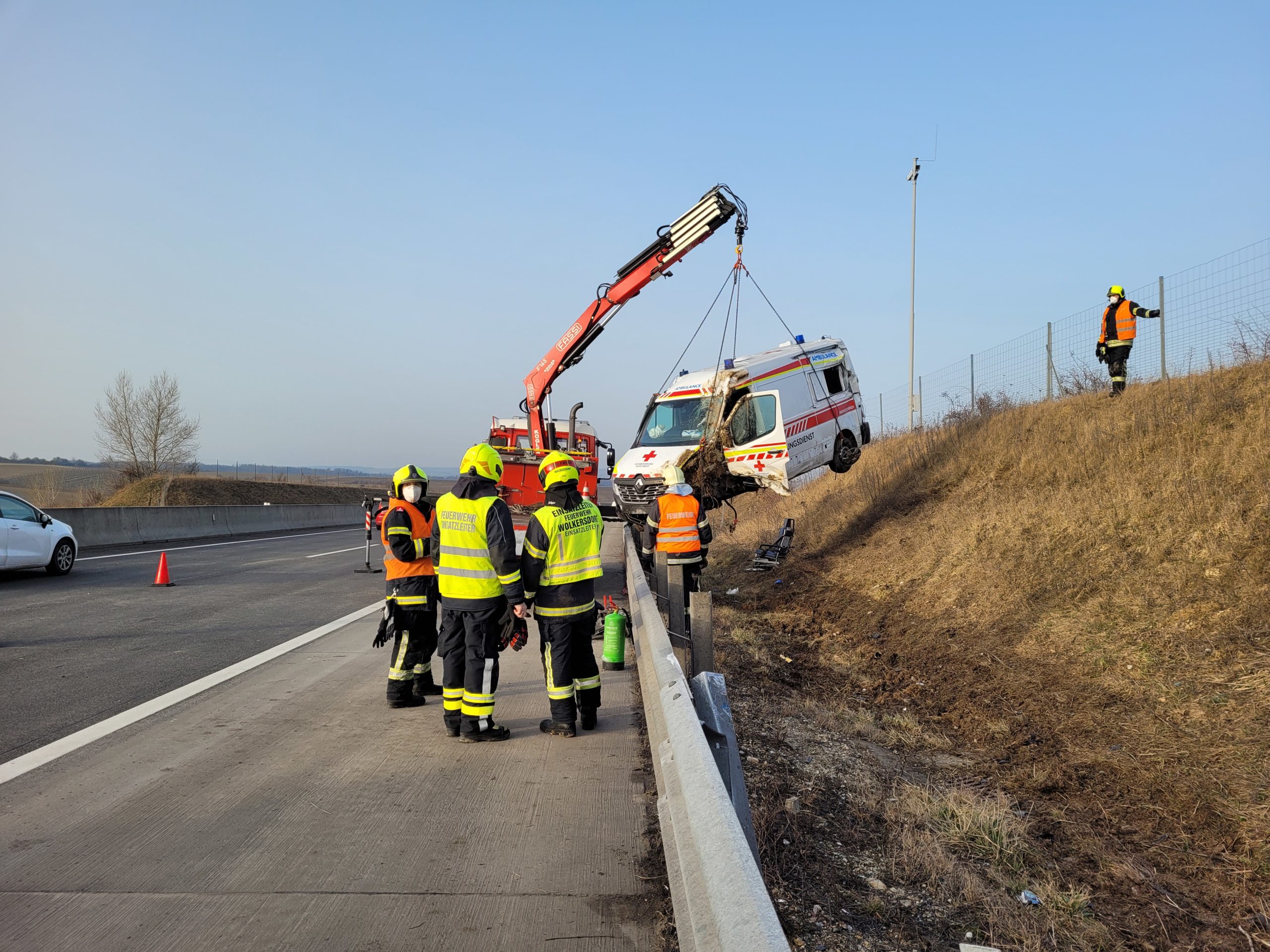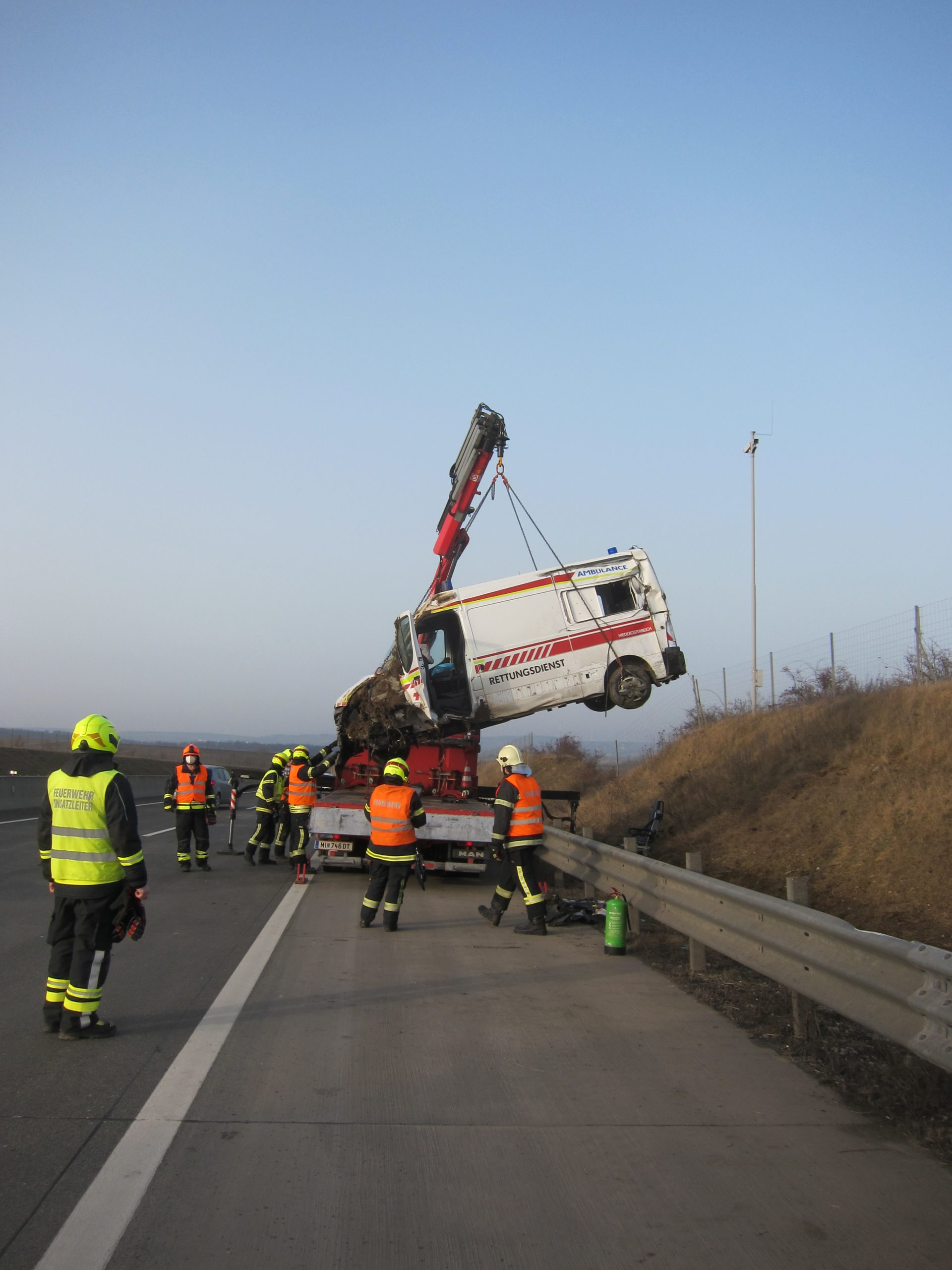 Dort eingetroffen, sicherte die Mannschaft des Vorausfahrzeugs sofort die Unfallstelle ab. Ein Rettungsfahrzeug kam aus ungeklärter Ursache von der Fahrbahn ab, schlitterte rund 30 Meter über eine Leitplanke und kam schließlich seitlich auf der Böschung zum Stillstand. Wie durch ein Wunder blieben alle vier Insassen unverletzt. Die nachfolgenden Kräfte erweiterten die Absicherung und bauten einen Brandschutz auf. Auf Anweisung der Autobahnpolizei übernahmen die Kameraden der Feuerwehr Wolkersdorf schließlich die Bergung des stark beschädigten Einsatzfahrzeugs mit dem LAST Wolkersdorf. An dieser Stelle, vielen Dank für die stets reibungslose Zusammenarbeit.