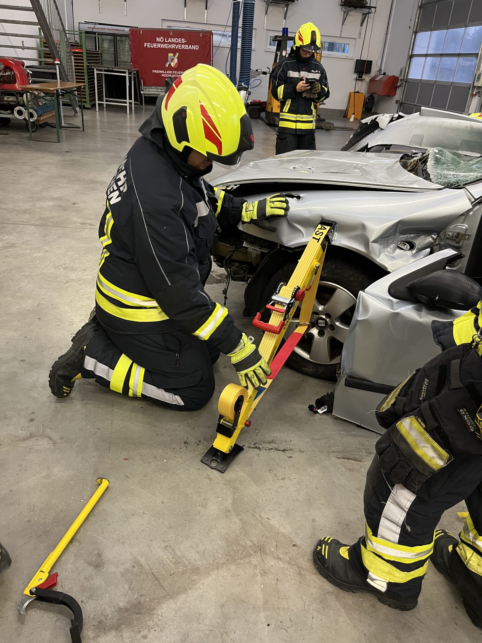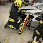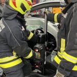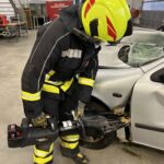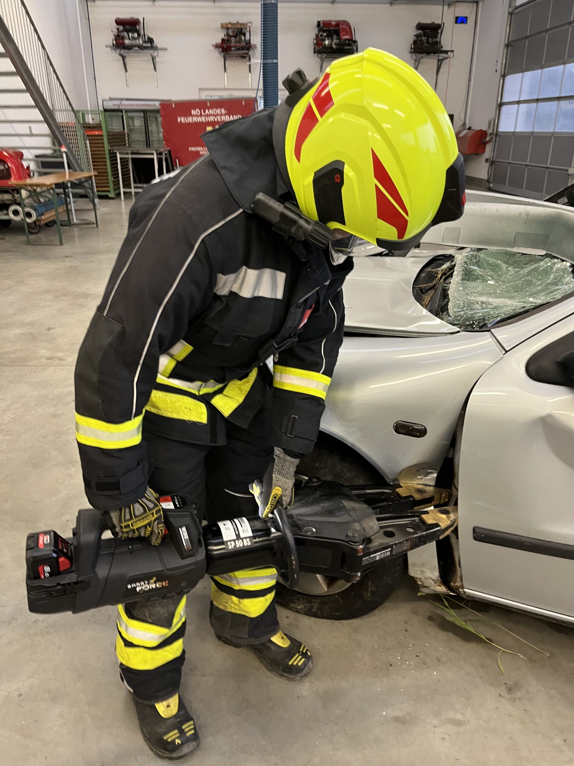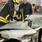 Im Anschluss an die Gerätevorstellung durften wir das erlangte Wissen auch gleich in die Praxis umsetzen, indem Schere und Spreizer an einem Übungsfahrzeug ausgetestet werden konnten.