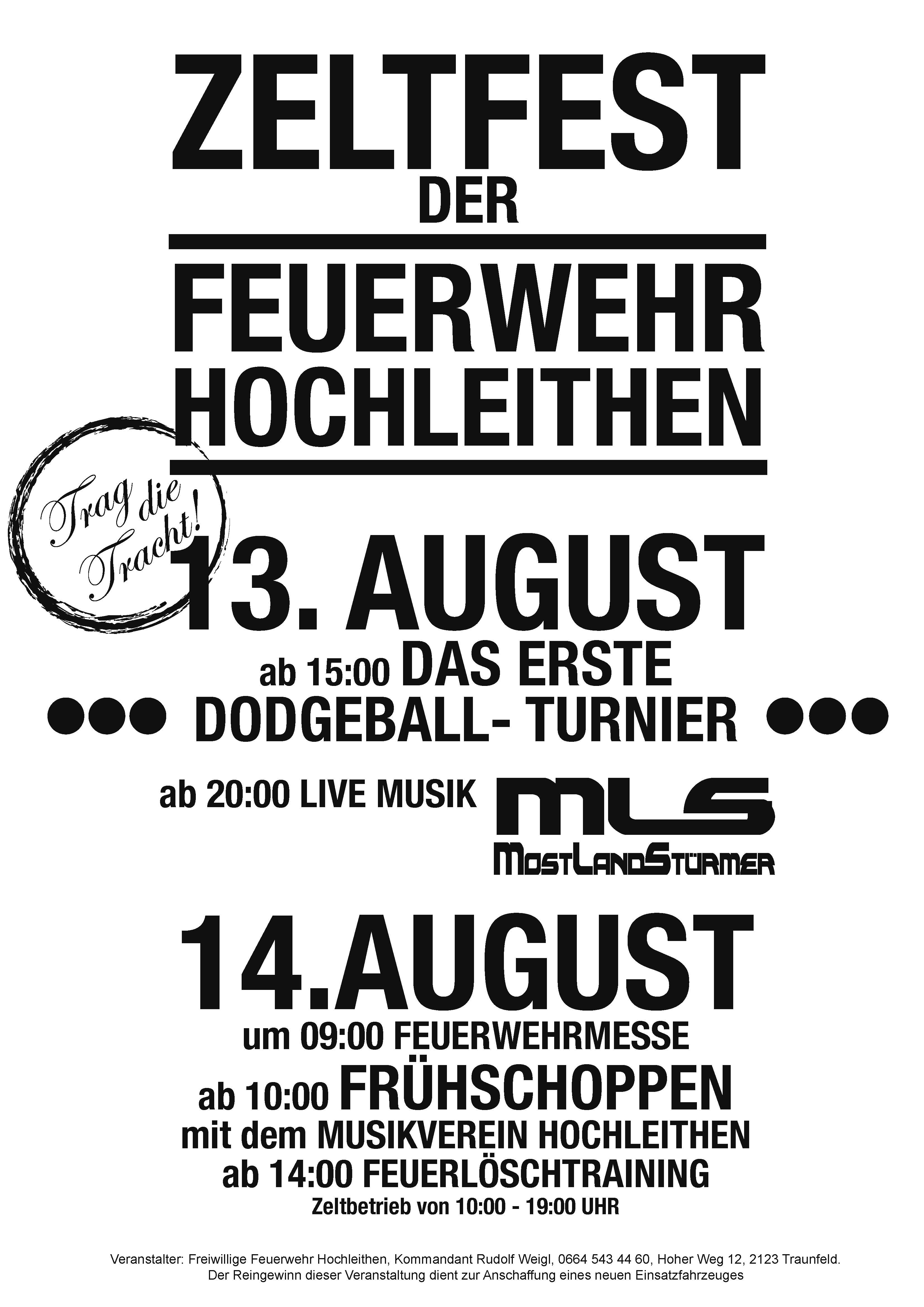 Die Freiwillige Feuerwehr Hochleithen ladet Sie herzlich zu unserem alljährlichen Feuerwehr Fest ein.