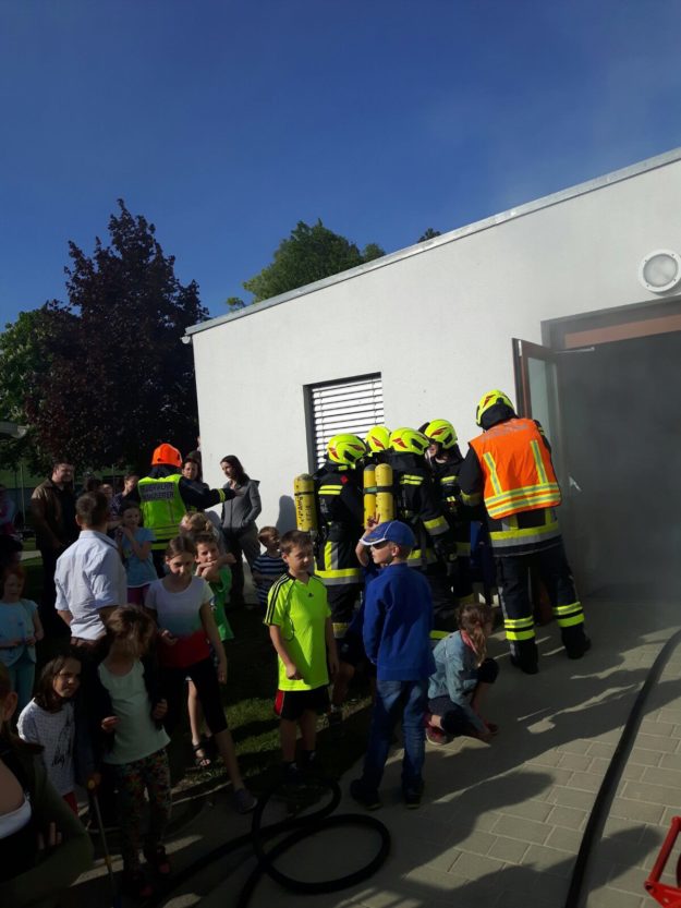 Übungsannahme an diesem sonnigen Freitag war ein Brandeinsatz im Kindergarten Hochleithen. Um das Szenario so realistisch wie möglich zu gestalten, wurden die Räumlichkeiten im Vorfeld mit einer Nebelmaschine verraucht.