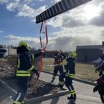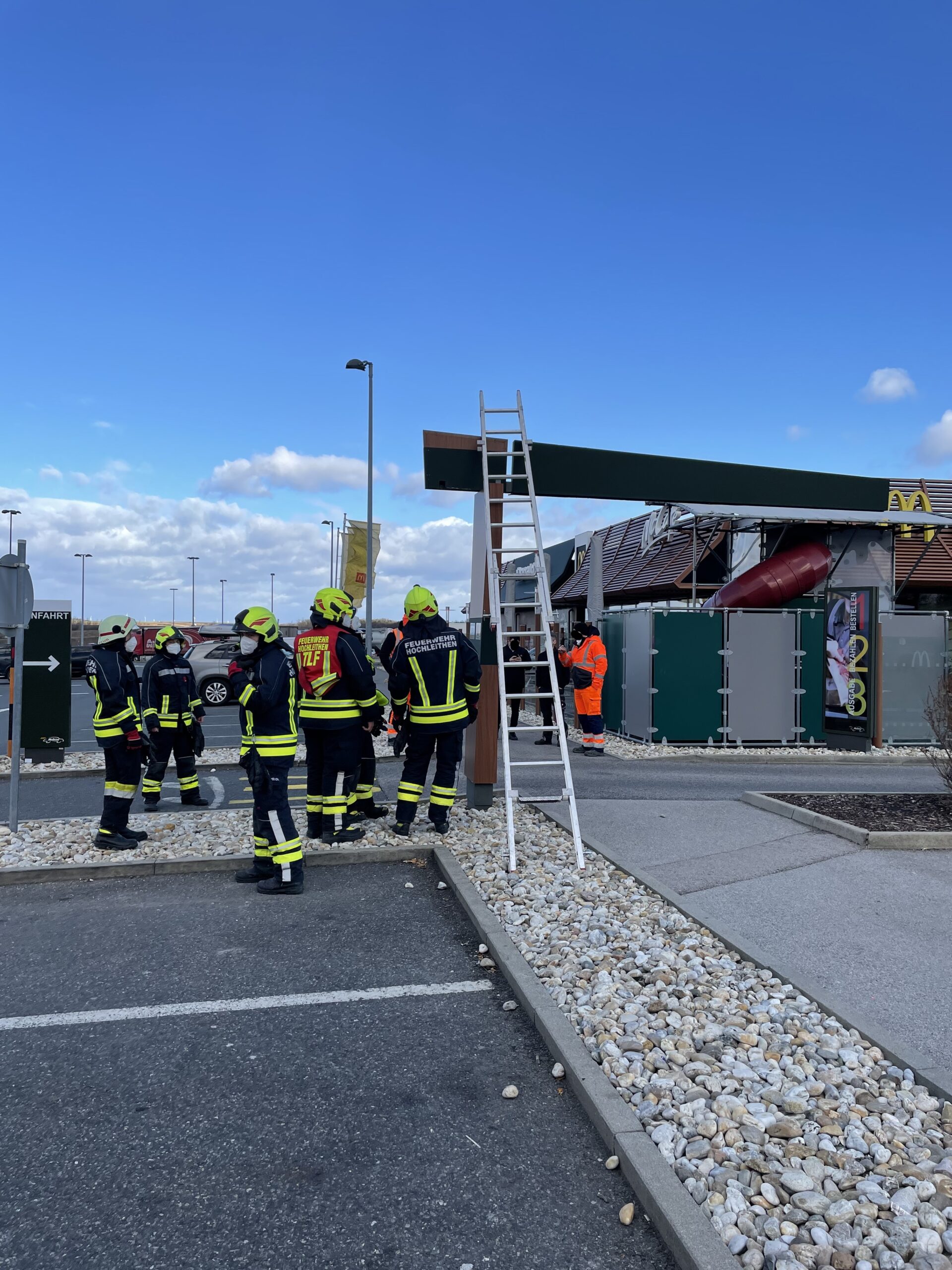 Zur Mittagszeit rückten wir mit VRF, RLF und TLF zu zwei Sturmschäden aus. Mithilfe von Zurrgurten fixierte die Mannschaft des Tanklöschfahrzeugs den durch den Sturm gelösten Höhenanzeiger, welcher sich vor dem McDrive der Raststation Hochleithen befindet.