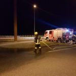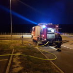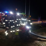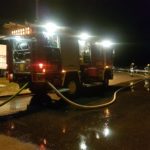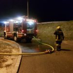Im Anschluss wurde mit der eigentlichen Übung begonnen. Dabei wurde ein fiktiver Brand auf dem LKW-Parkplatz simuliert. Das neue HLF 1 begann sogleich mit der Löschwasserspeisung der Hydranten. Die Mannschaften des RLFs sowie TLFs rüsteten sich, je nach Besatzung, bereits bei der Anfahrt mit Atemschutz aus. Anschließend starteten sie mit der Brandbekämpfung. Nachdem „Brand aus“ gegeben wurde, fand noch eine kurze Übungsnachbesprechung statt.