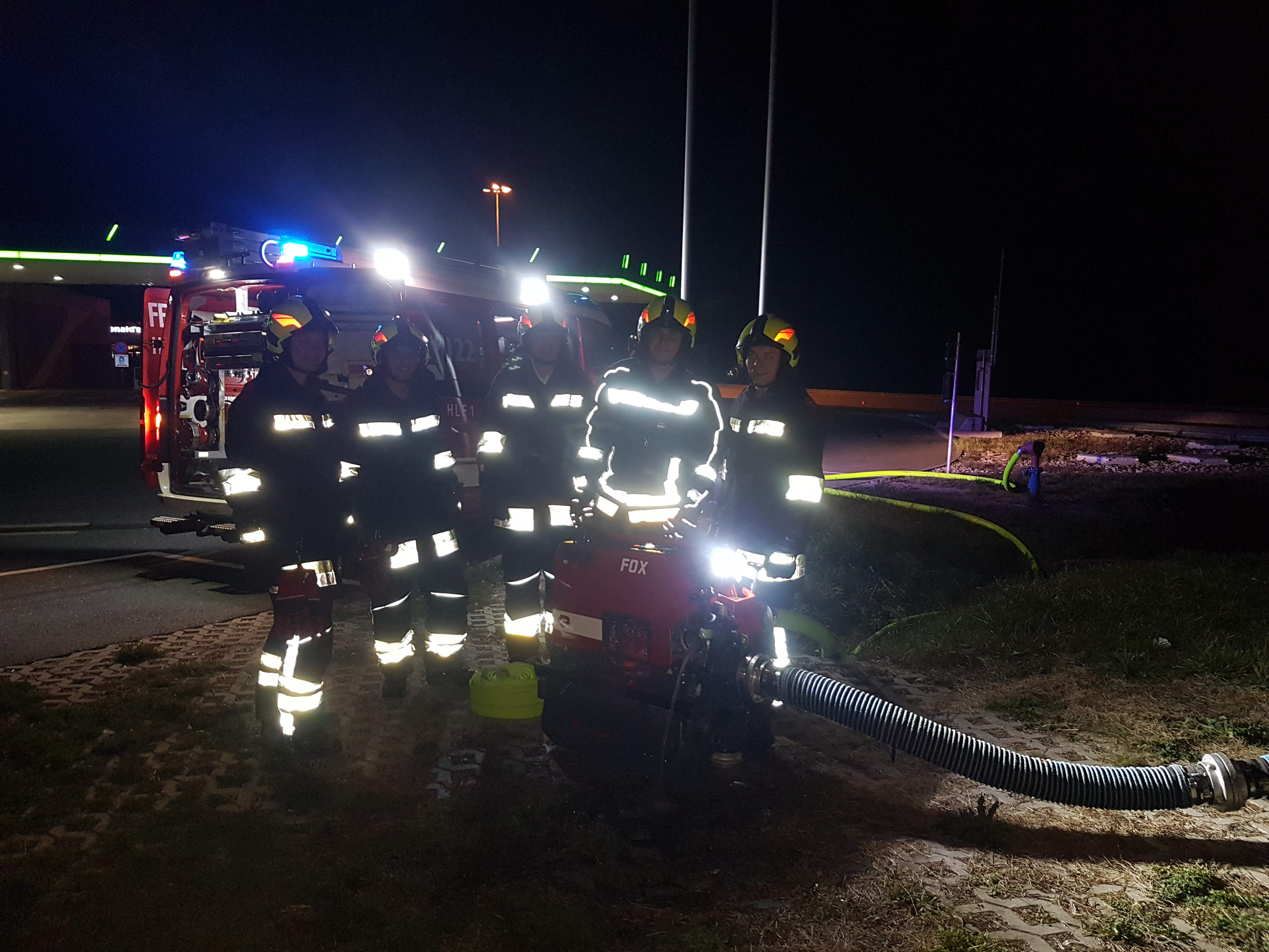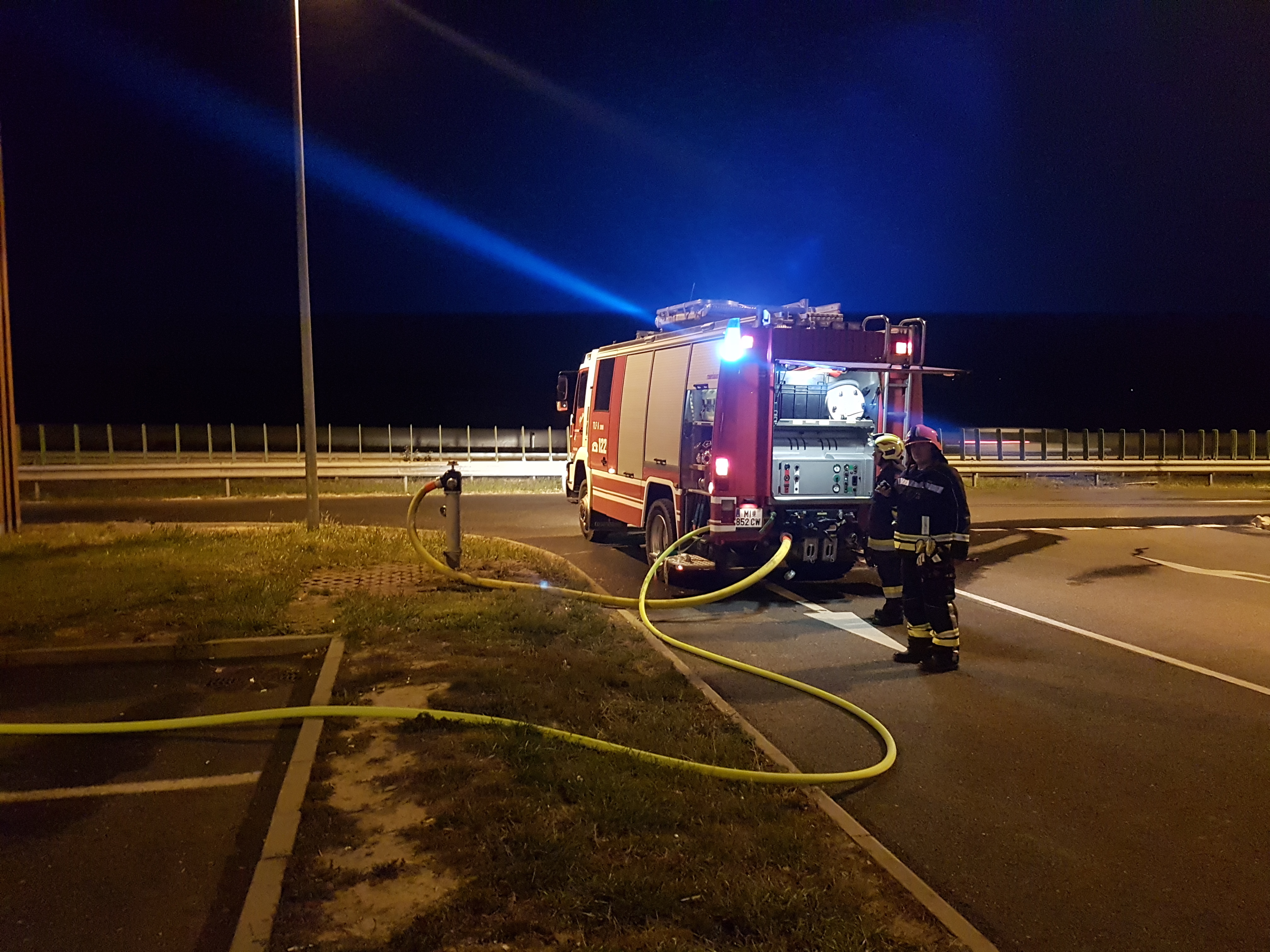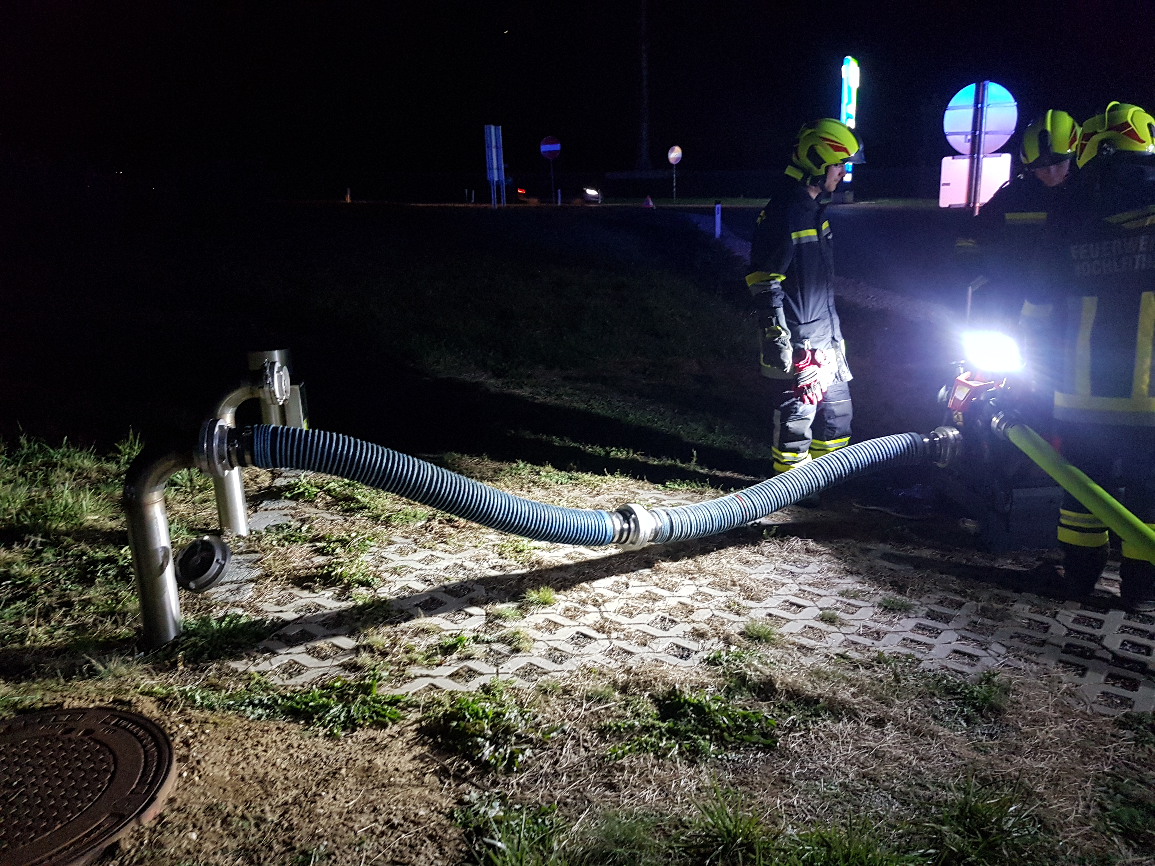 Die herbstliche Zugsübung stand ganz im Zeichen der Raststation. Vor der eigentlichen Einsatzübung wurden die Besonderheiten der Örtlichkeit besichtigt. Im Speziellen wurde das Hydrantennetz der Raststation inspiziert. Dieses muss im Zuge eines Einsatzes aus einem unterirdischen Löschwasserbehälter gespeist werden, welcher sich neben der Tankstelle befindet. Dabei nimmt das neue Hilfeleistungsfahrzeug 1 eine essenzielle Rolle ein, da es für diese Aufgabe zuständig ist.