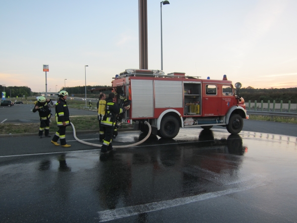 Die Schwierigkeit besteht darin, dass es auf der Raststation kein befülltes Hydrantennetz gibt und dieses vor Ort mittels Tragkraftspritze aus dem unterirdischen Wassertank unter Druck gesetzt werden muss. Dadurch war die Wasserversorgung für die Feuerwehrfahrzeuge gegeben und in weiterer Folge konnte eine Löschleitung aufgebaut werden.