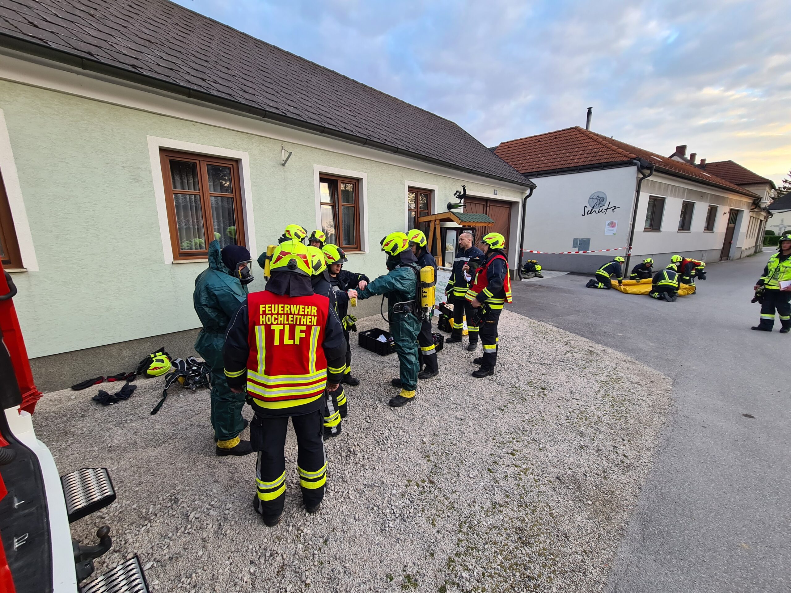 Anhand der dargestellten Lage wurde das richtige Arbeiten mit Atemschutzgerät und die korrekte Durchführung der Personenrettung im Schadstoffeinsatz, das Abdichten von Leckagen sowie auch die korrekte Absicherung der Unfallstelle und die Absicherung von angrenzenden Gebäuden beübt. Der Aufbau eines Dekontaminationsplatzes, das richtige Anlegen der Schutzstufe 2 Anzüge wie auch die Durchführung der korrekten Dekontamination von Einsatzkräften und verunfallten Personen waren ein weiteres Lernziel dieser Übung.