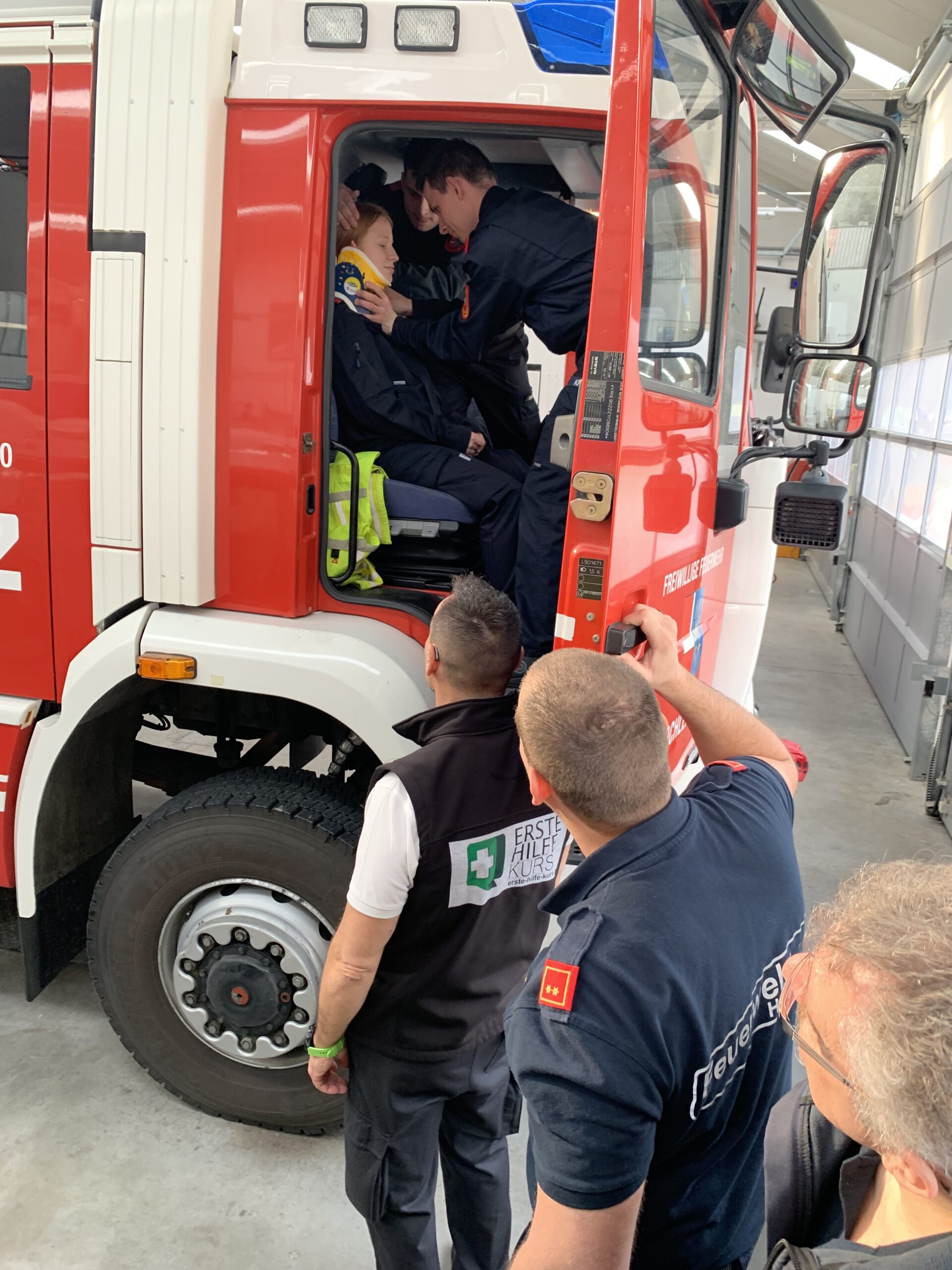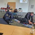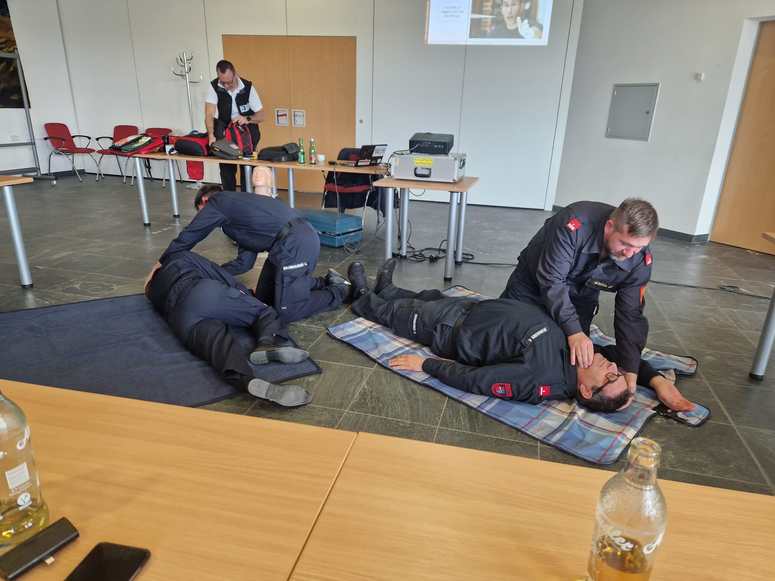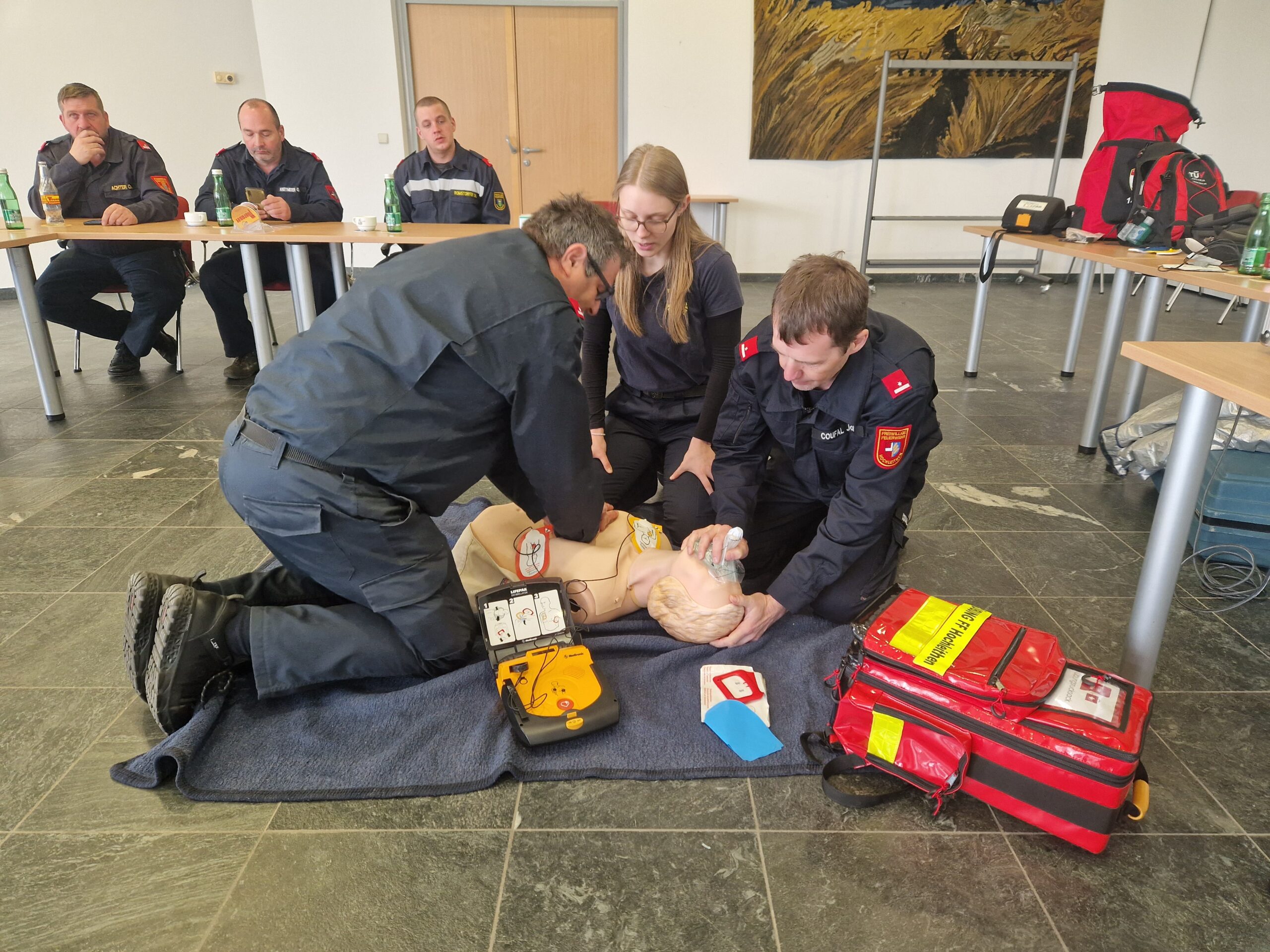 Mit speziellem Augenmerk auf die Anforderungen einer Feuerwehr im Einsatz wurde neben der richtigen Reanimation und Handhabung unseres Defibrillators sowie der Rettung von Personen aus Fahrzeugen auch das Anlegen von Druckverbänden geübt und vertieft.