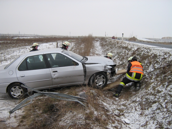 Ein PKW kam ins Schleudern, durchstieß den Wildschutzzaun und blieb im Graben stehen. Nach Absicherung und Sperre der B7 wurde der PKW mittels Seilwinde geborgen. Die B7 konnte rasch wieder freigegeben werden. © Feuerwehr Hochleithen